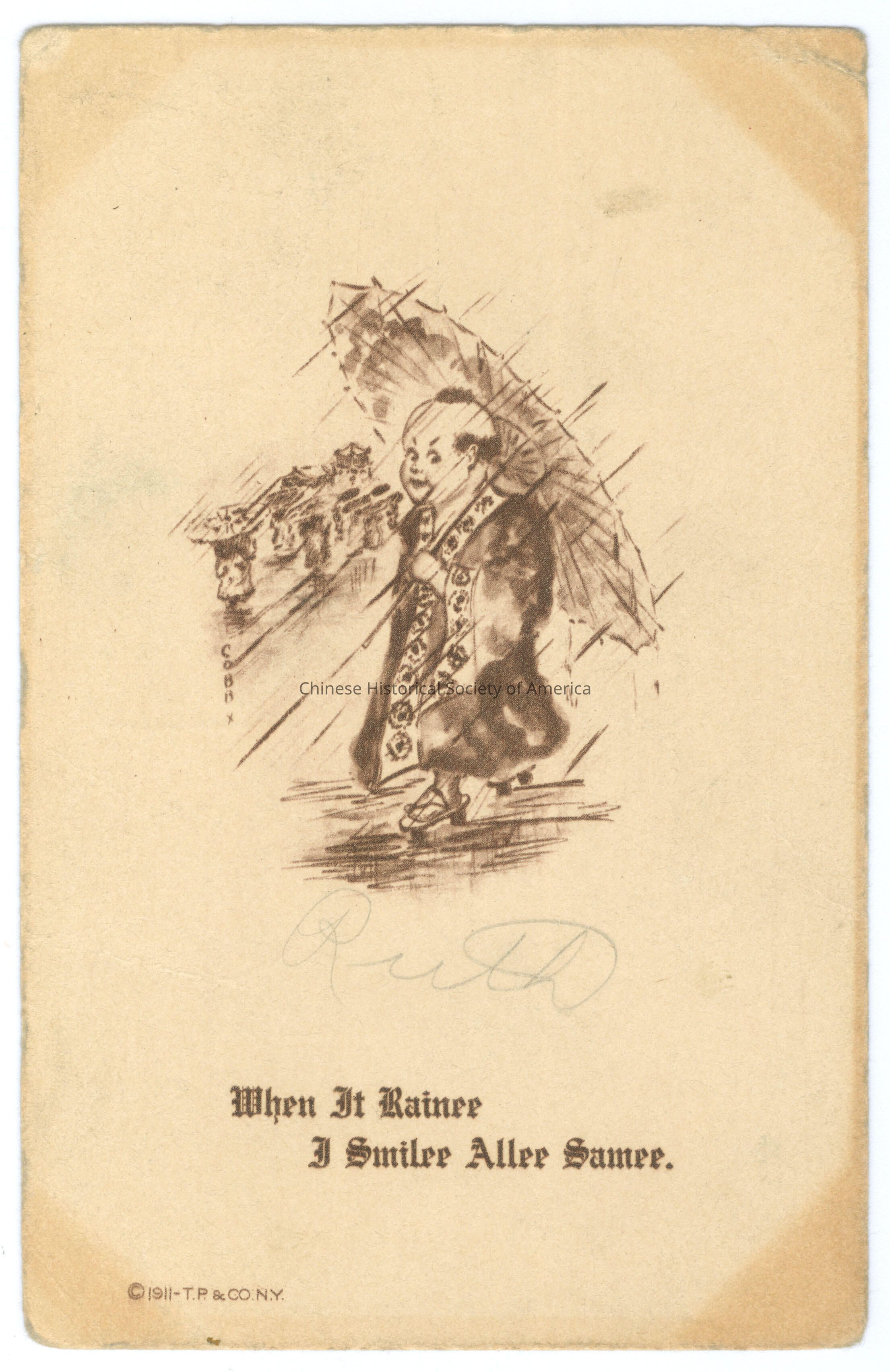 See CHSA-05021-05024. Front: Caption: "When It Rainee I Smilee Allee Samee." Message: "Ruth", handwritten in pencil. "1911-T.P. & CO., N.Y." Back: "Series 795." Old Accession #: D)-