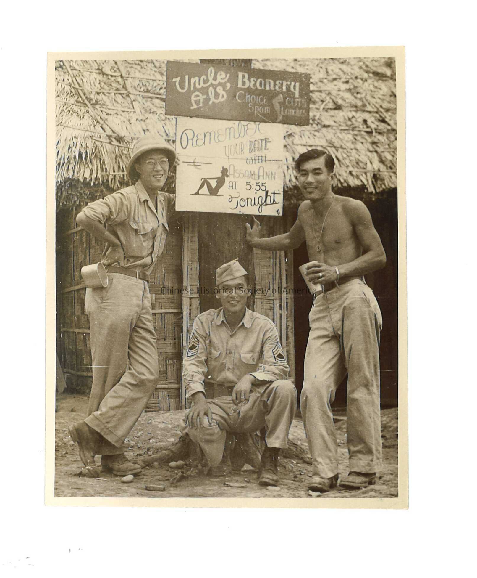 Black and white photo of William Hoy in a military uniform and army friends next to lunch sign. 2 copies.