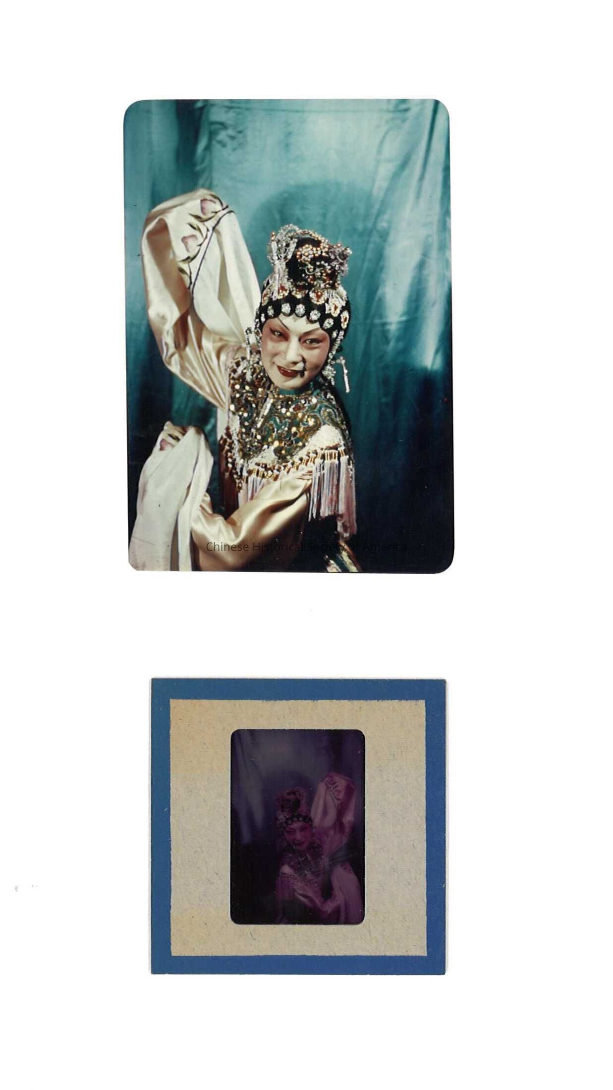 Blue-green background with a woman in a 2 piece dress costume, read flowers, and jewels In her hair. She plays the drums posing for the camera. B: negative