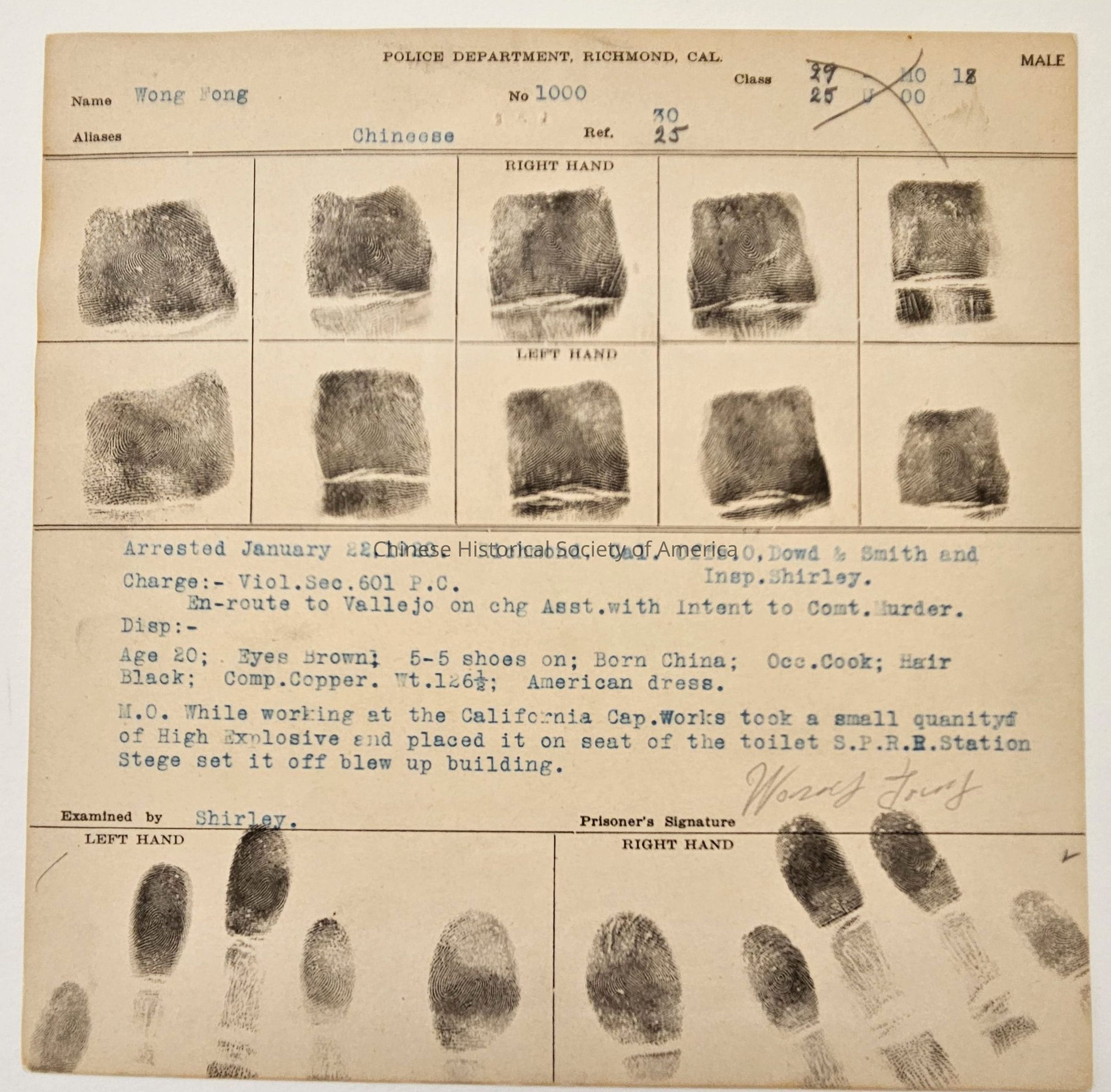 Arrest record with finger prints; photograph of Wong Fong on the backside.