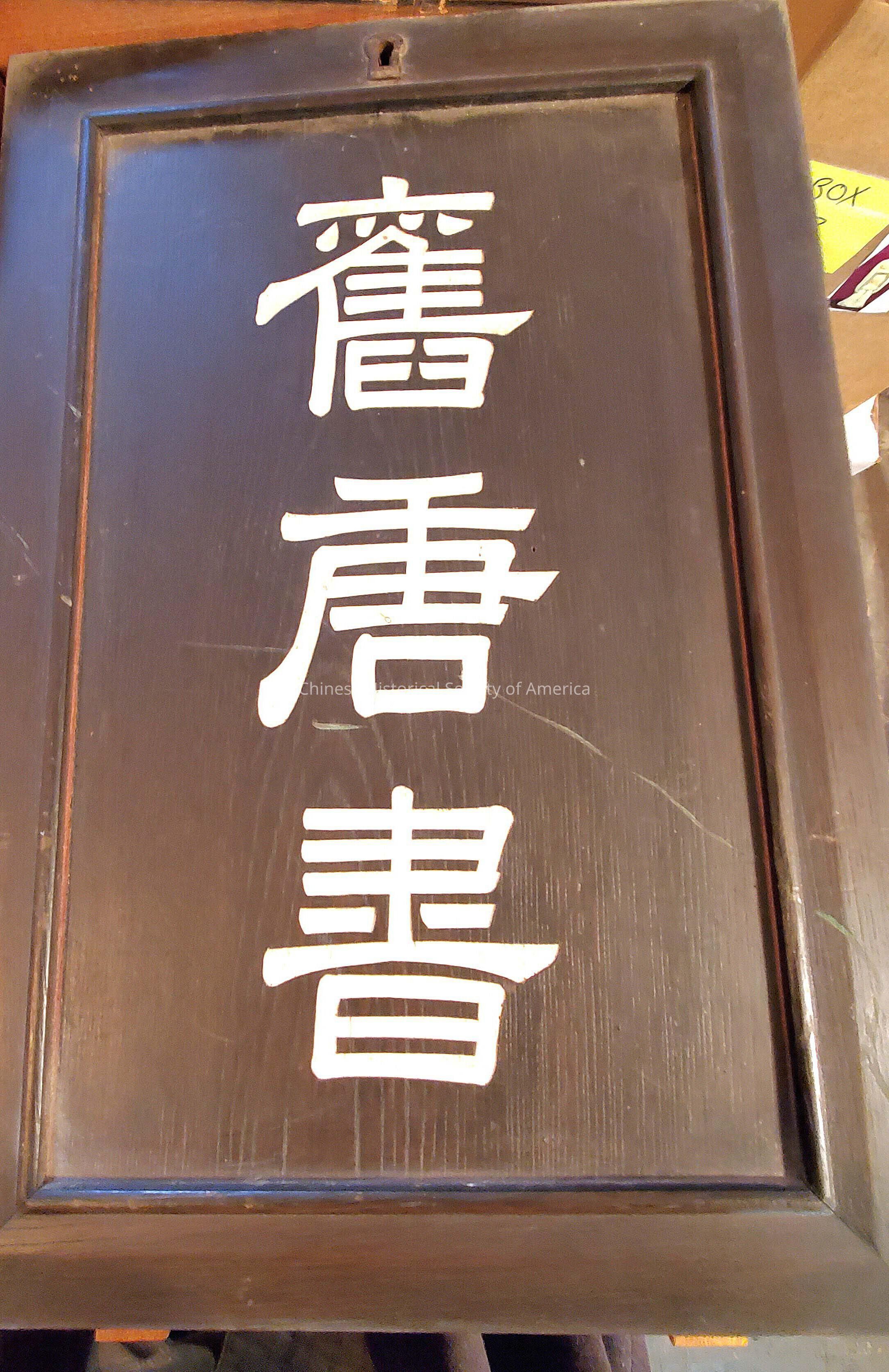 Wooden Liangshu box holds dynastic record books written in Chinese. Translation: Old Book of TangContext