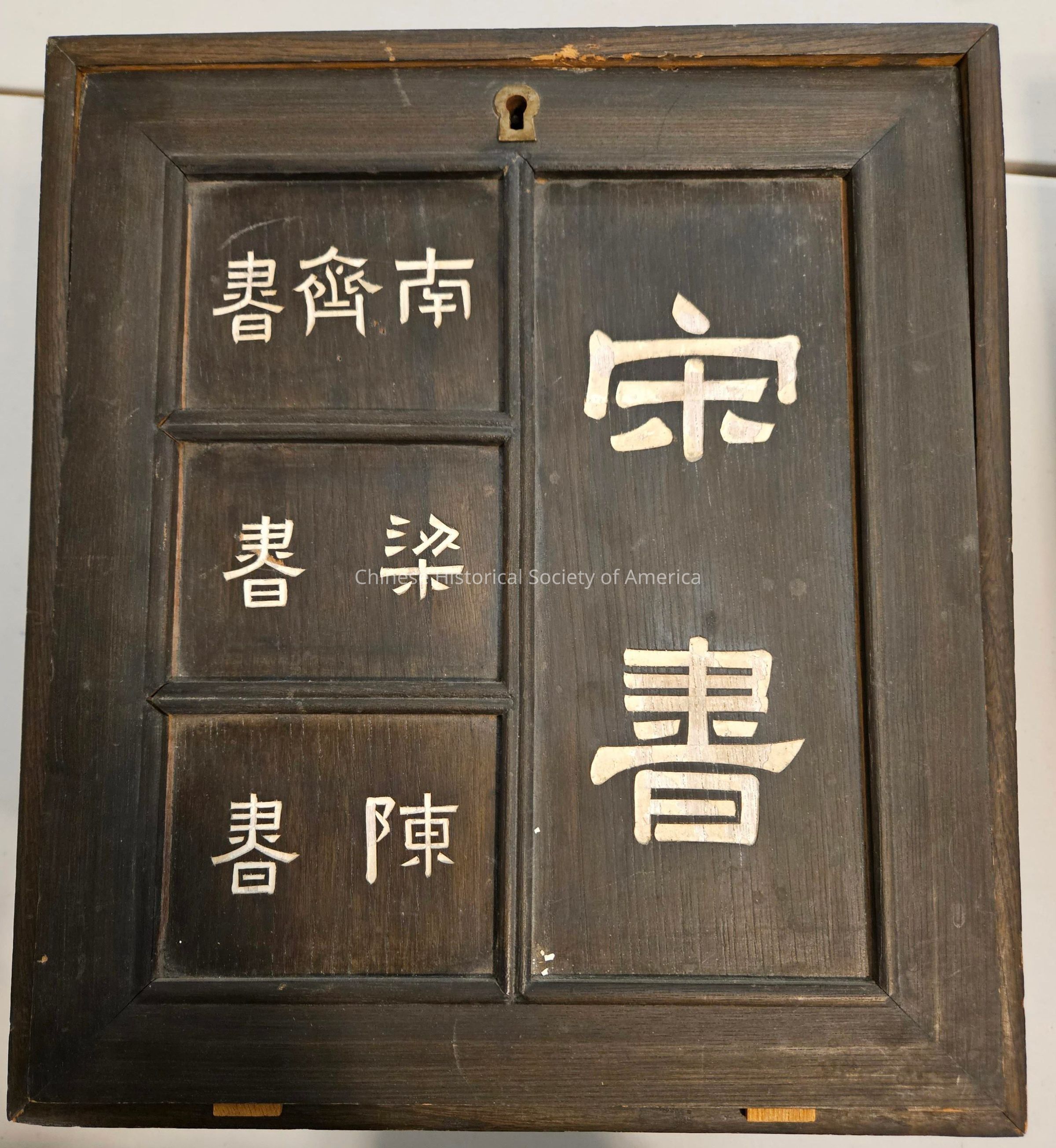 Wooden Liangshu box holds dynastic record books written in Chinese.Dimensions