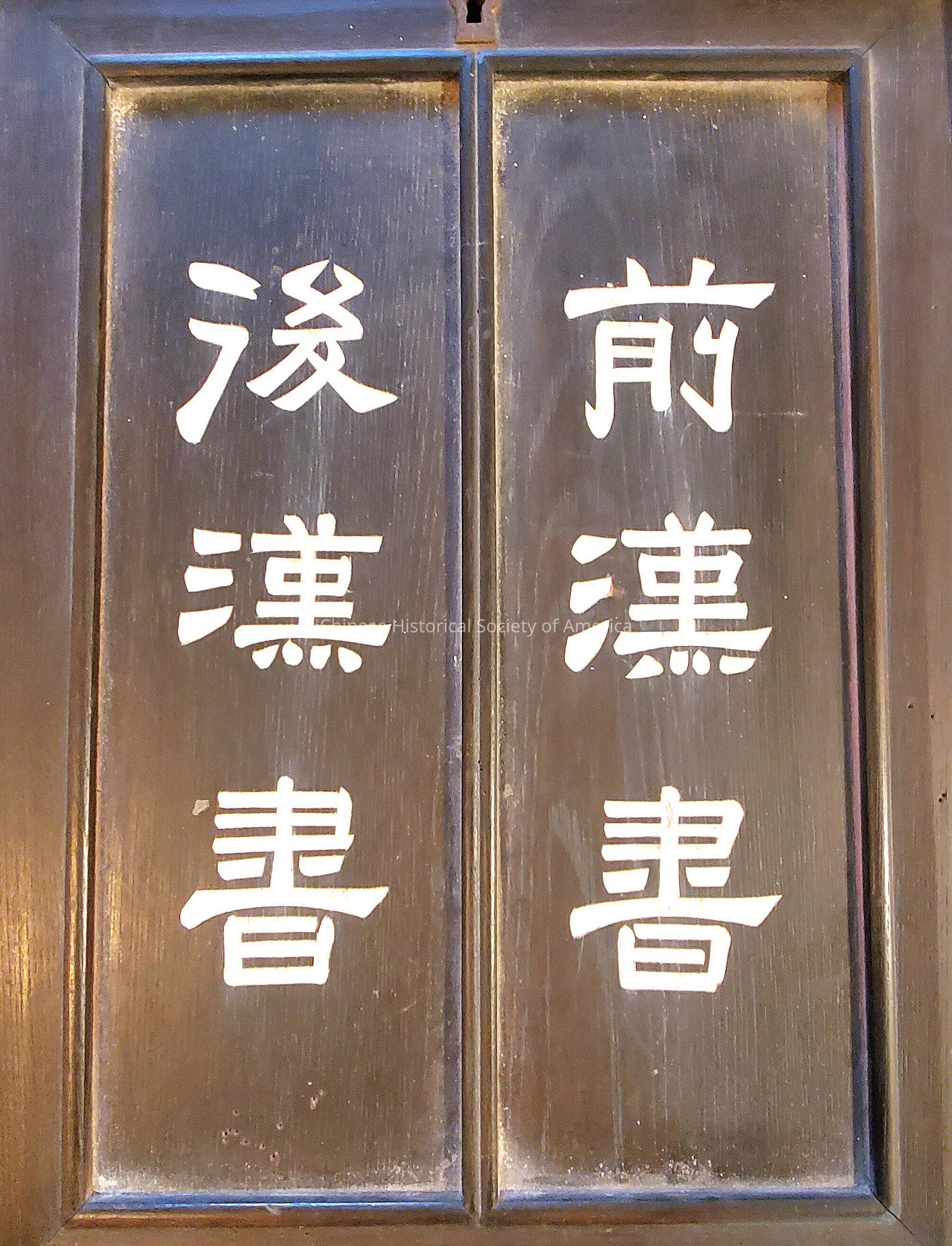 Wooden Liangshu box holds dynastic record books written in Chinese. Translation: Left-Book of Later Han; Right side: Book of HanContext