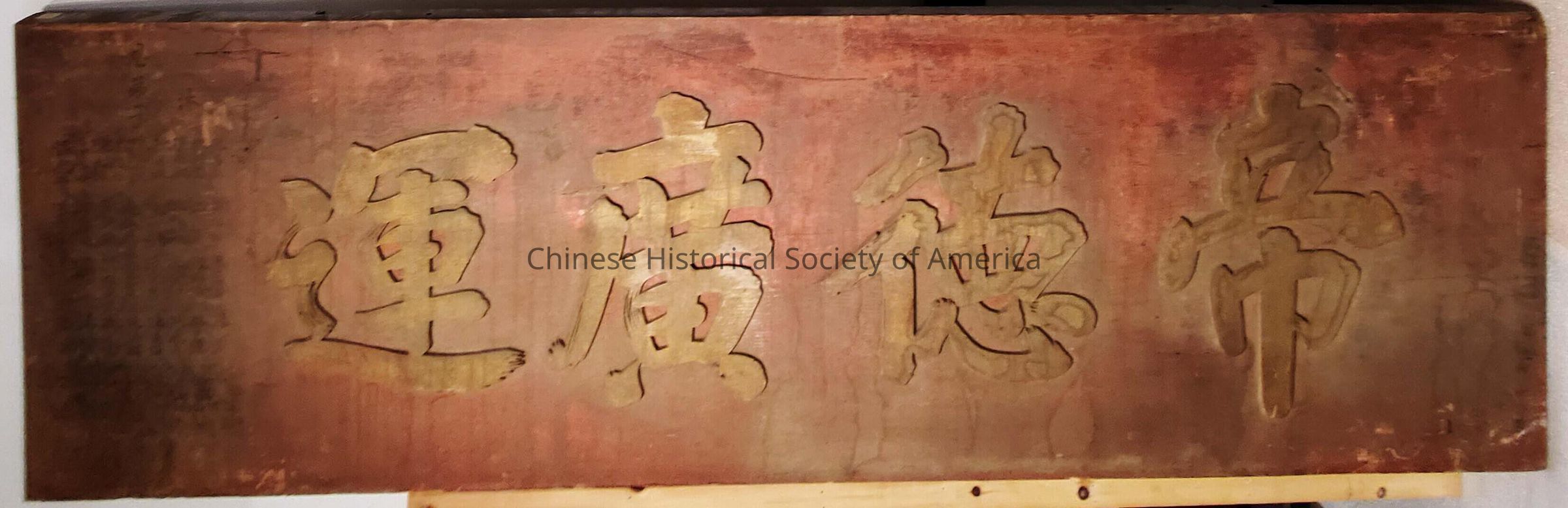 Horizontal wood sign plaque with 4 large raised Chinese characters and several lines of smaller Chinese characters, gold characters, red field.Dimensions