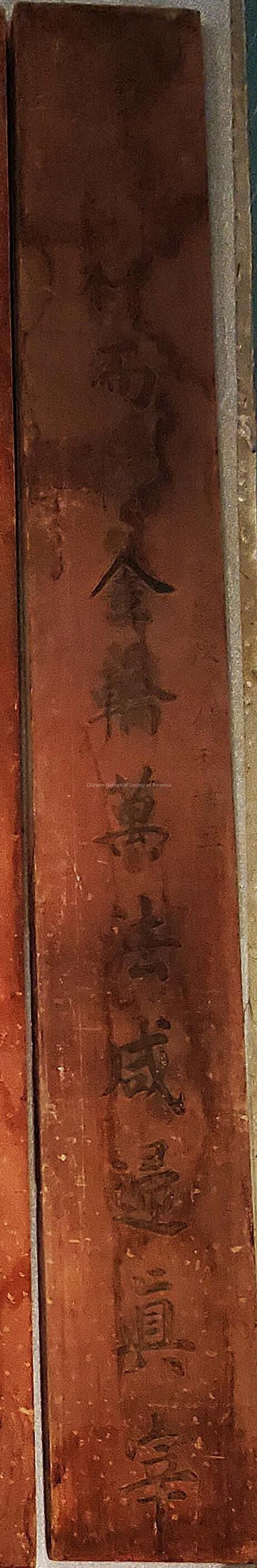 Wood plaque signs with 13 large engraved Chinese characters and smaller Chinese characters at left and right edges; characters form a couplet - 1 pair