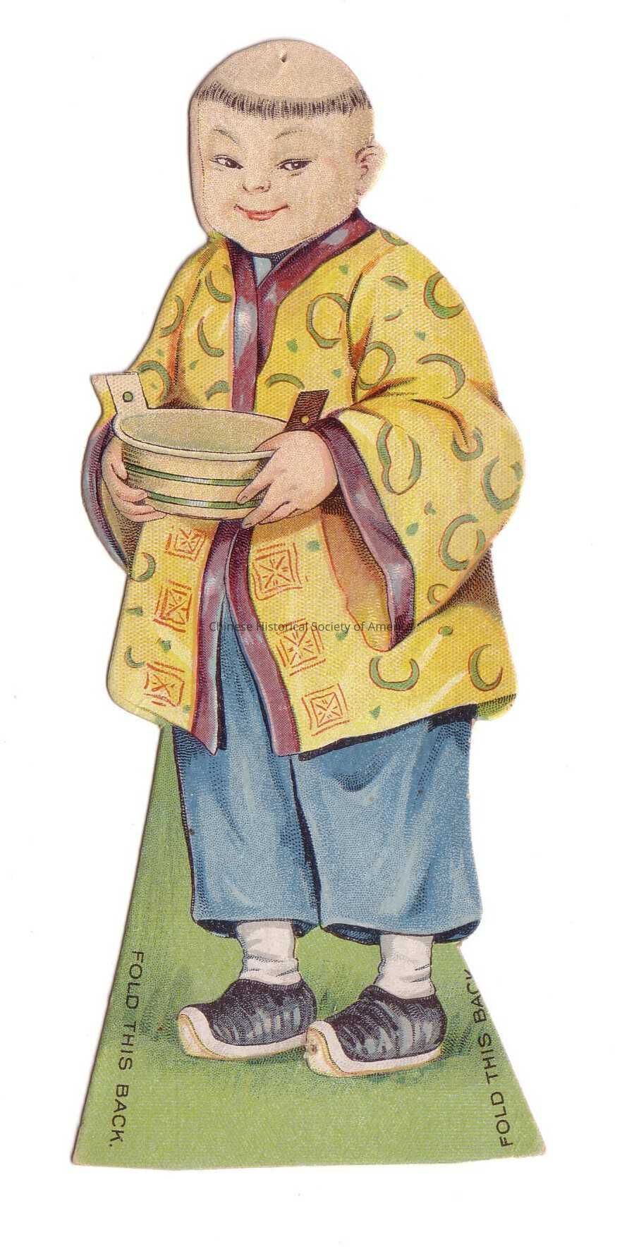 Front: A Chinese boy with a crowning hairstyle is wearing black shoes, white socks, blue pants, and a yellow robe with blue cresent shape design. He is standing on a green background with a bowl in his hand. On the bottom right and left hand corners are the following words "Fold This Back" which changes the shape of the tradecard into a 3D design.