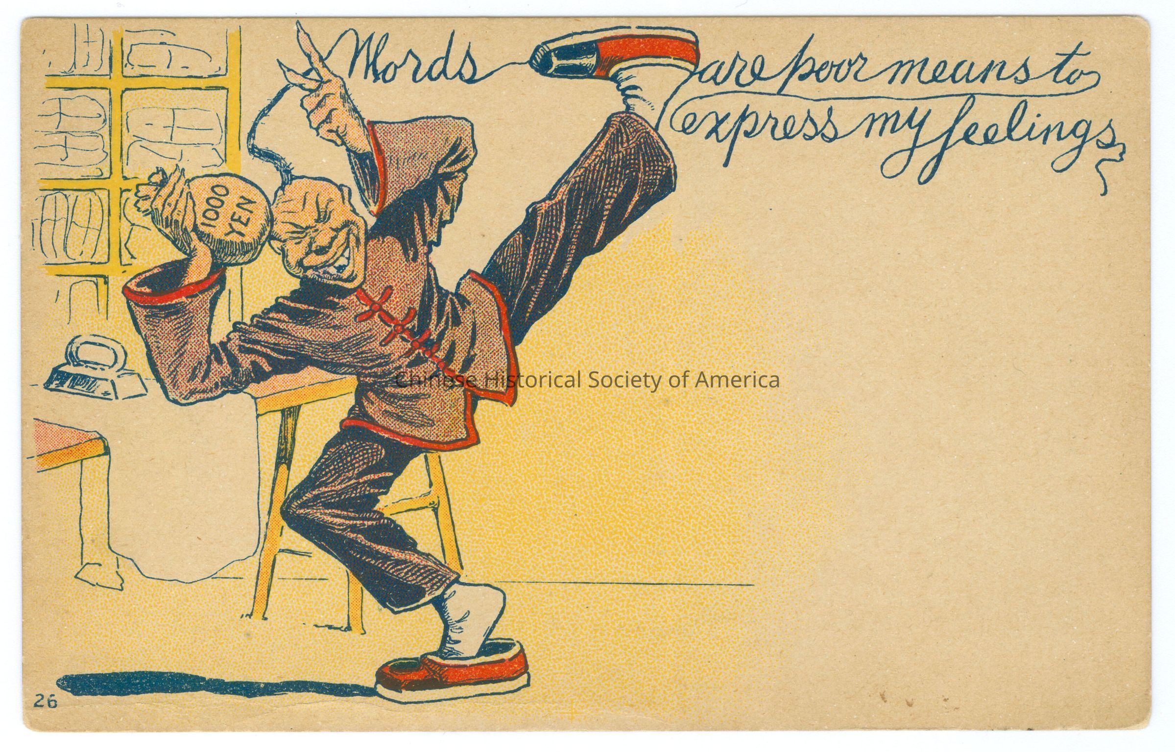 CHSA-04992 A-B. Color. Illus. Caricatures; Laundry: A-B: A Chinese man wearing traditional clothing is dancing with one foot in the air, he is holding a bag of "yen" with a queue and slanted eyes, behind him are shelves of laundry and an iron.