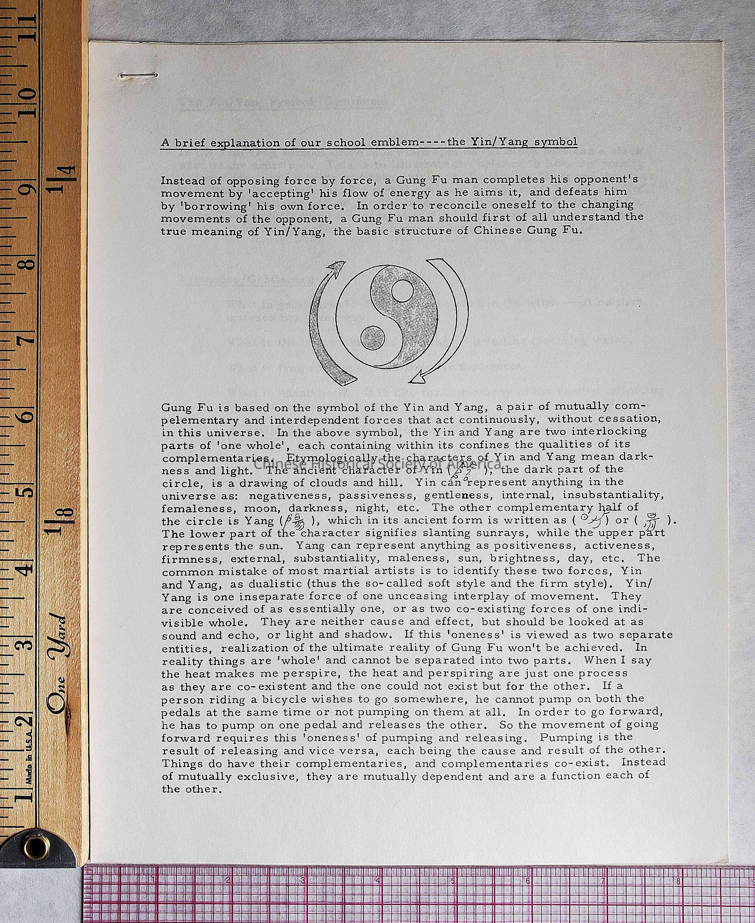 Transcription of first paragraph: Instead of opposing force by force, a Gung Fu man completes his opponent's movement by 'accepting' his flow of energy as he aims it, and defeats him by 'borrowing' his own force. In order to reconcile oneself to the changing movements of the opponent, a Gung Fu man should first of all understand the true meaning of Yin/Yang, the basic structure of Chinese Gung Fu. 5 pagesDimensions