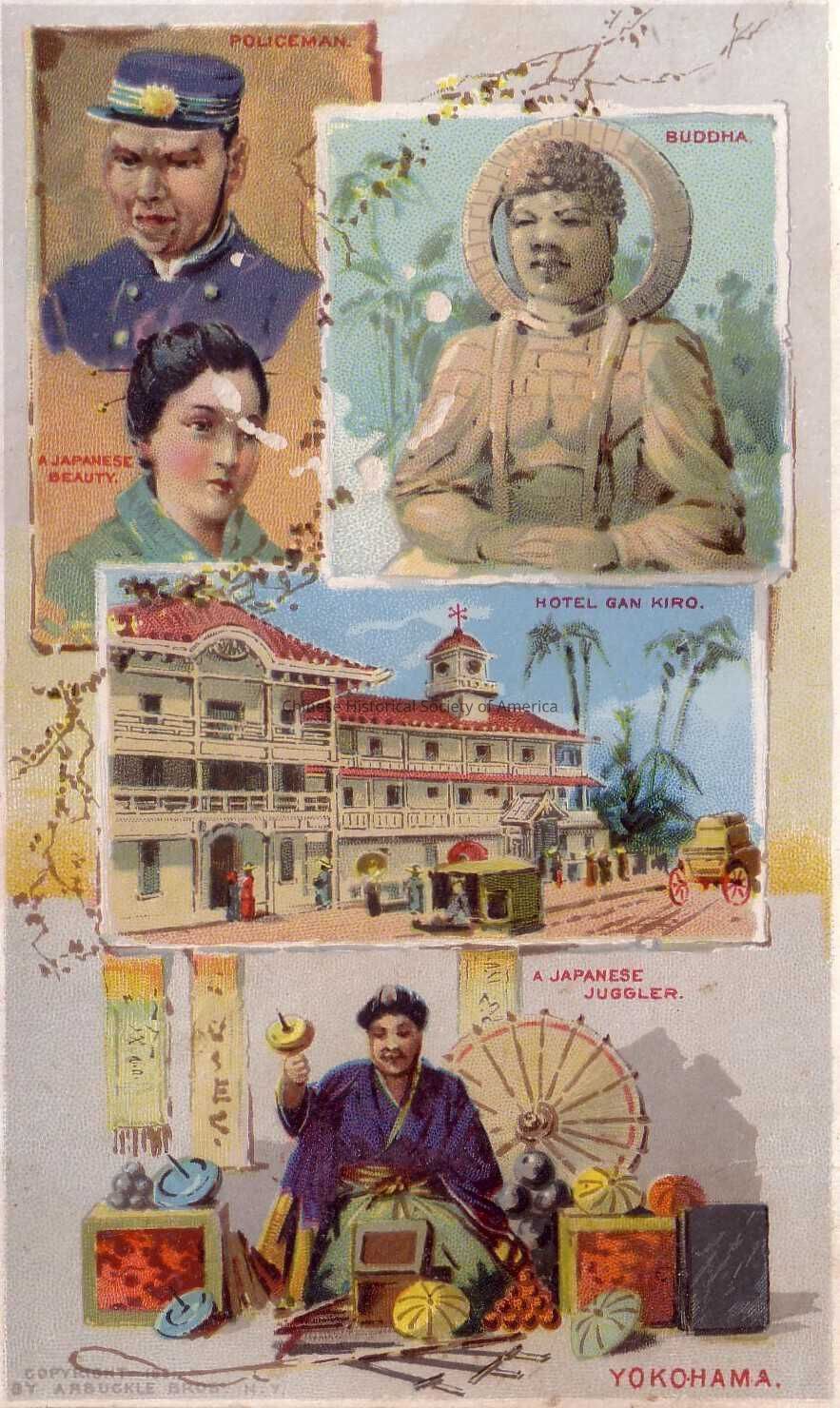Front: Illustrated in four different scenes are the people and the buildings that make up Yokohama-Japan. On the upper left hand corner illustrated is a Japanese "Policeman" in uniform and a "Japanese Beauty" On the upper right hand corner there is an illustration of the "Buddha." In the center of the tradecard there is an illustration of the "Hotel Gan Kiro" while at the bottom of the tradecard there is an illustration of a "Japanese Juggler"