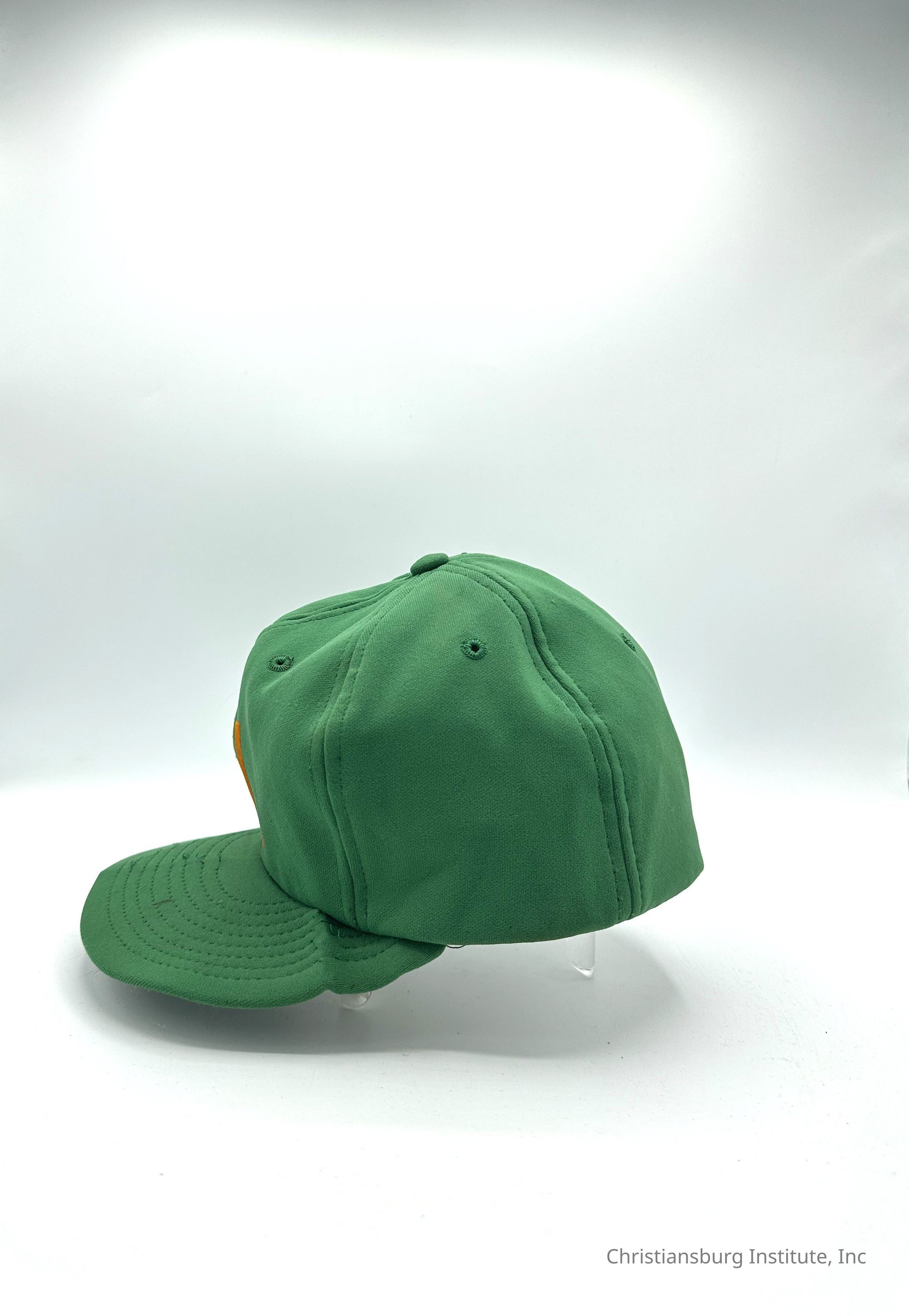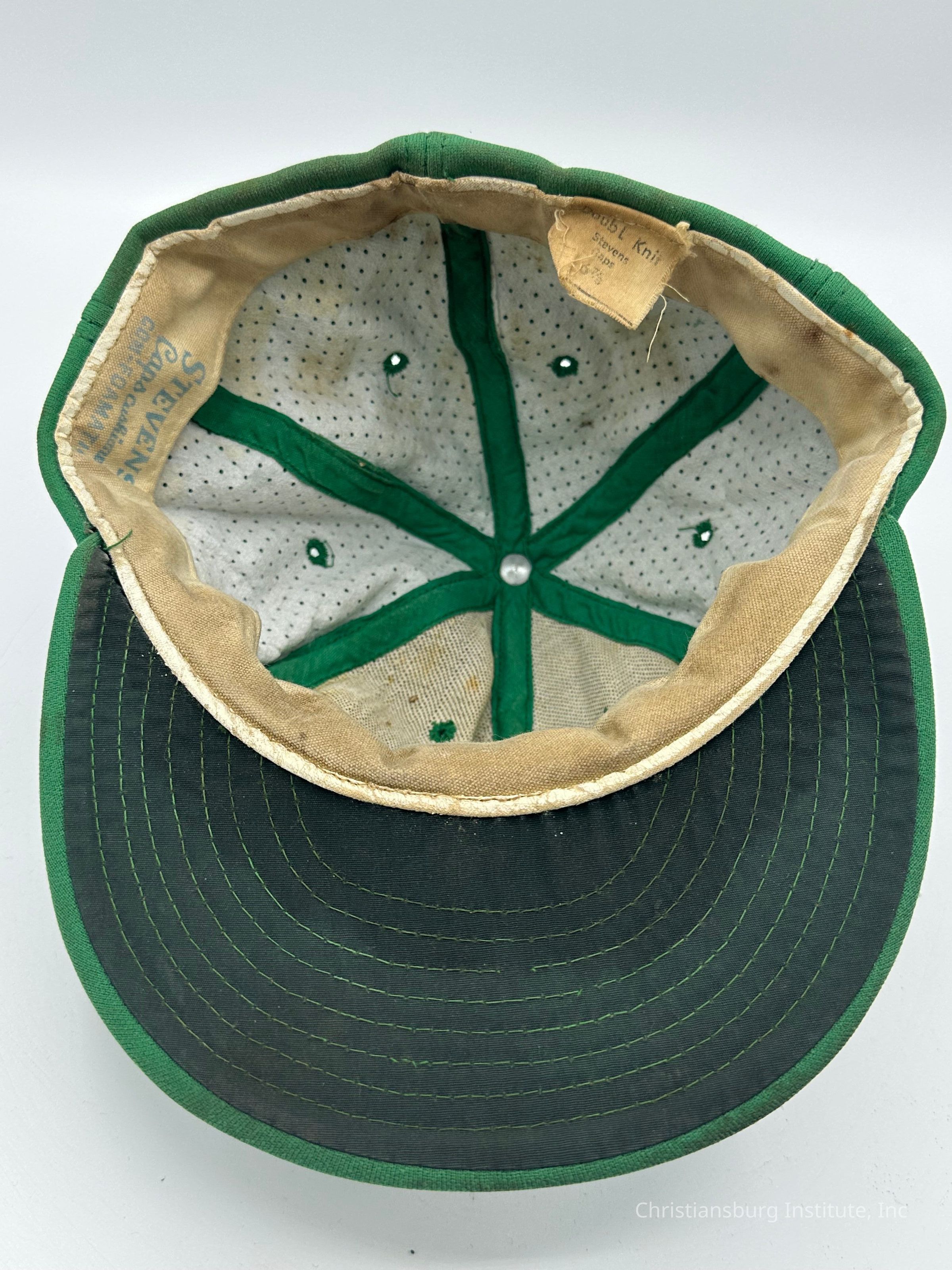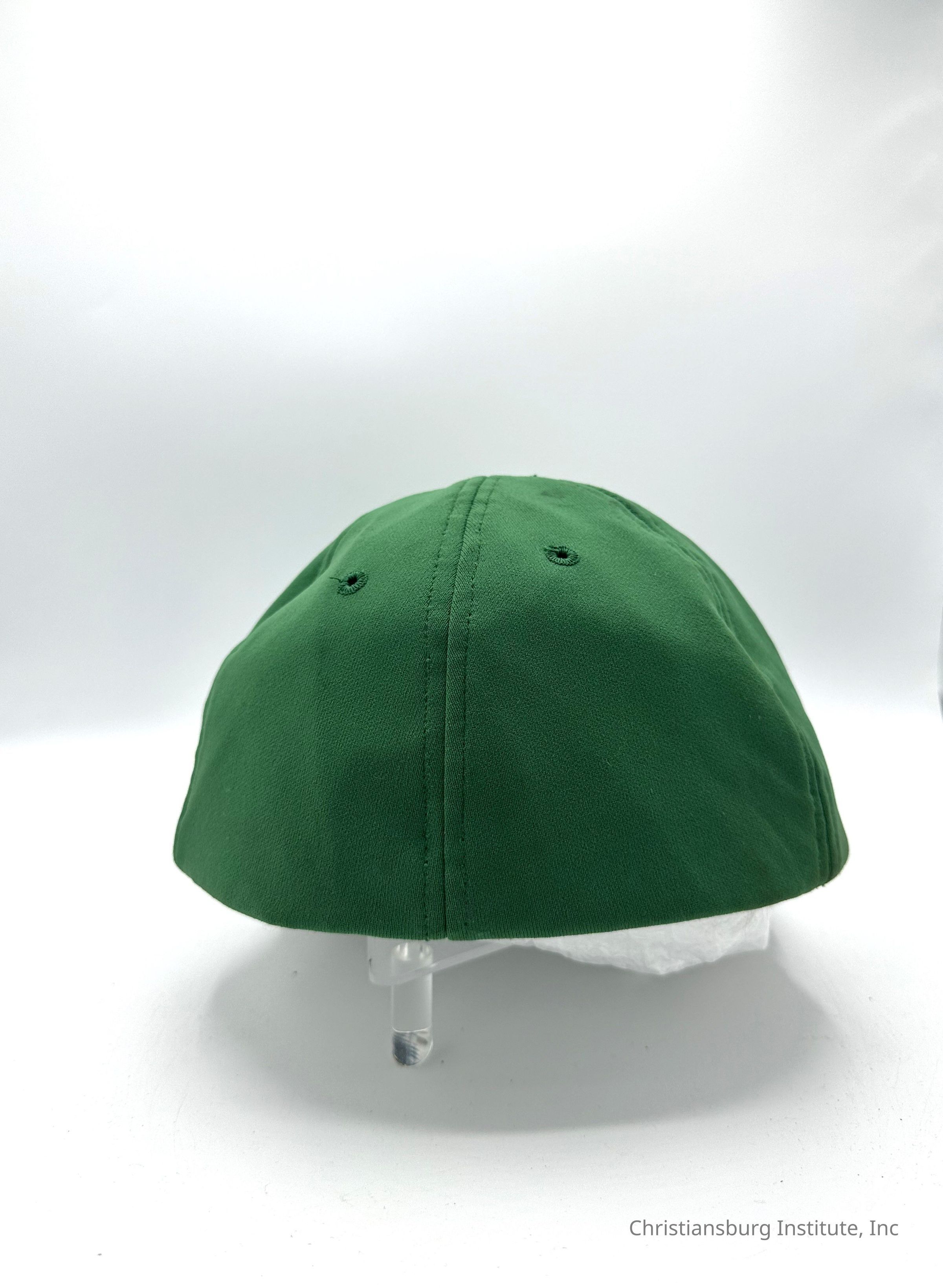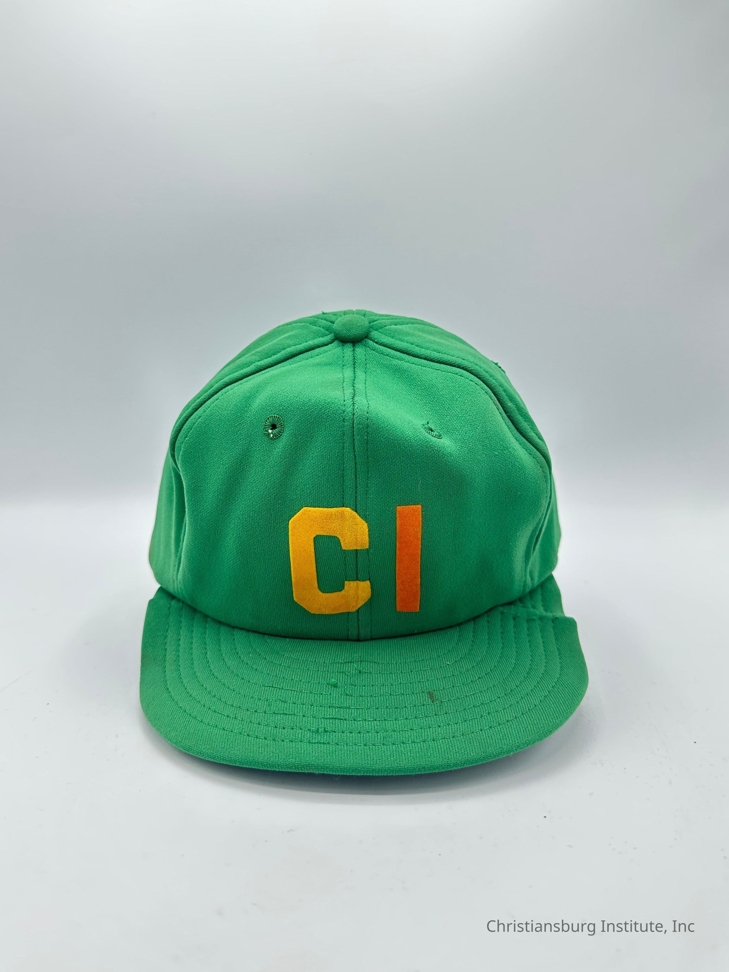 Two green baseball caps made by Stevens Caps with the letters CI on the front of the cap, undated.Collection