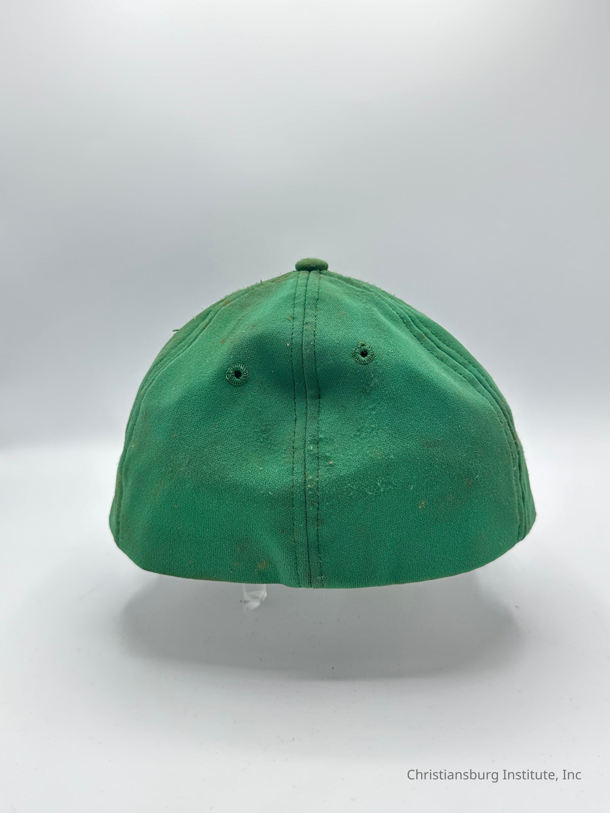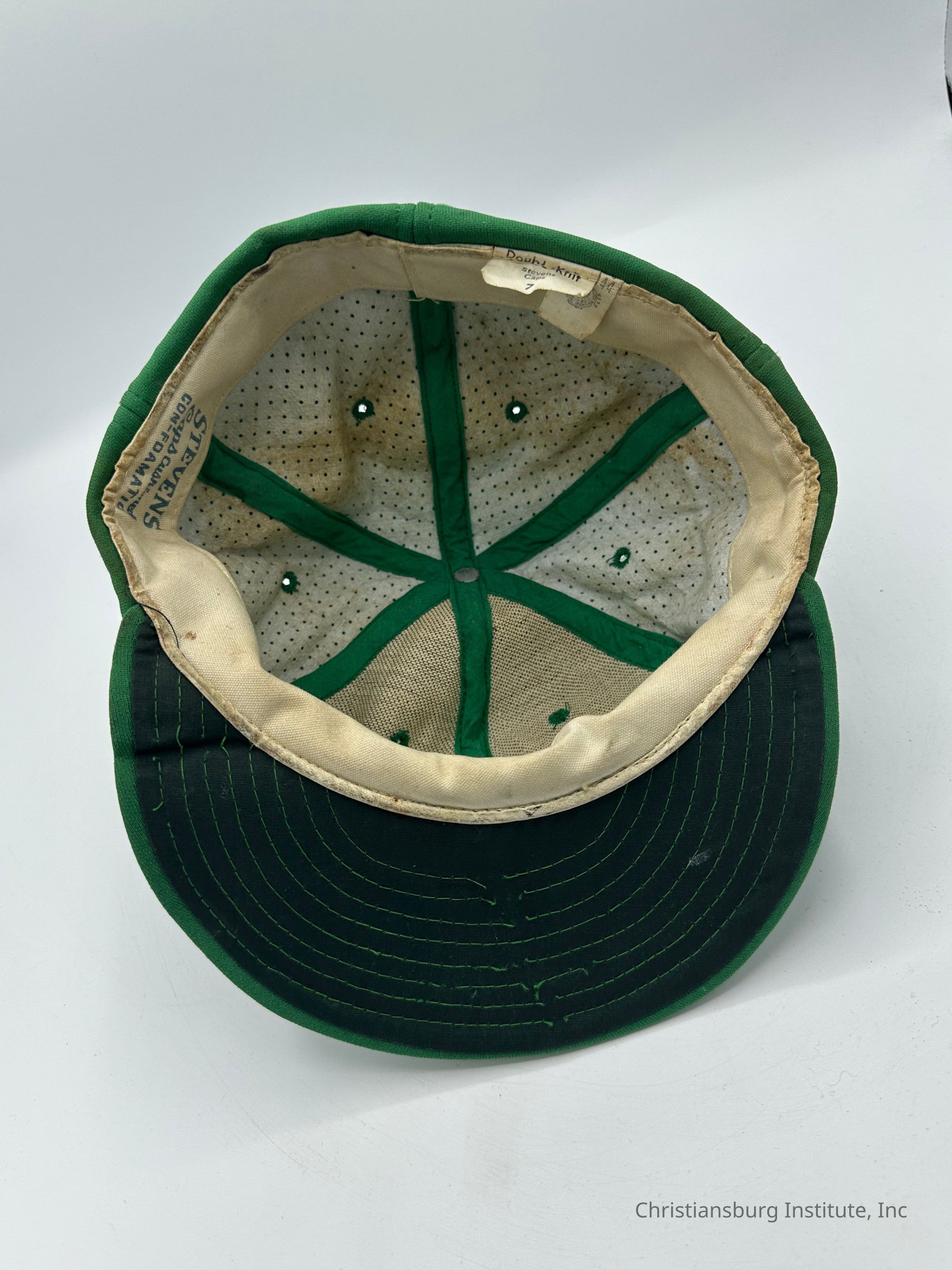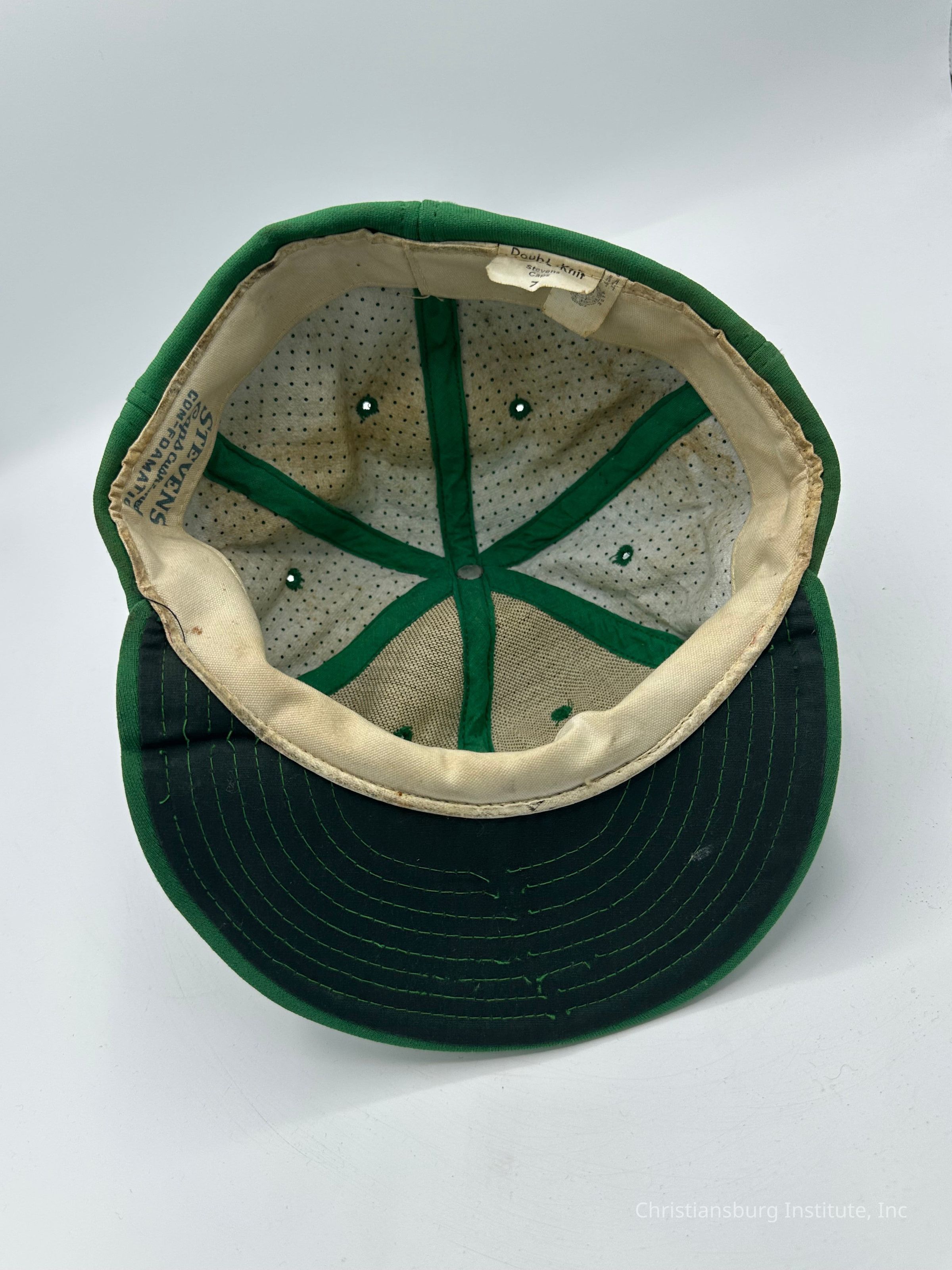 Two green baseball caps made by Stevens Caps with the letters CI on the front of the cap, undated.Collection