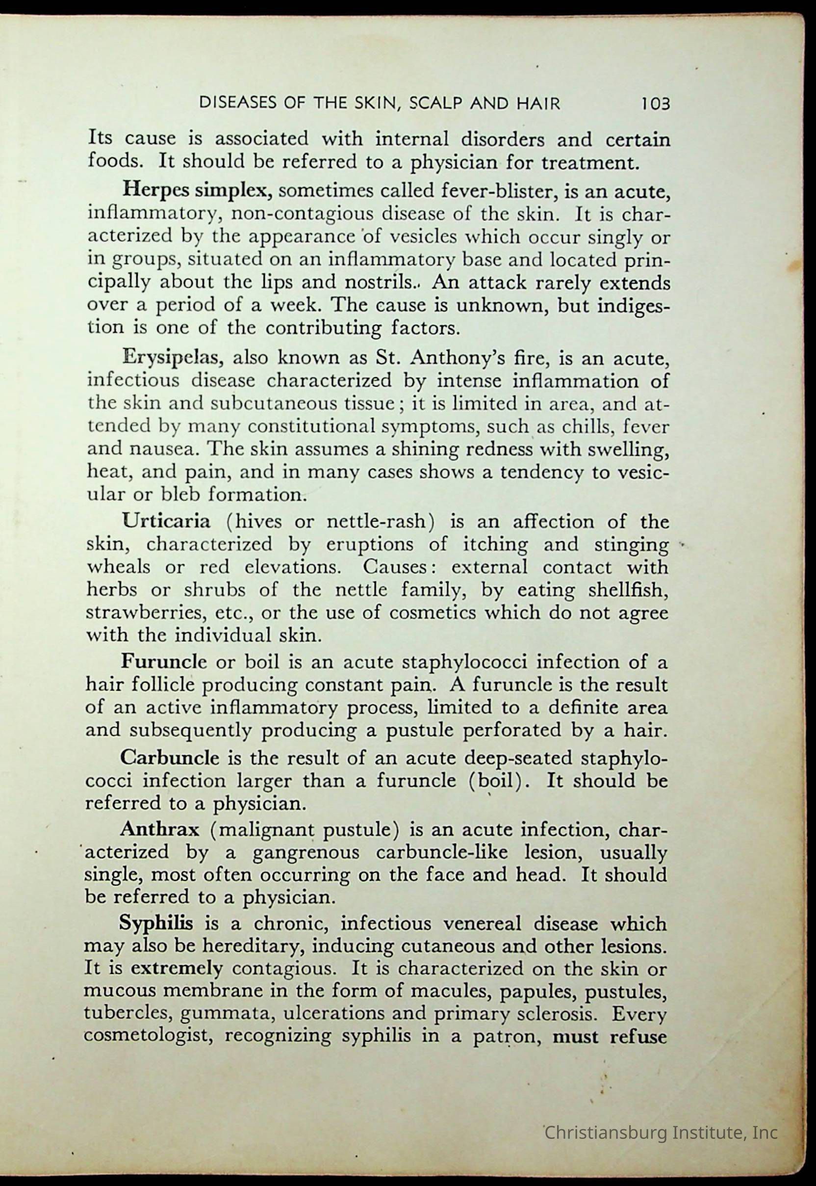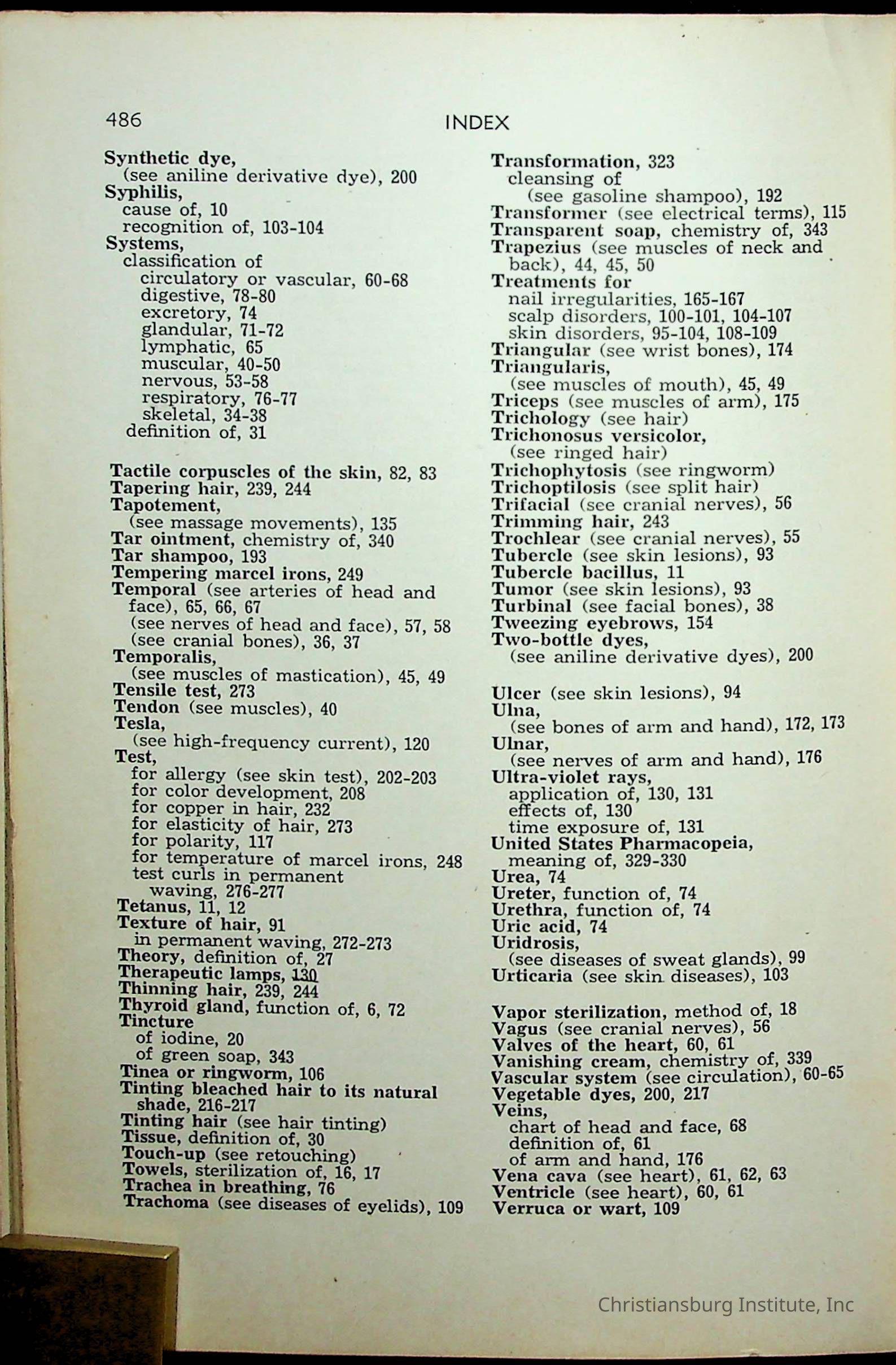 A revised version of the textbook titled, "Standard Textbook on Cosmetology" written by Constance V. Kibbe and published in the year 1942. This copy was owned by CII student, Amanda Edwin (later Amanda DeHart).Collection