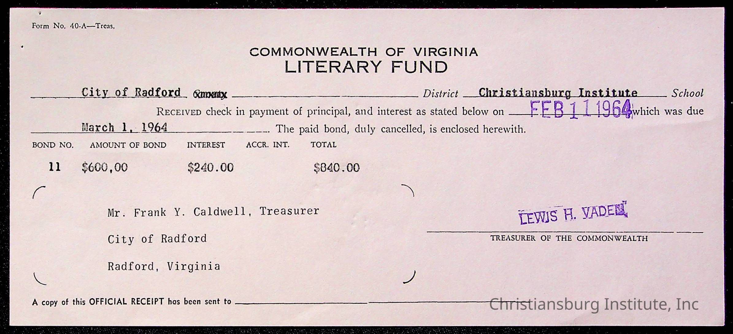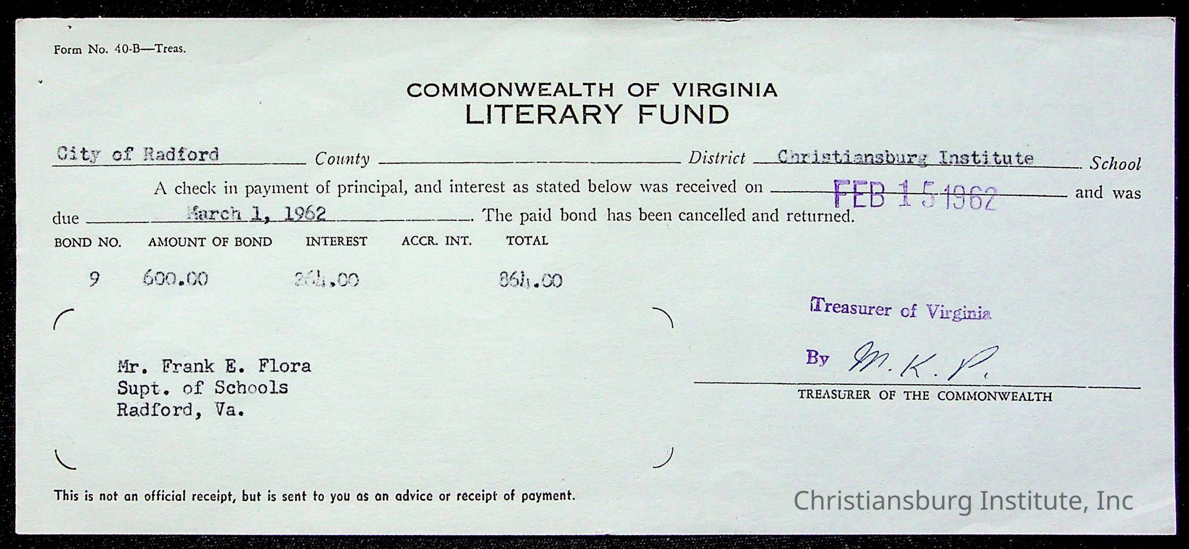 An archive of receipts for the literary fund bonds for Christiansburg Institute from the City of Radford, dated 1954-1968.