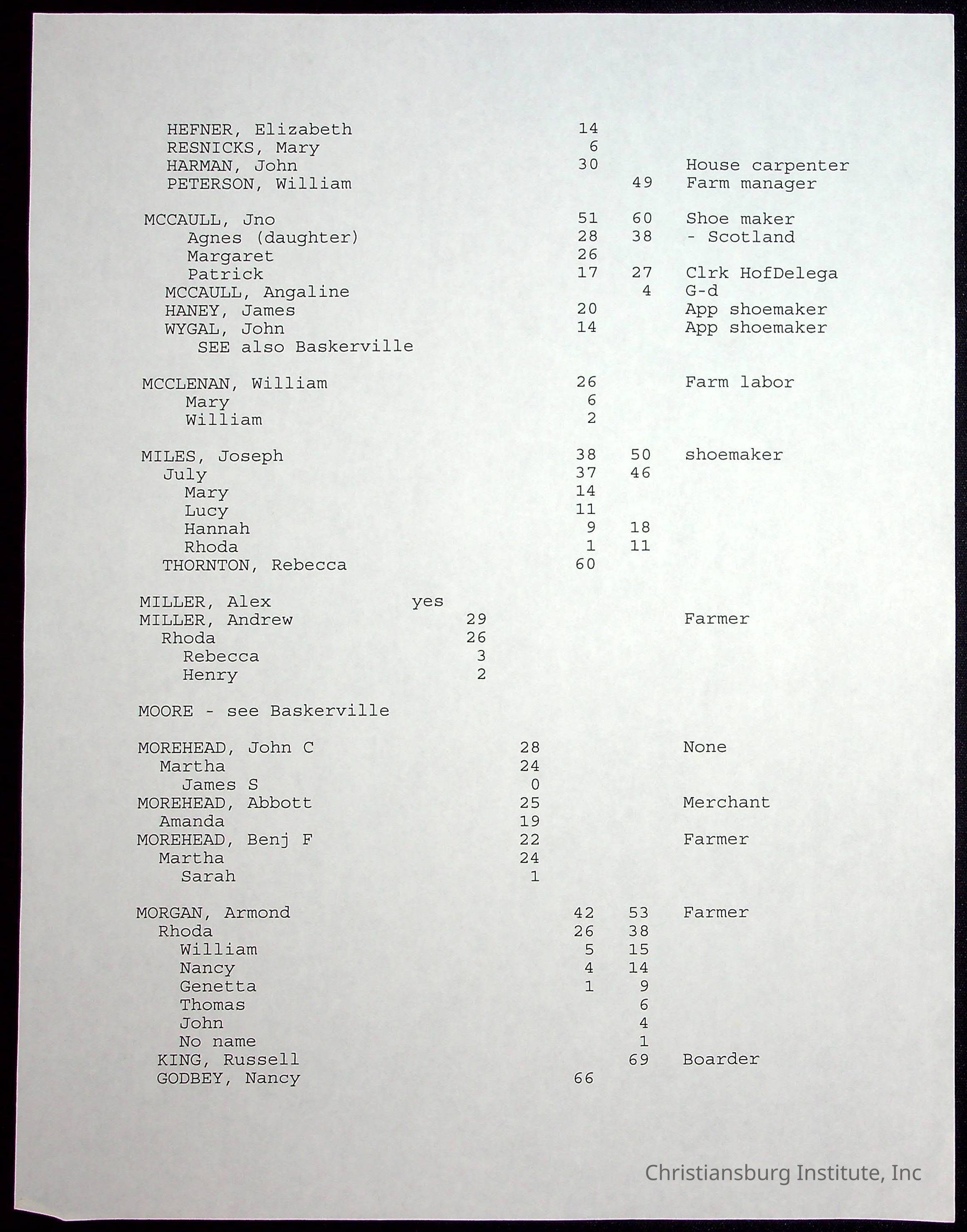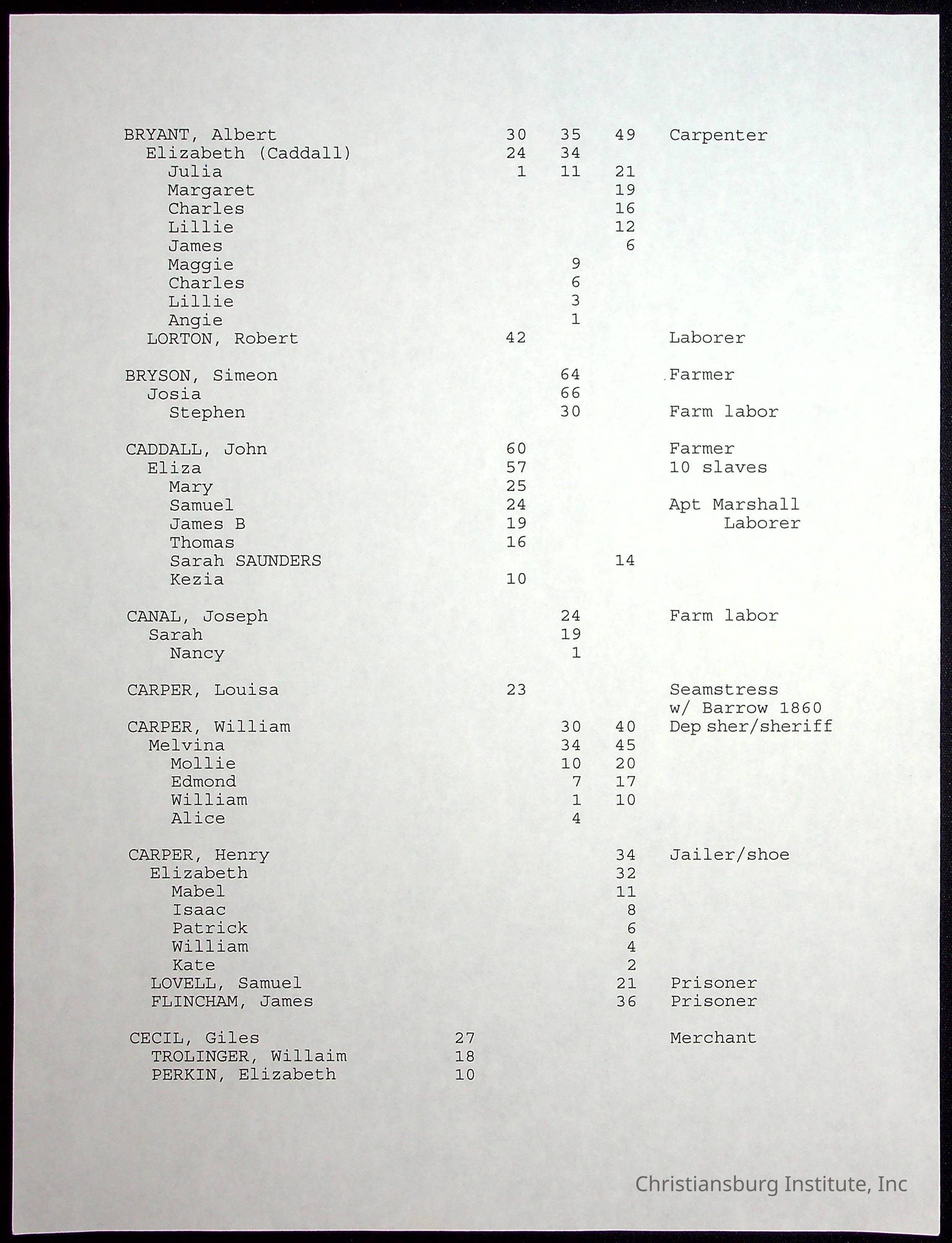 A folder of research materials collected by Radford University professor, Dr Linda Killen. This folder is titled 'Newbern Residents' and includes Killen's research on the residents of Newbern, Virginia in Pulaski County, Virginia. This research file includes census records.