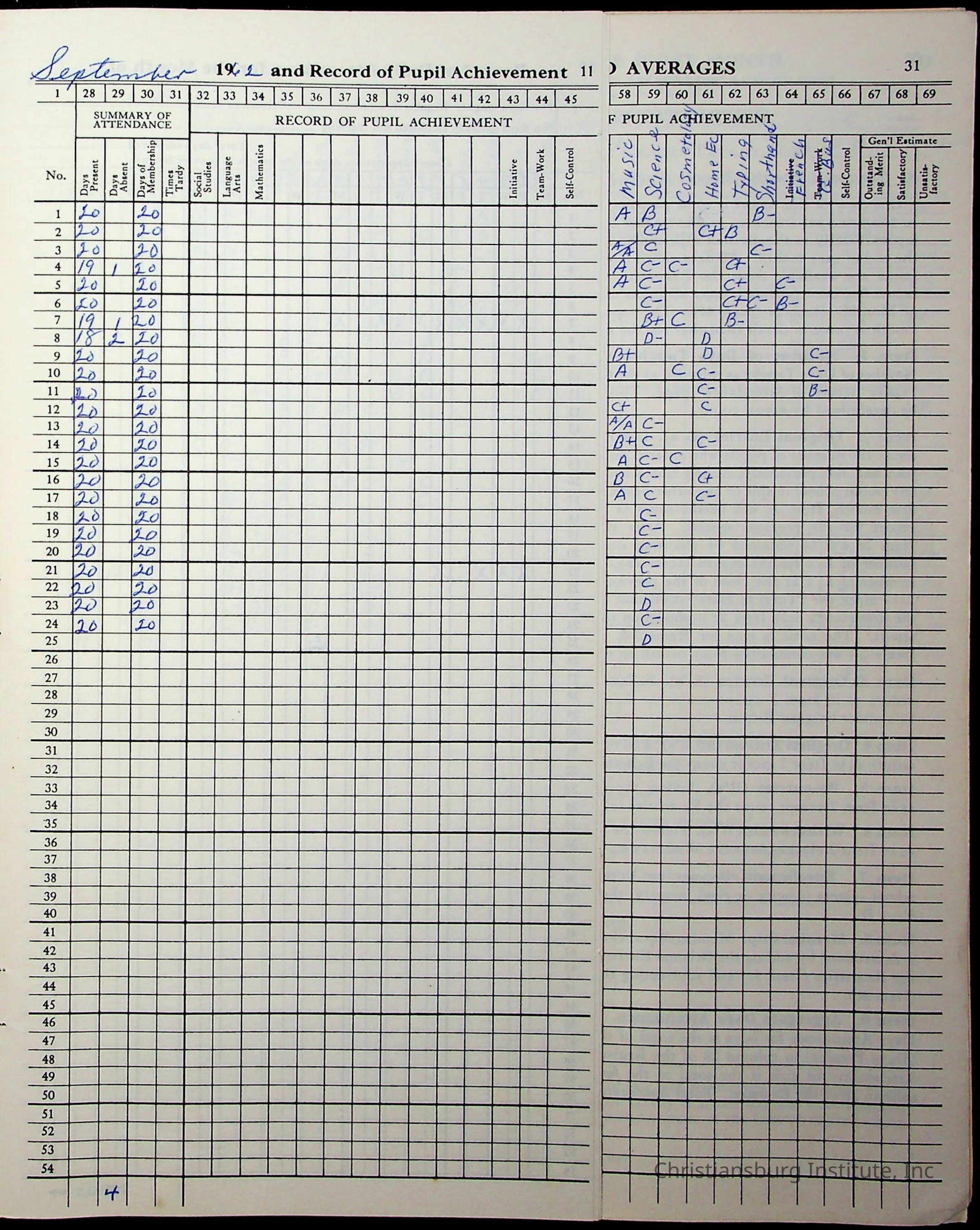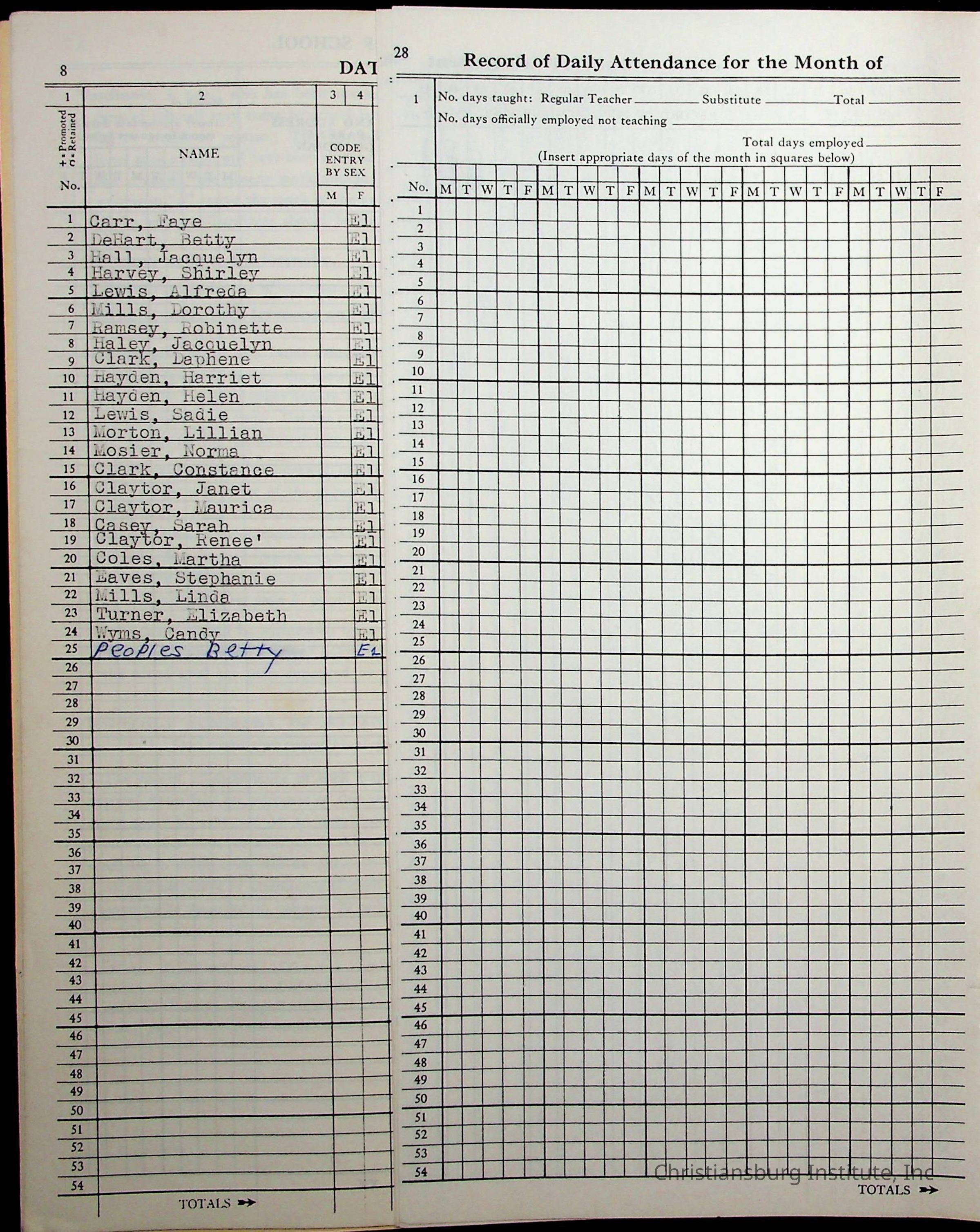 Hattie E. Clemons' Virginia teacher's register book for the school year 1962-1963 for Radford girl students at Christiansburg Institute including information about her students, their attendance, and course grades.Collection