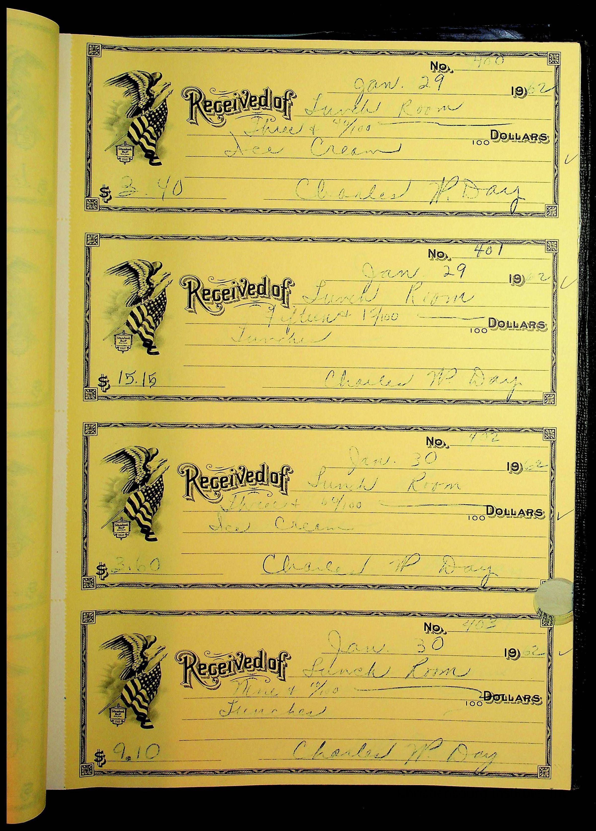 A receipt book manufactured by Boorum & Pease and used by Christiansburg Institute to document expenses and receipts from 1961 through 1963.
