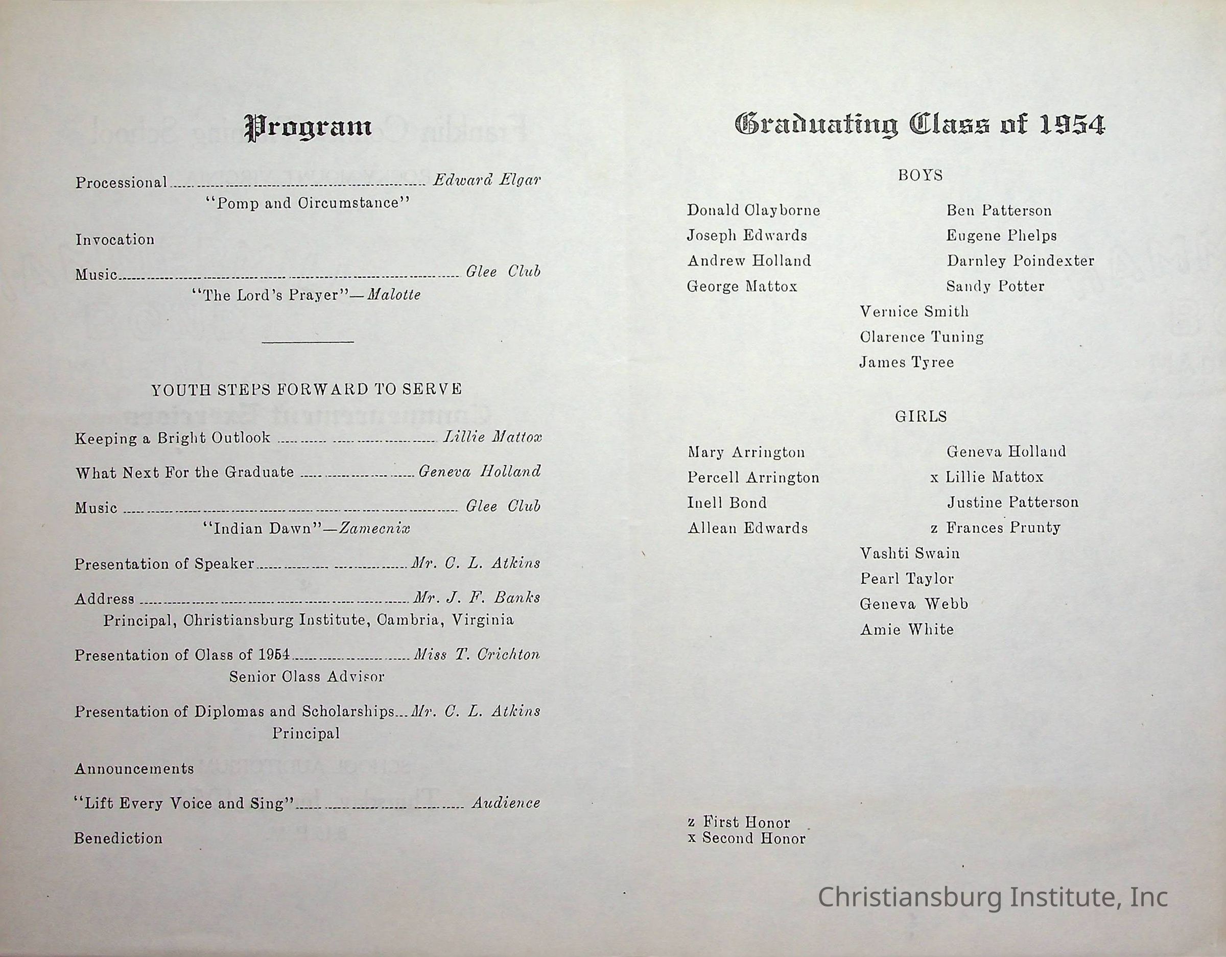An event program for the Franklin County Training School commencement exercises held in Rocky Mount, Virginia on June 3rd, 1954. Christiansburg Institute principal, John F. Banks spoke at this event.Creator