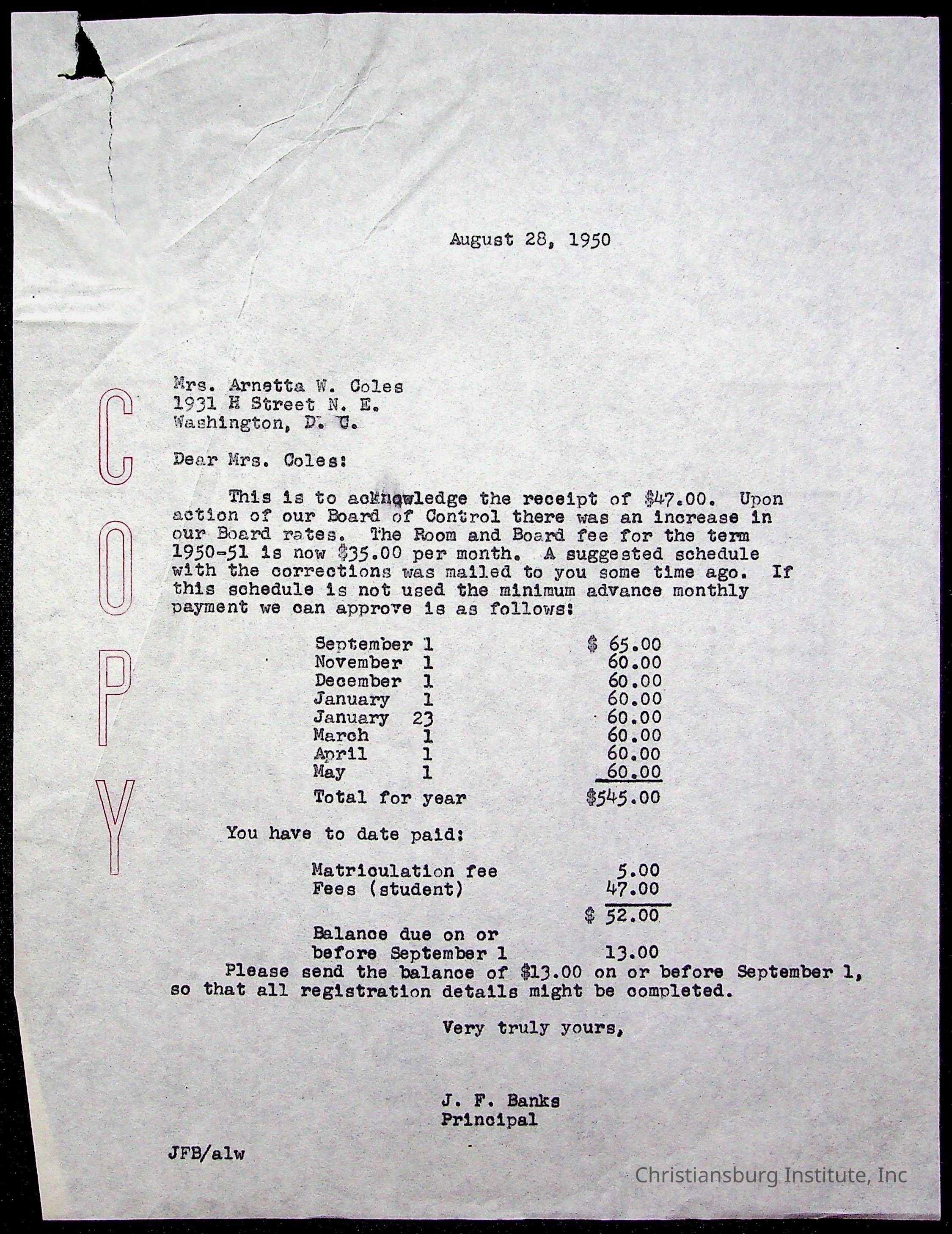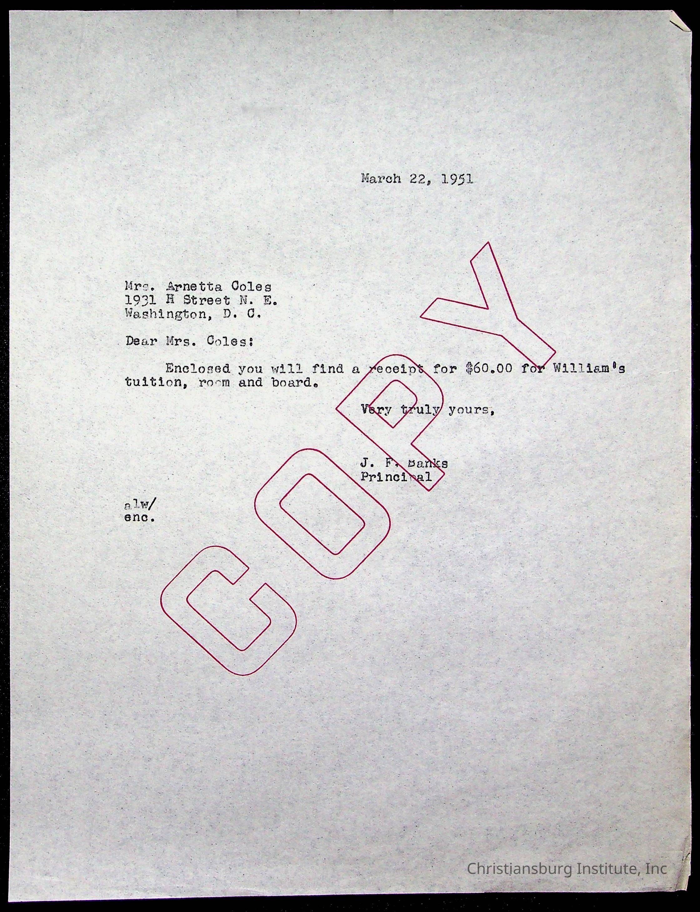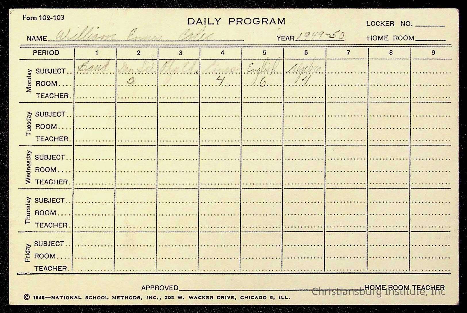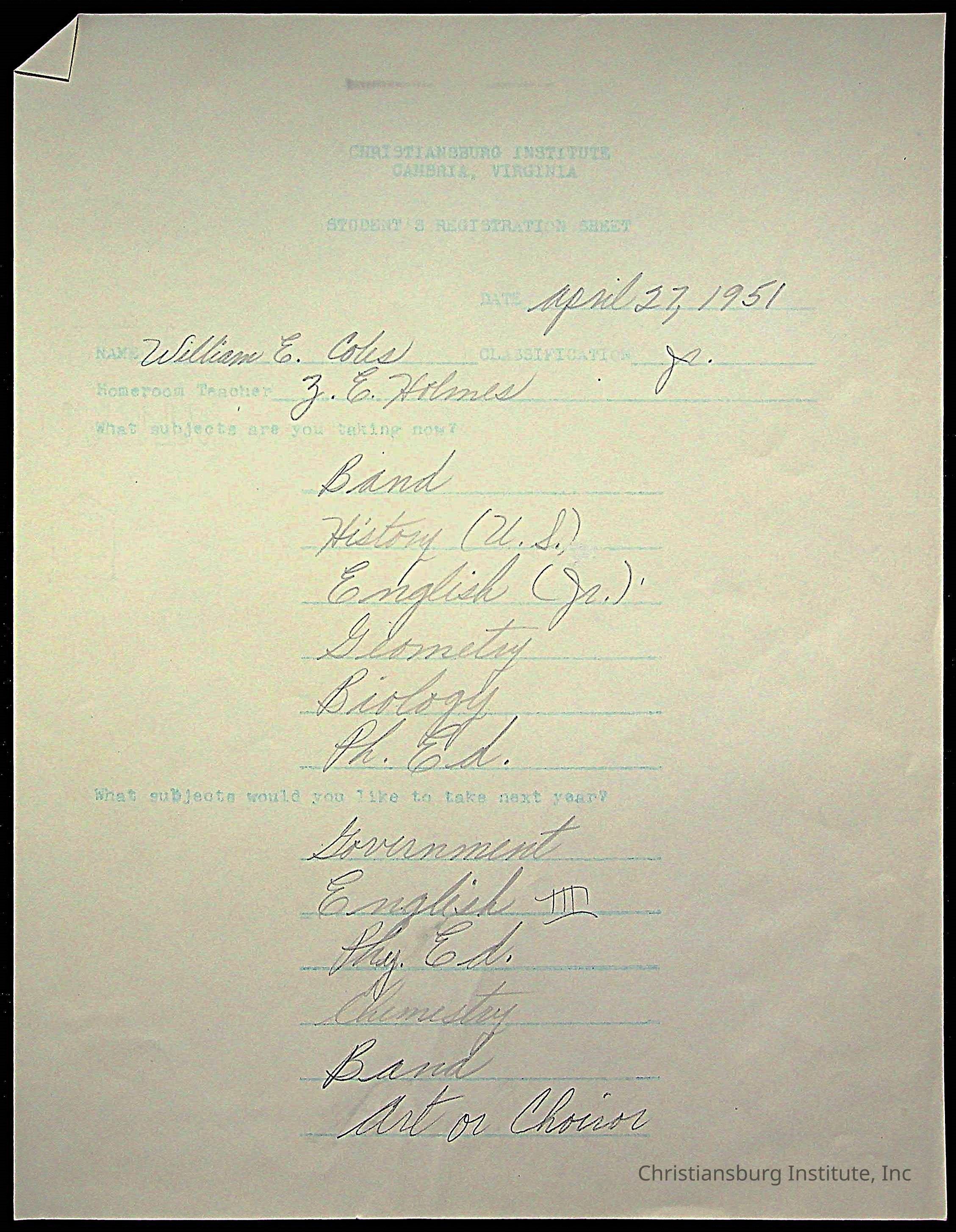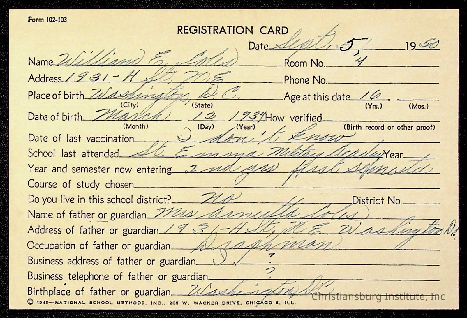 The student file for the Christiansburg Institute student, William Ennis Coles circa 1940s-1950s.