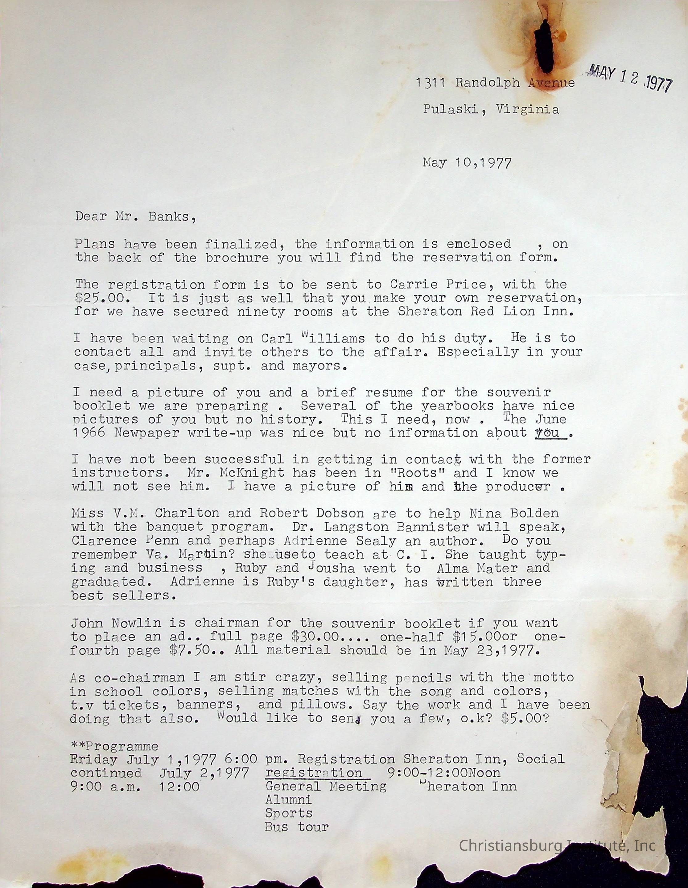 A letter from Amanda DeHart of the Christiansburg Institute Alumni Association to the former Christiansburg Institute principal, John F. Banks dated May 10th, 1977.Creator