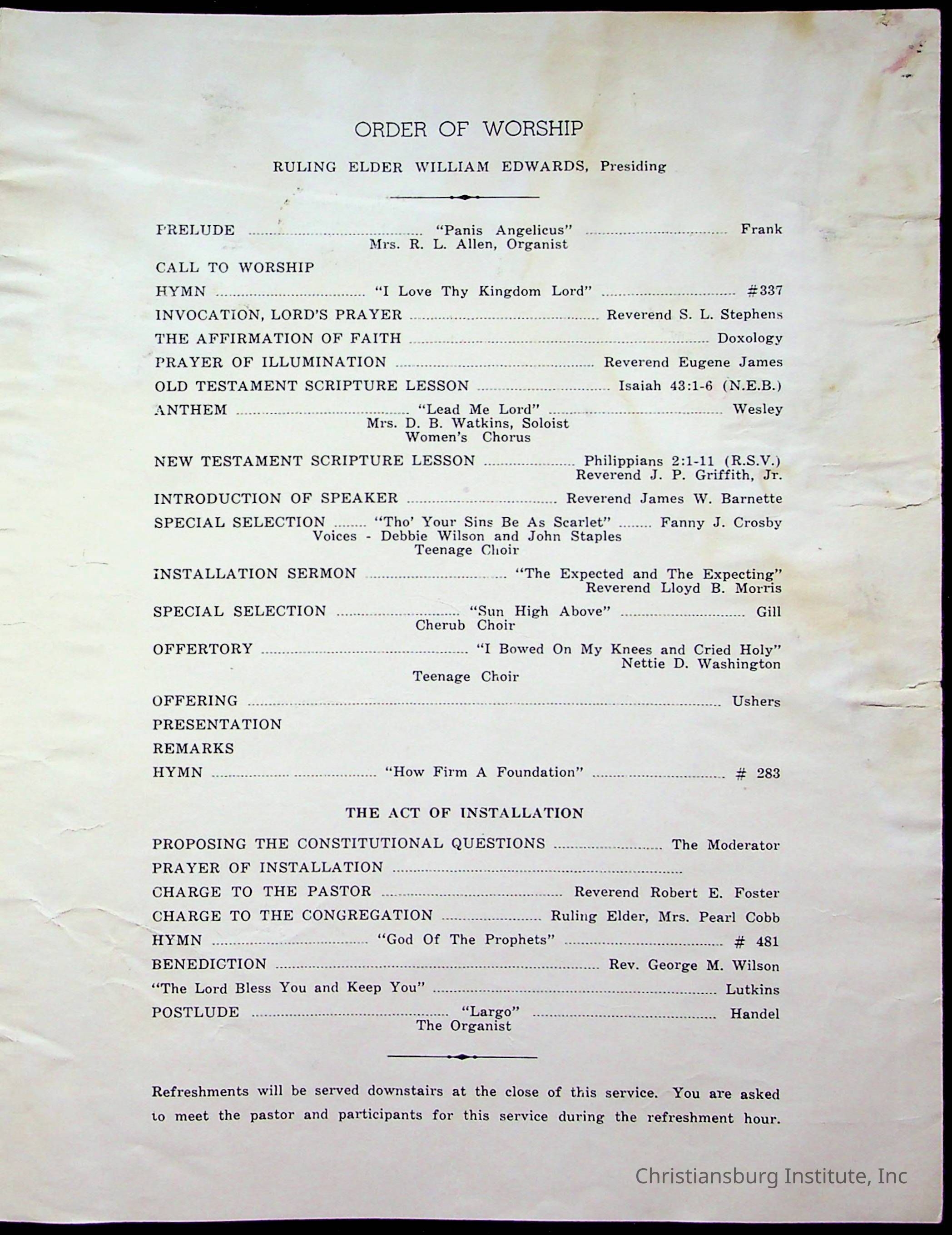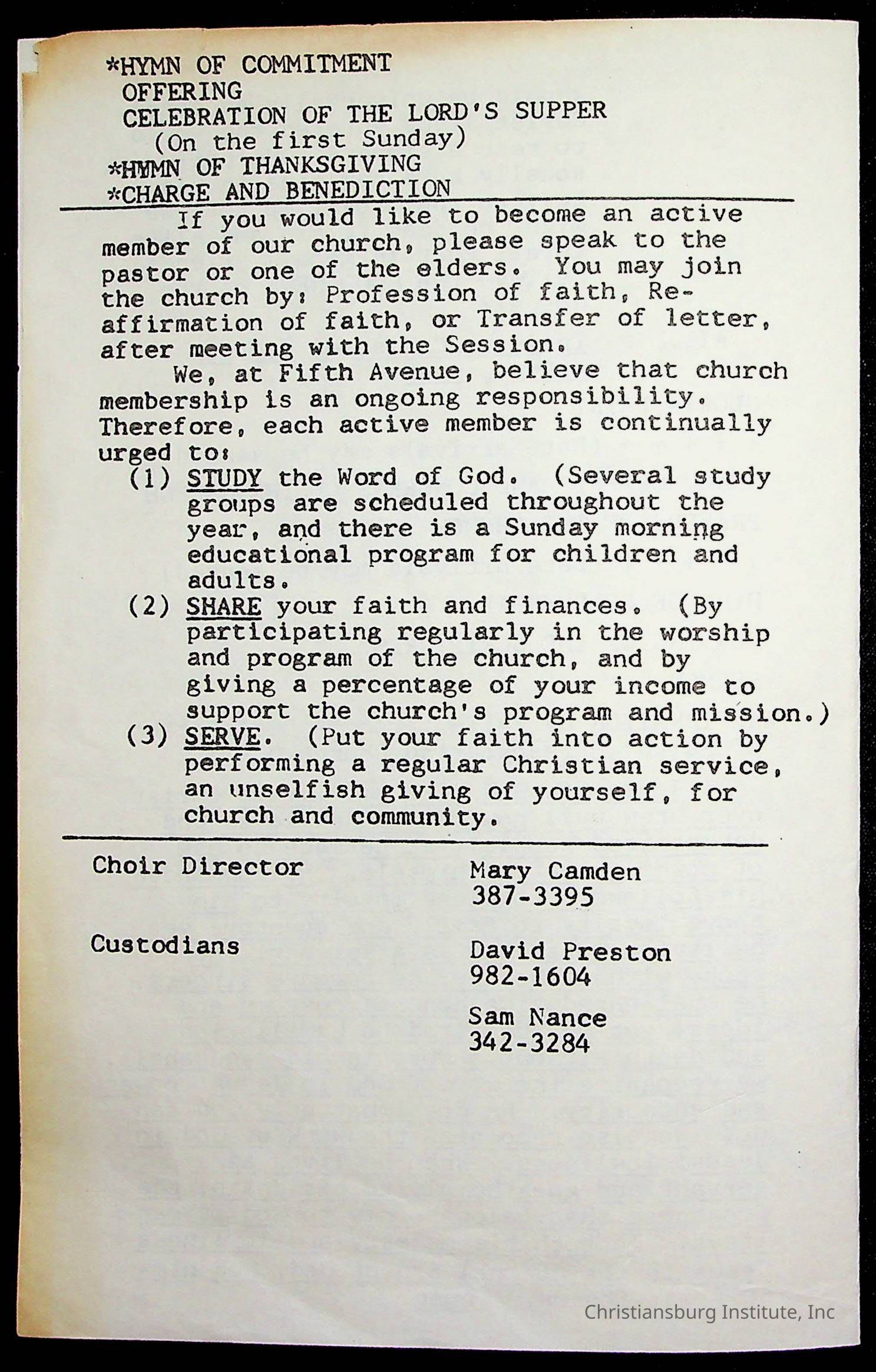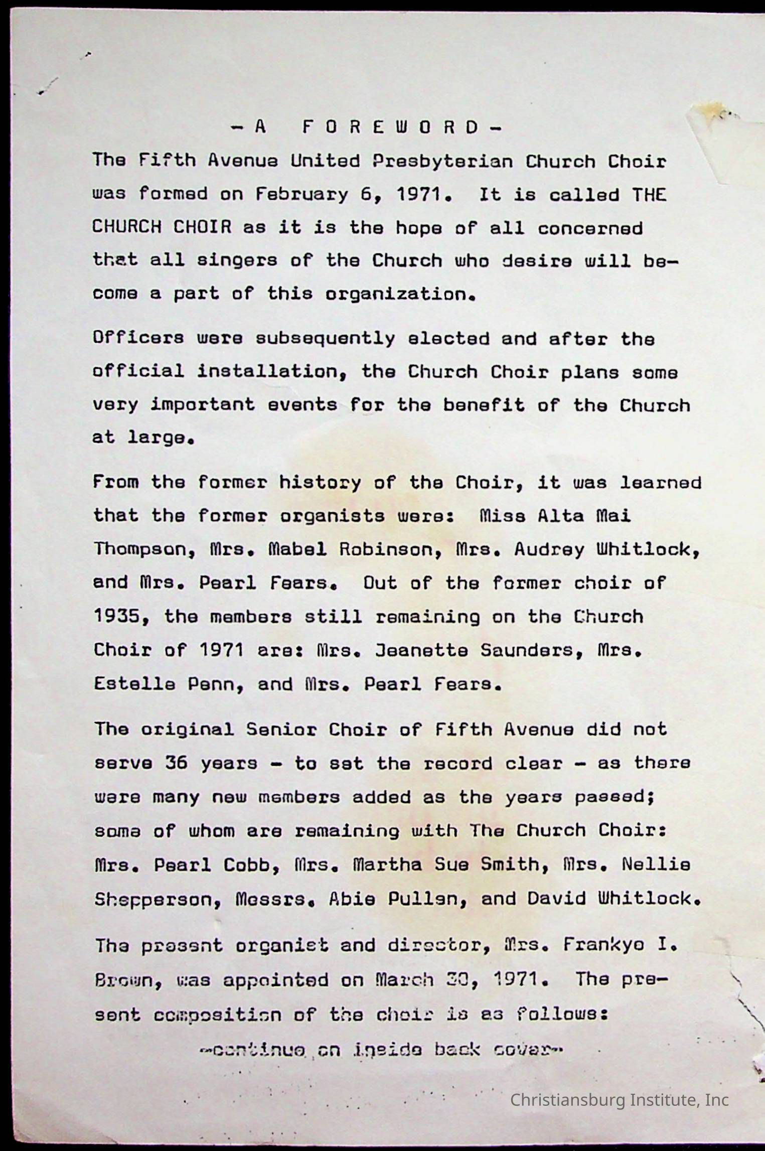 Copyright has been assigned to Christiansburg Institute Museum & Archives by Fifth Avenue Presbyterian Church. For permission to publish materials created by the donor, contact CIMA@christiansburginstitute.com. Materials not created by Fifth Avenue Presbyterian Church may still be under copyright.