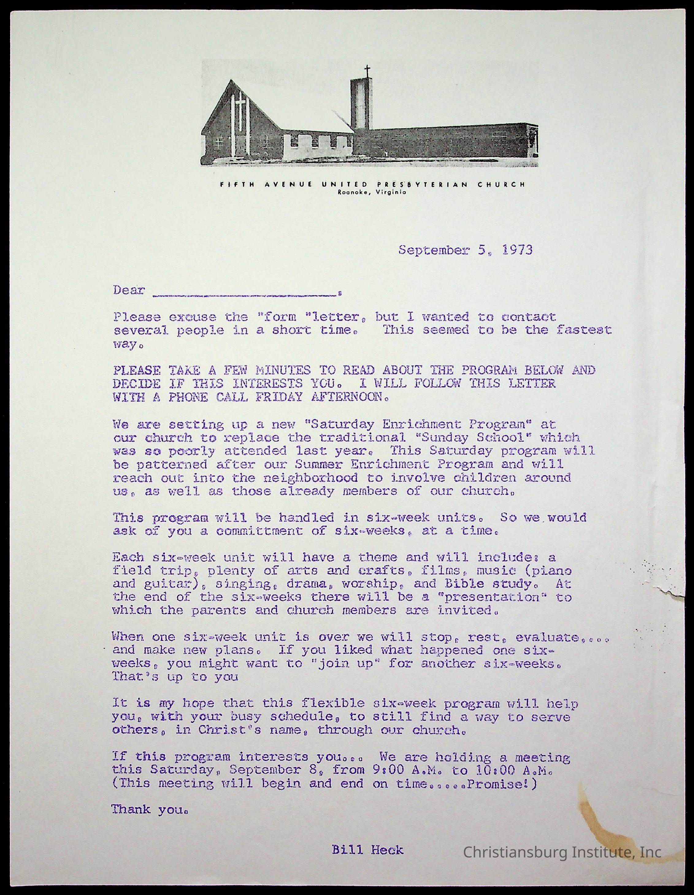 A collection of materials that pertain to Reverend William G. Heck III and to events that happened during the time he served at the church. He served as a reverend at Fifth Avenue Presbyterian Church.Collection