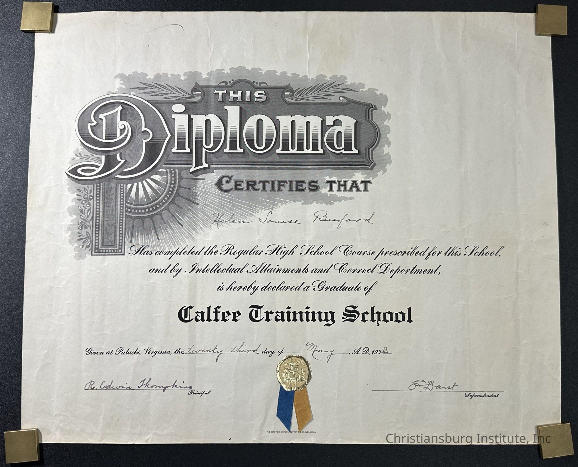 A high school diploma issued to Helen Louise on May 23rd, 1932 for completing their course of study at Calfee Training School.