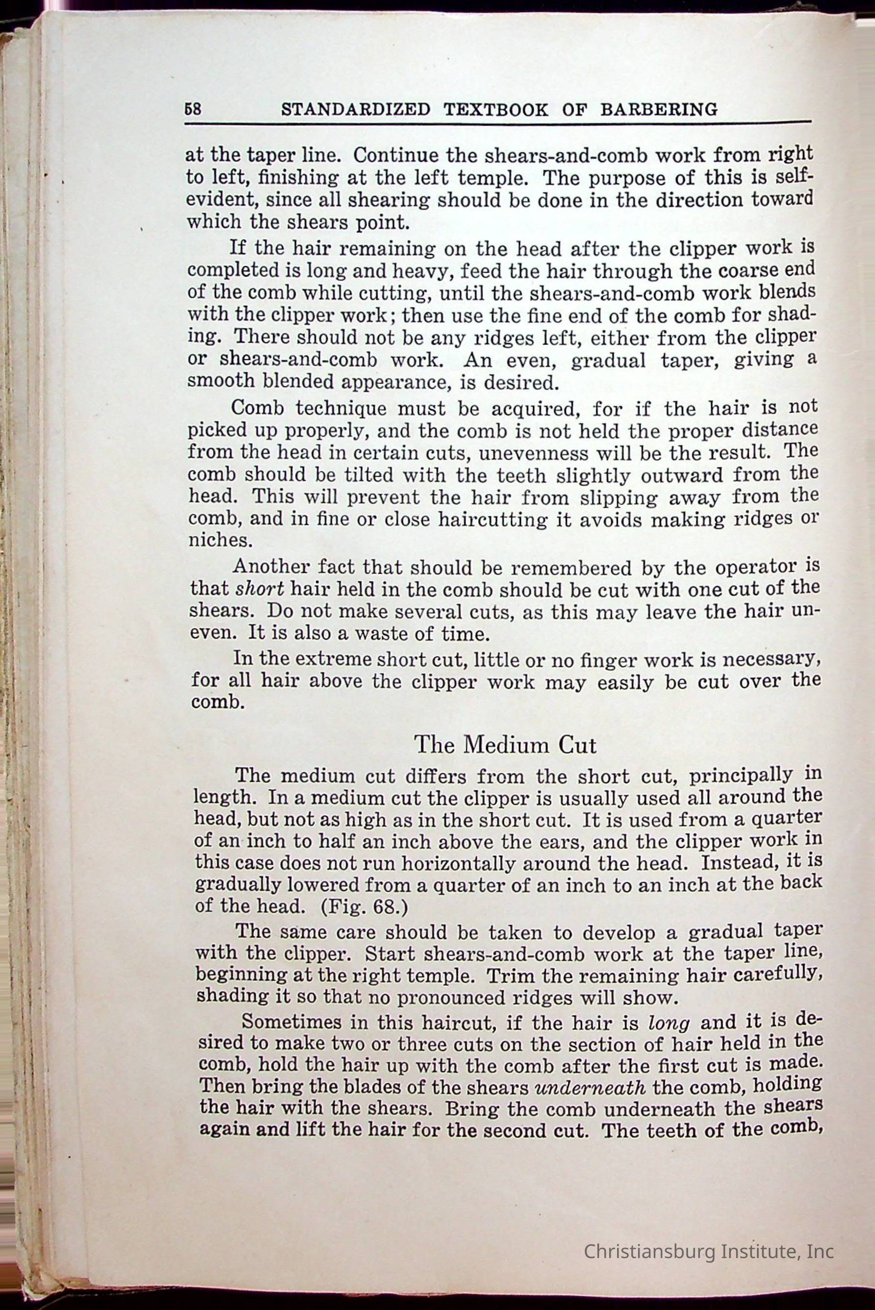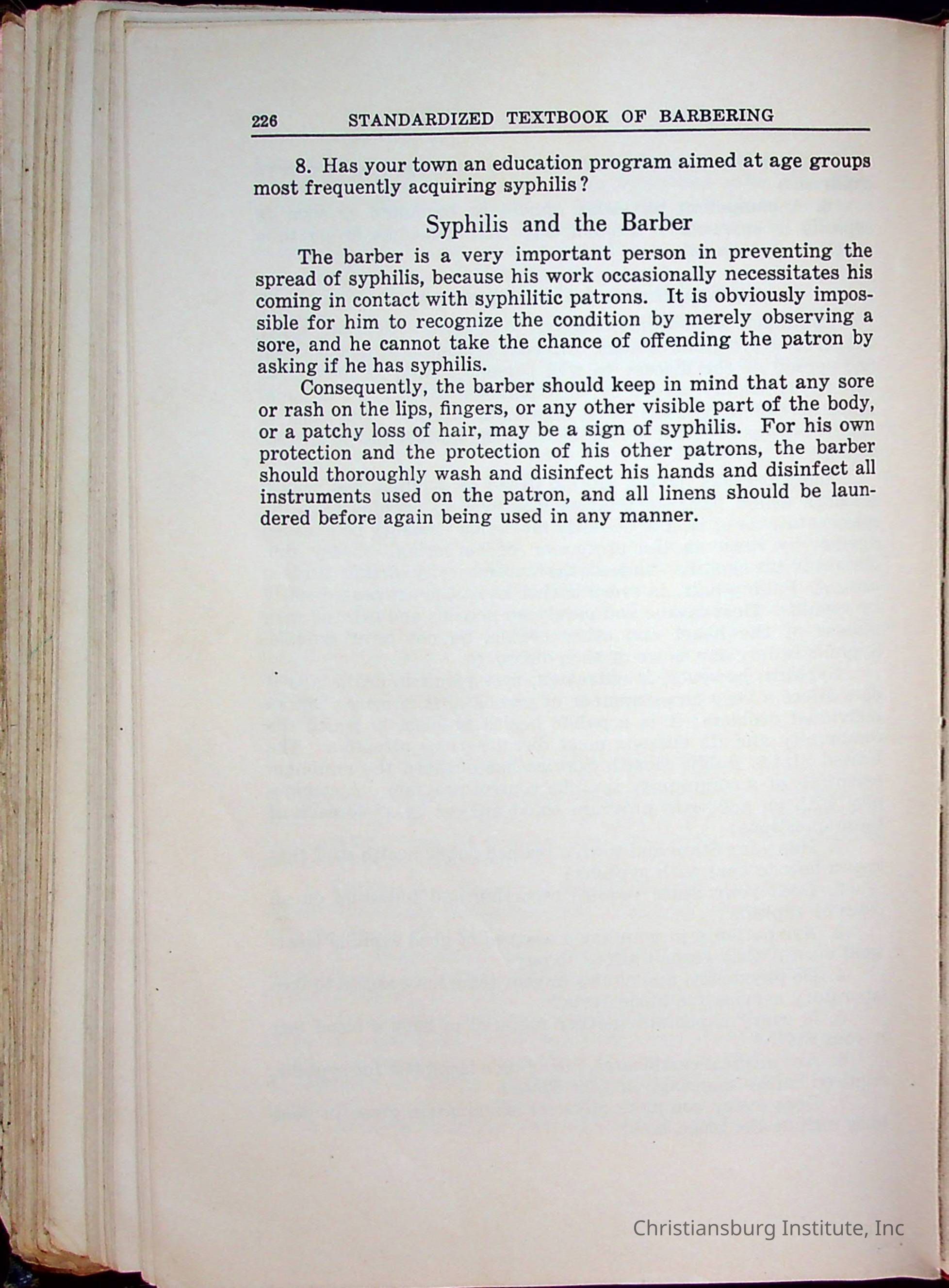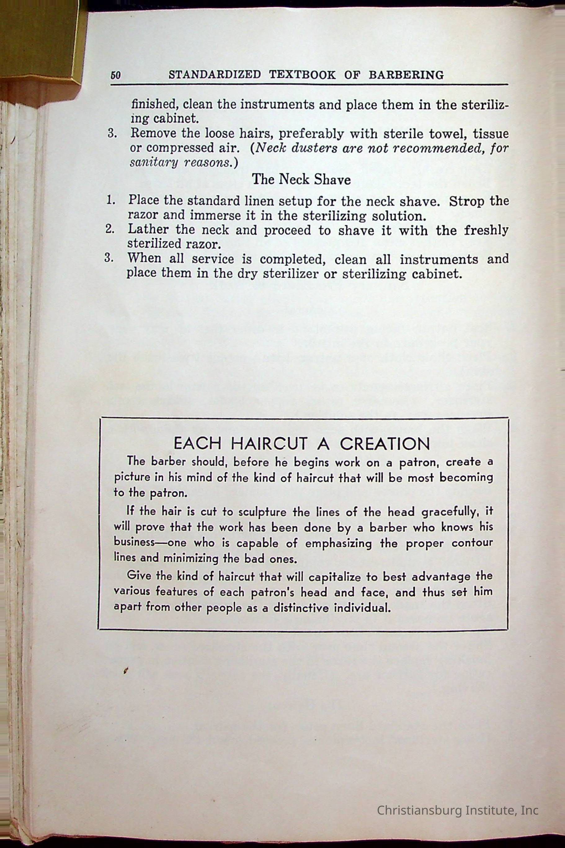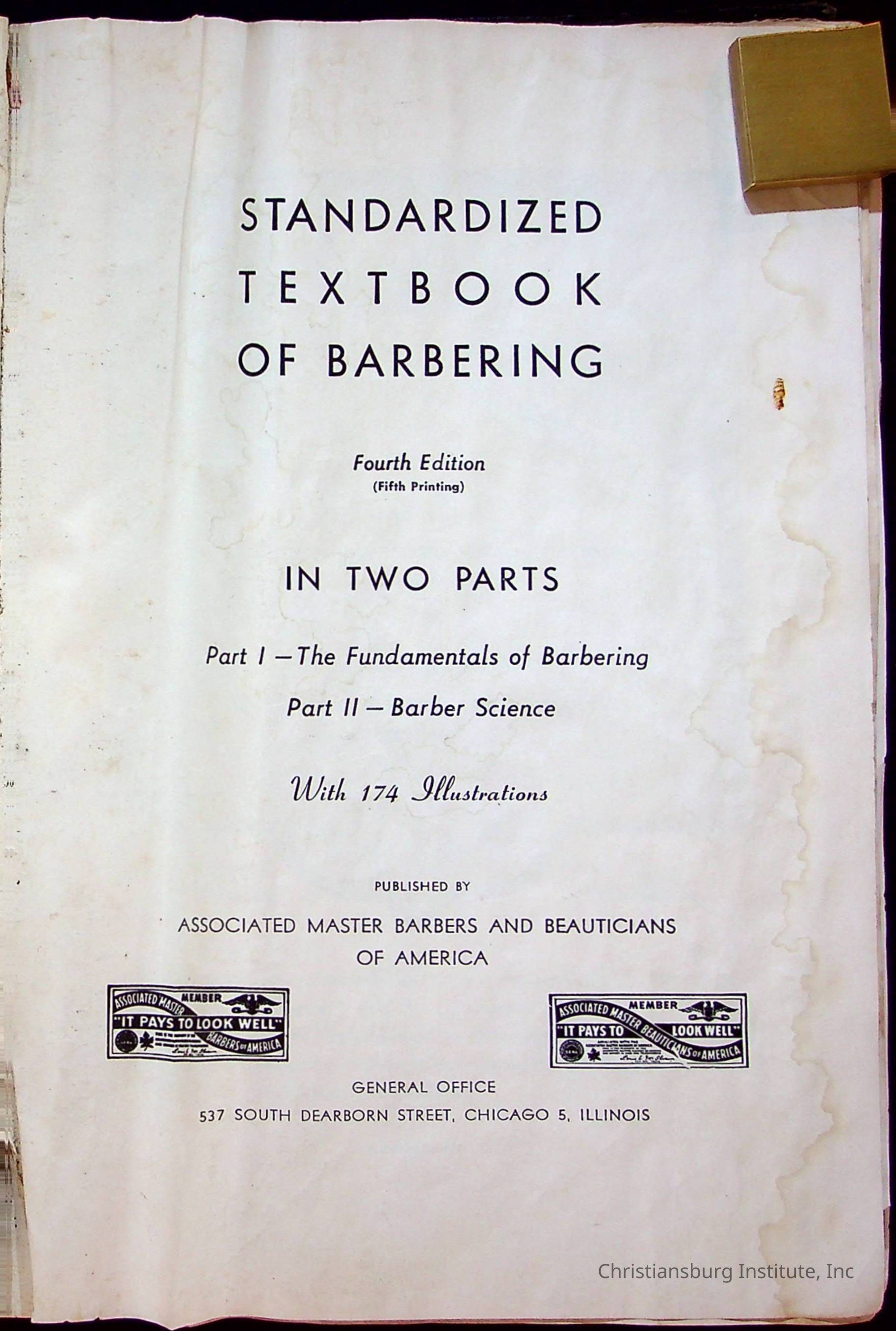 "Standardized Textbook of Barbering: in Two Parts" written and published by the Associated Master Barbers and Beauticians of America in the year 1950. This textbook was in the Christiansburg Institute library.