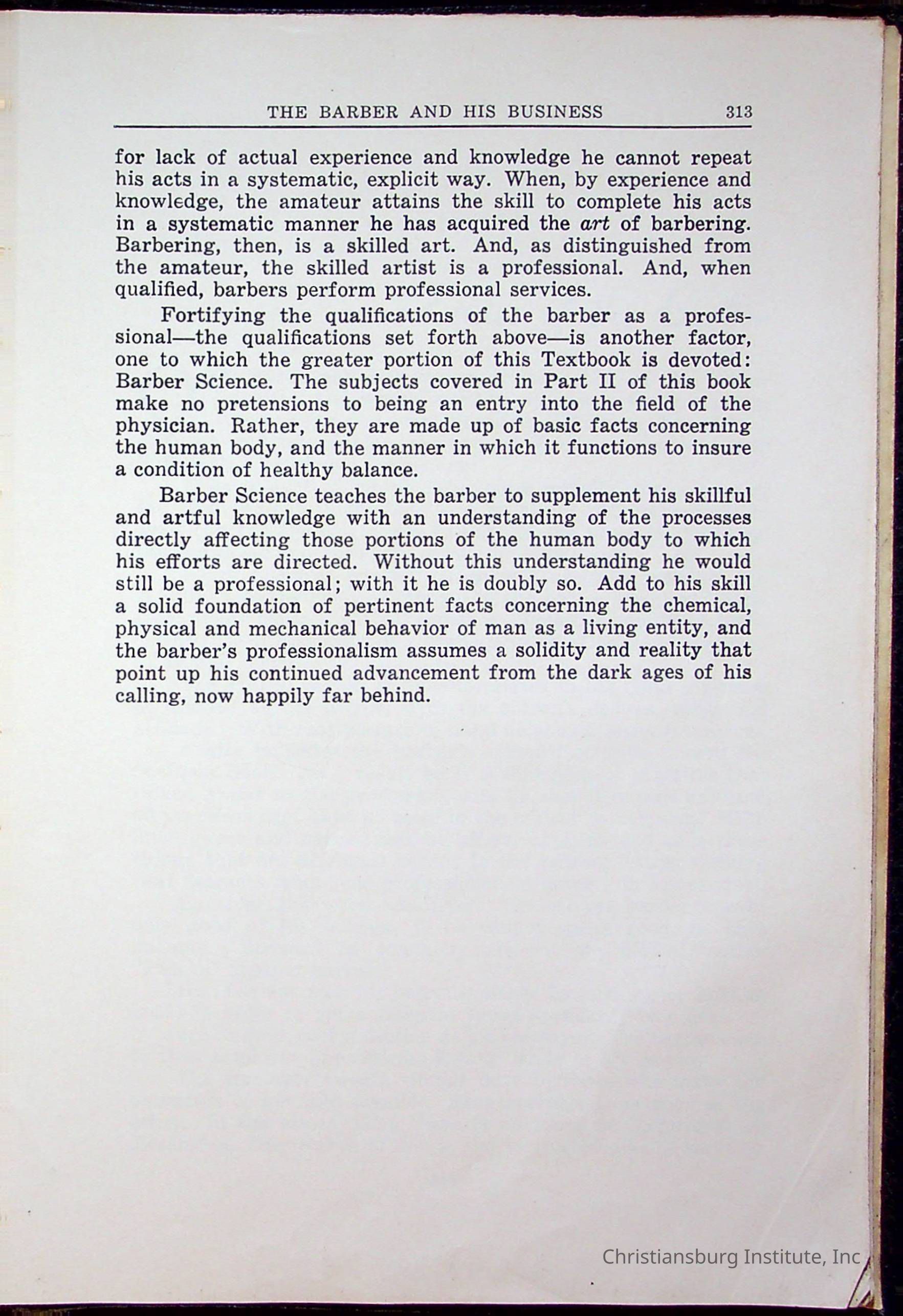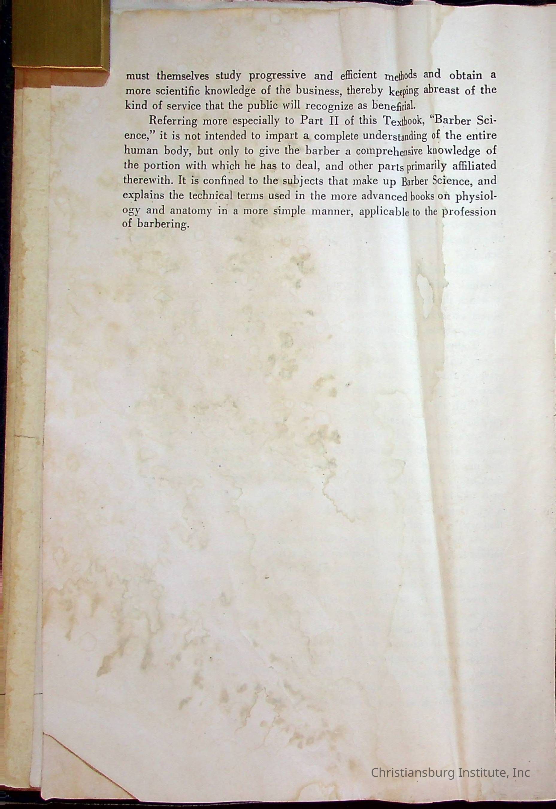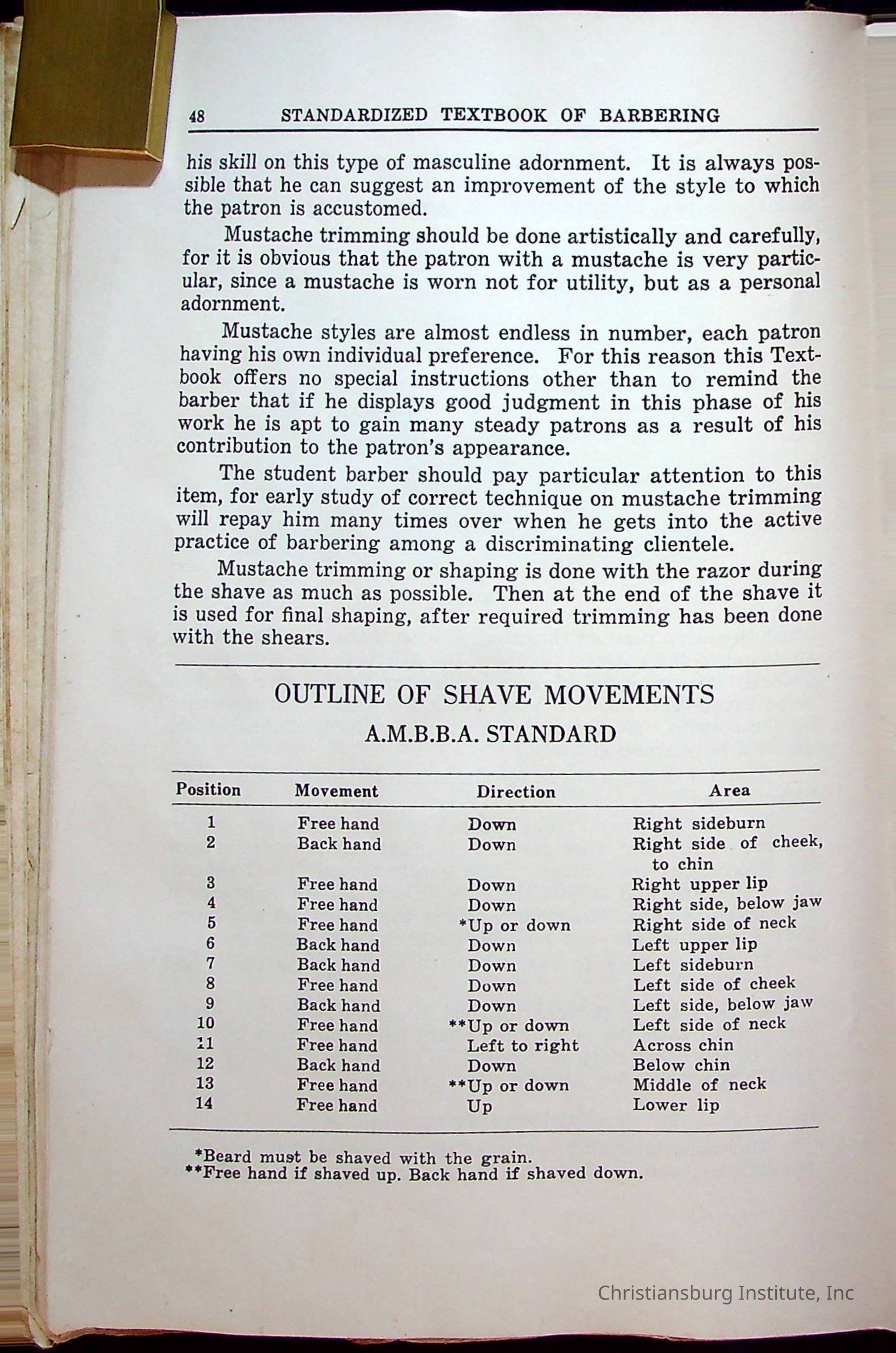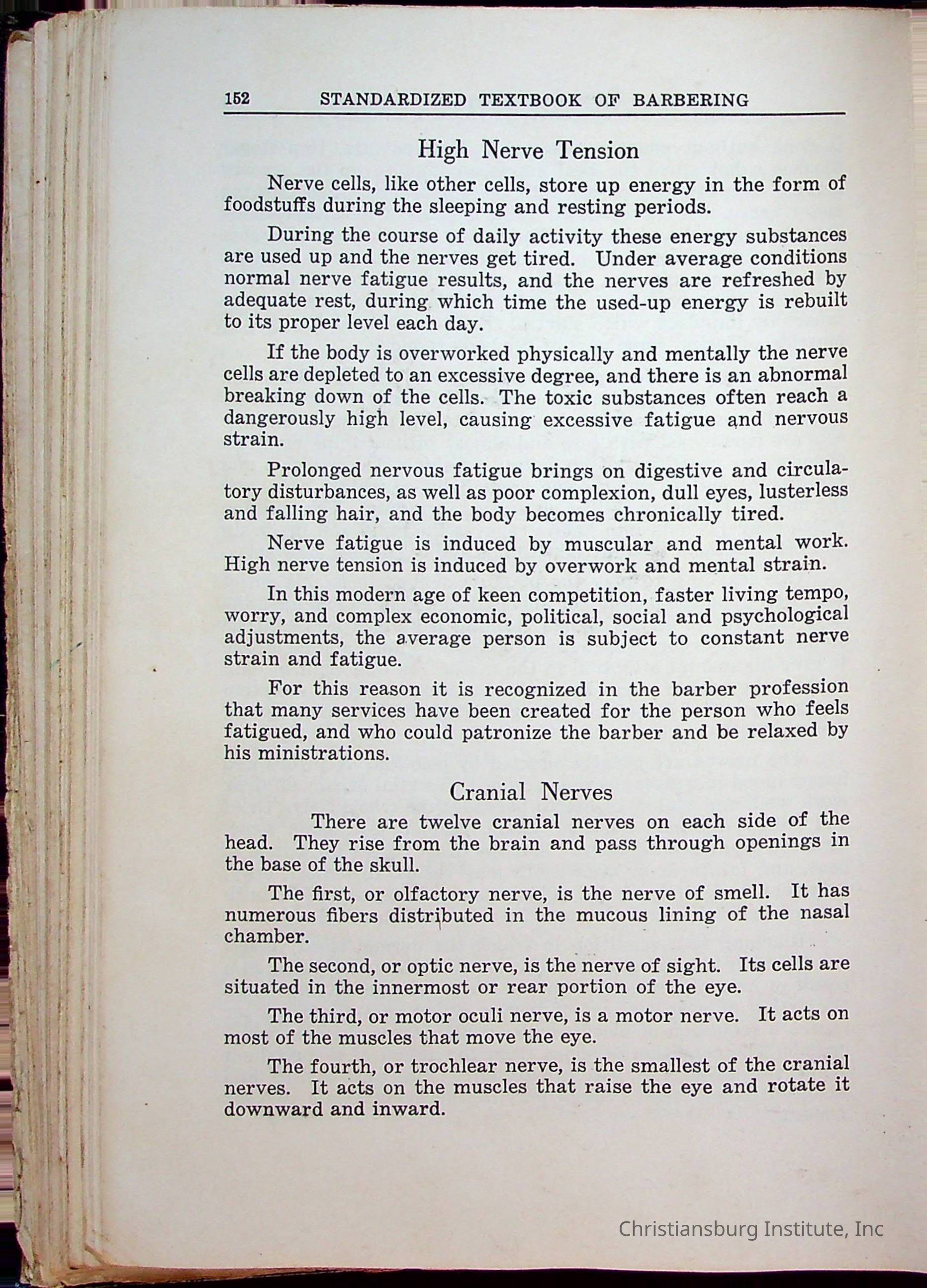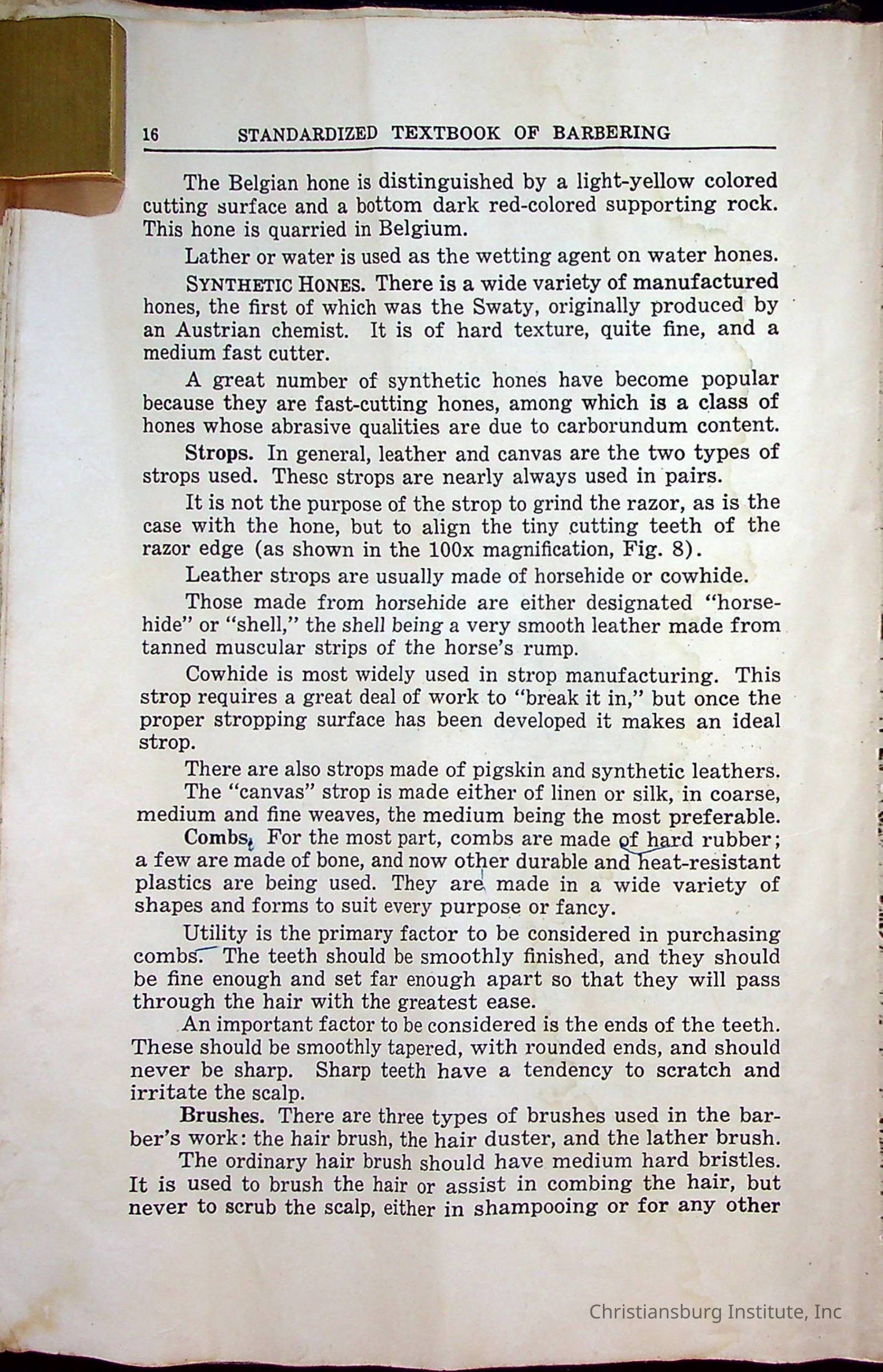 "Standardized Textbook of Barbering: in Two Parts" written and published by the Associated Master Barbers and Beauticians of America in the year 1950. This textbook was in the Christiansburg Institute library.