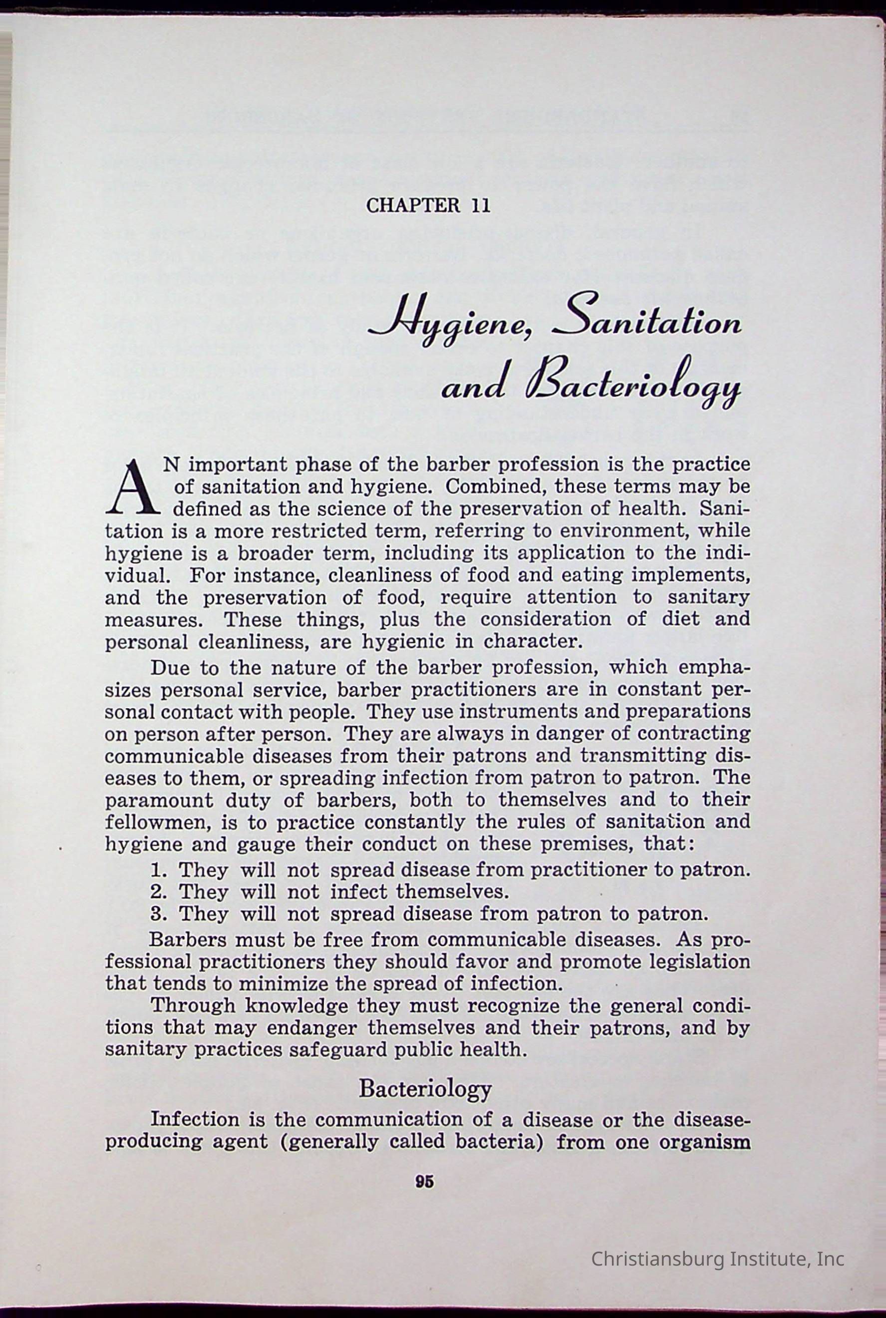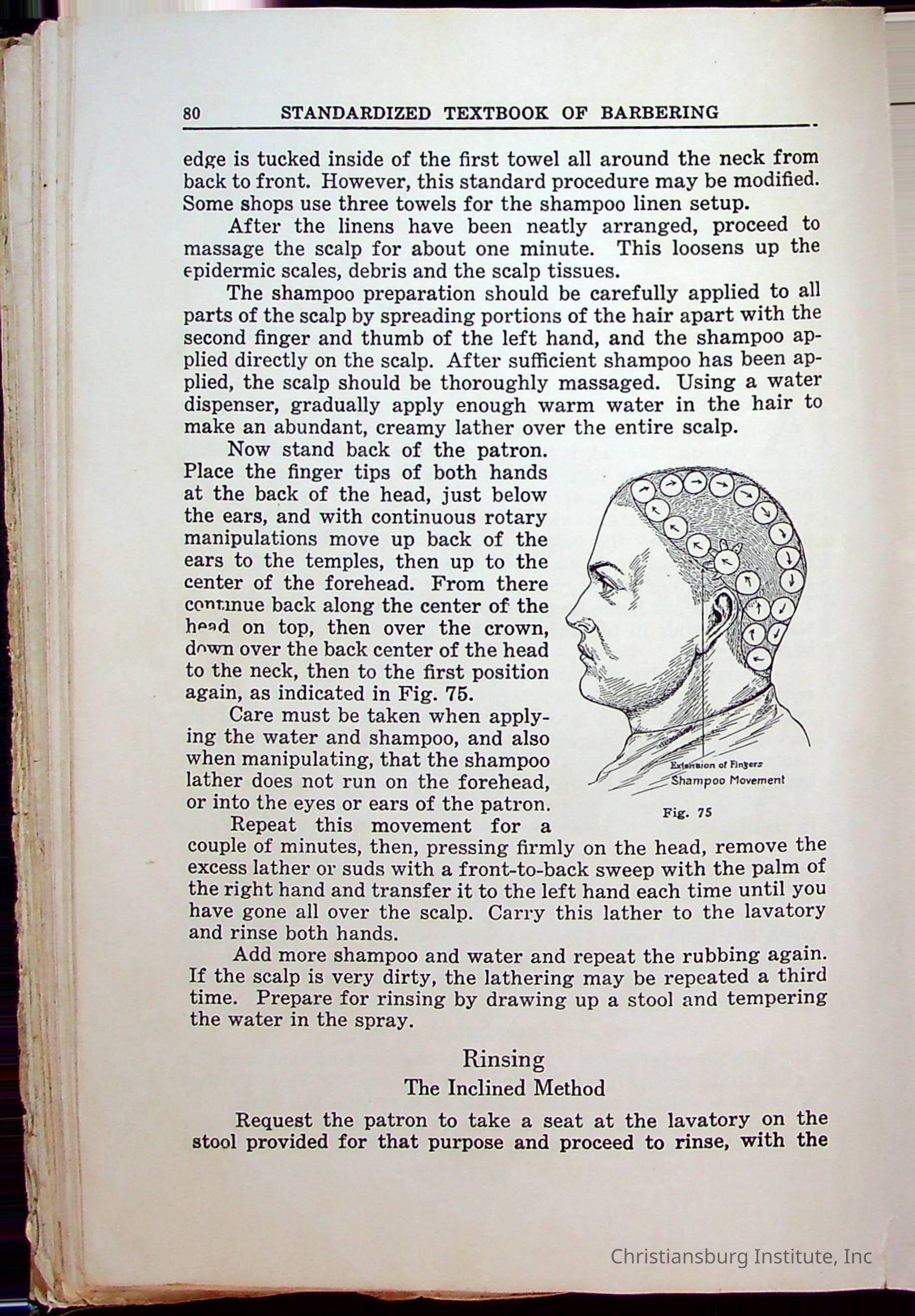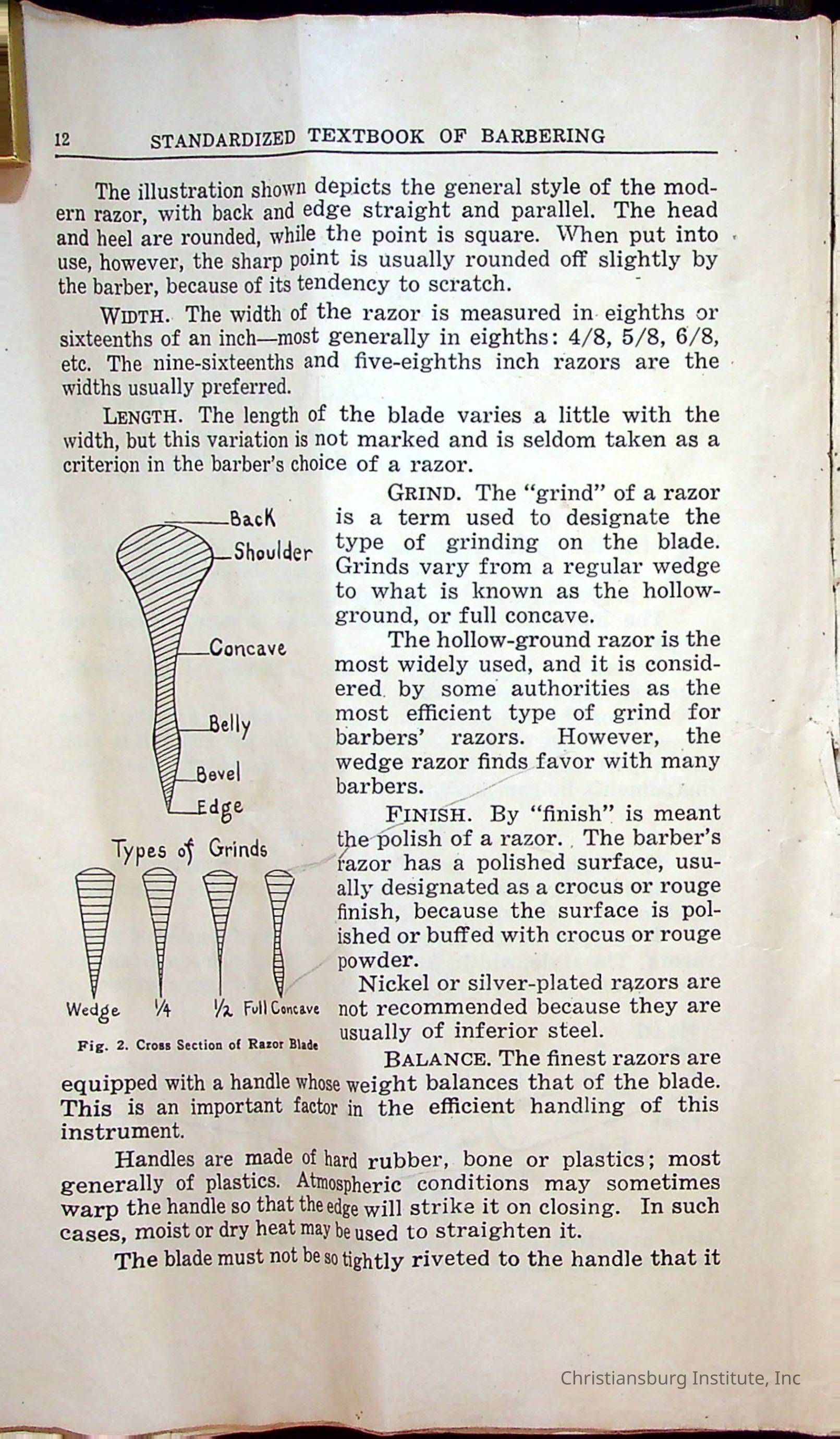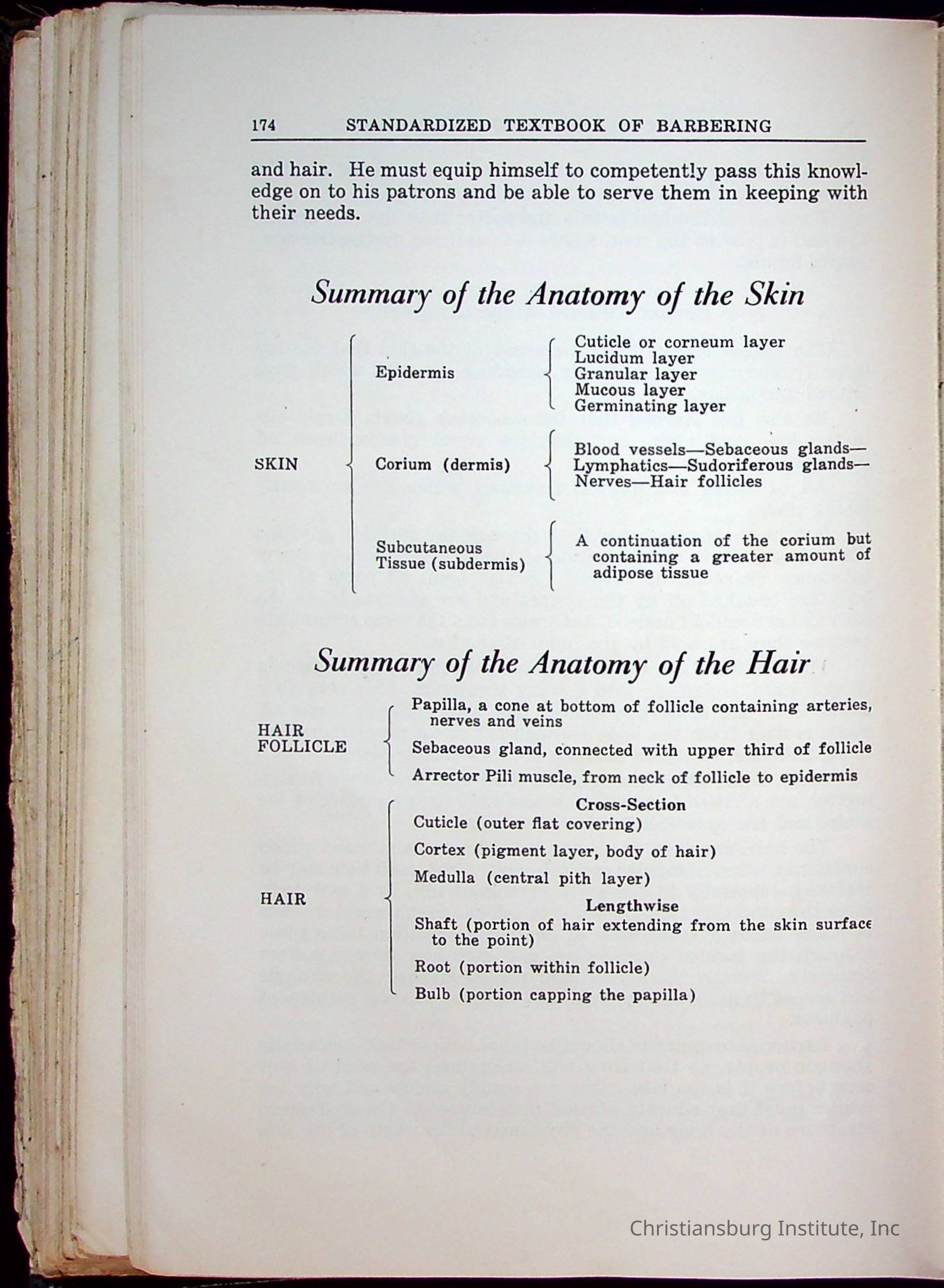 "Standardized Textbook of Barbering: in Two Parts" written and published by the Associated Master Barbers and Beauticians of America in the year 1950. This textbook was in the Christiansburg Institute library.