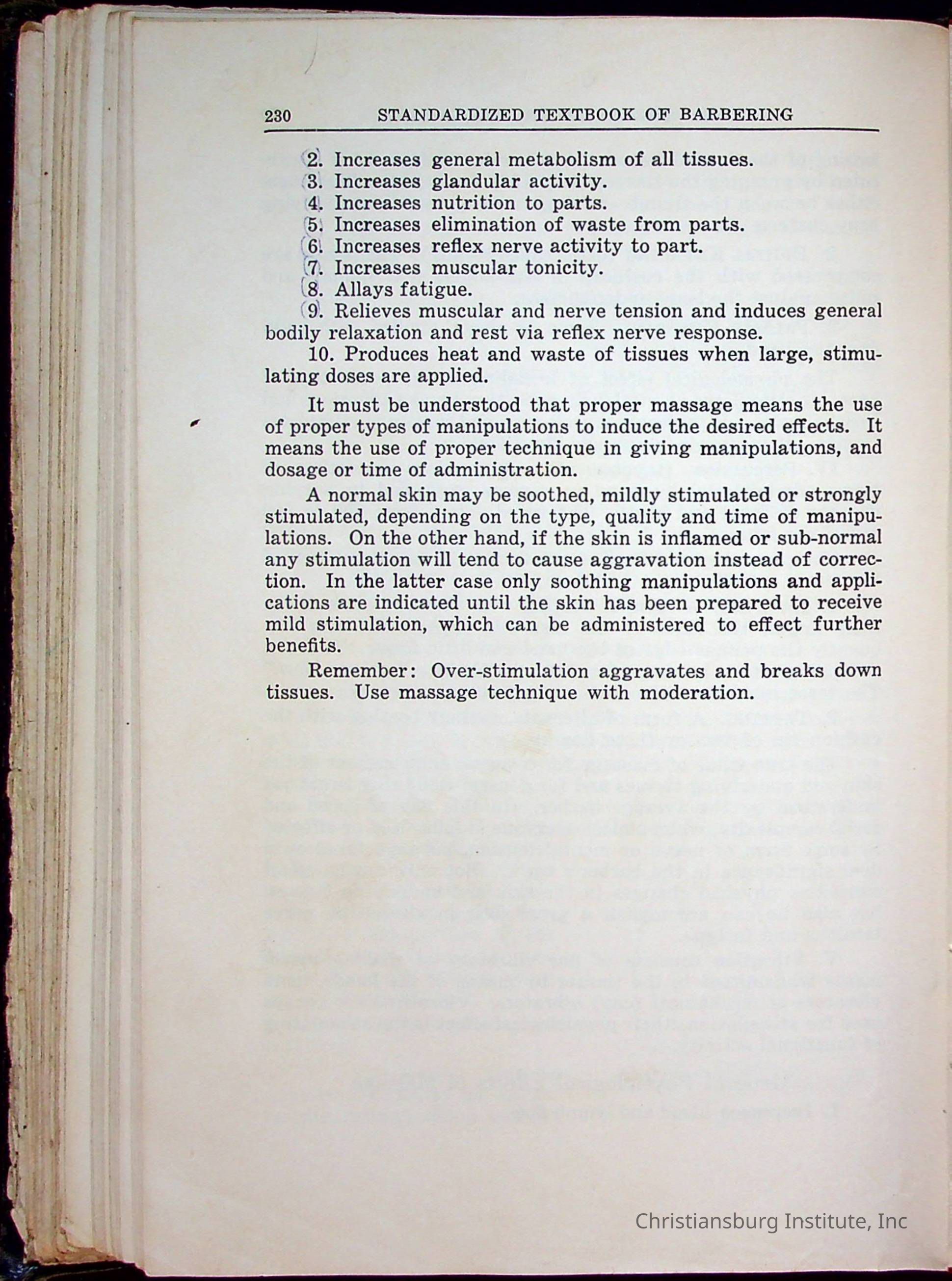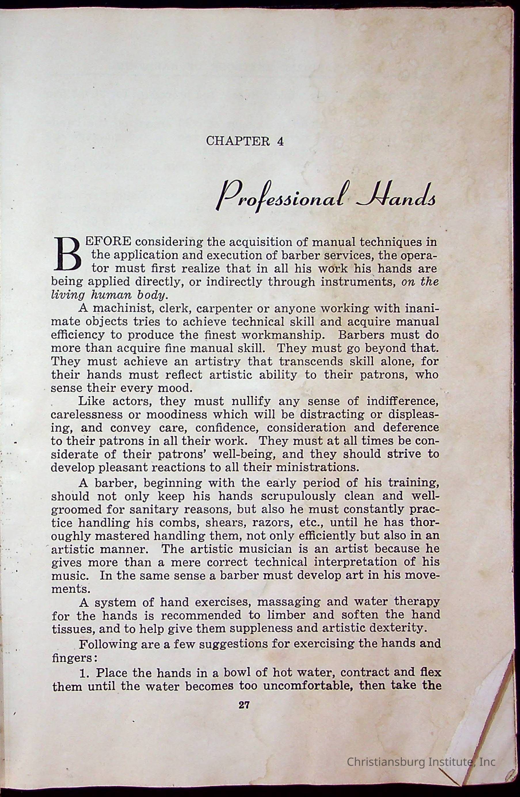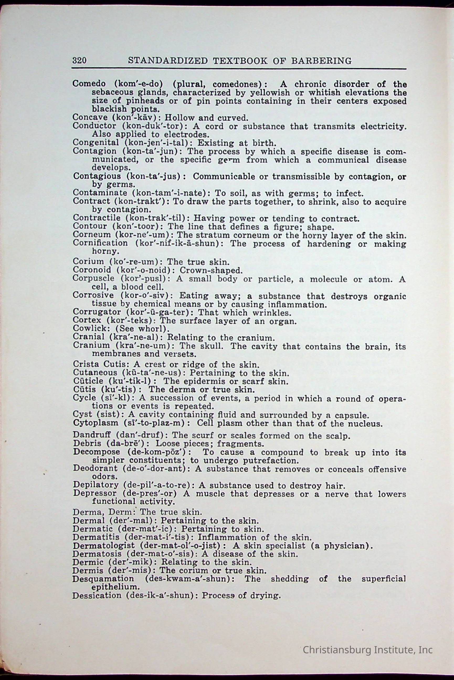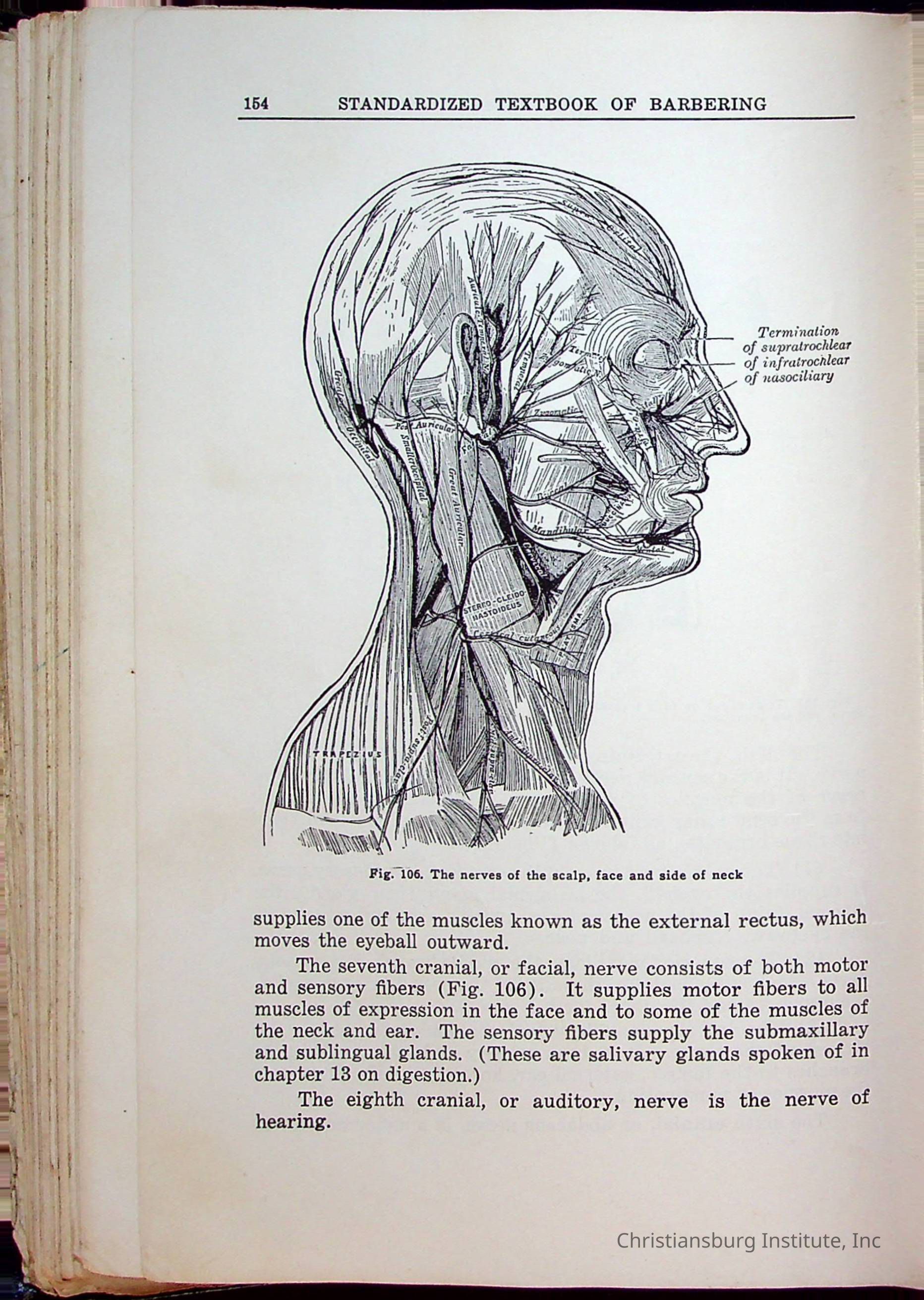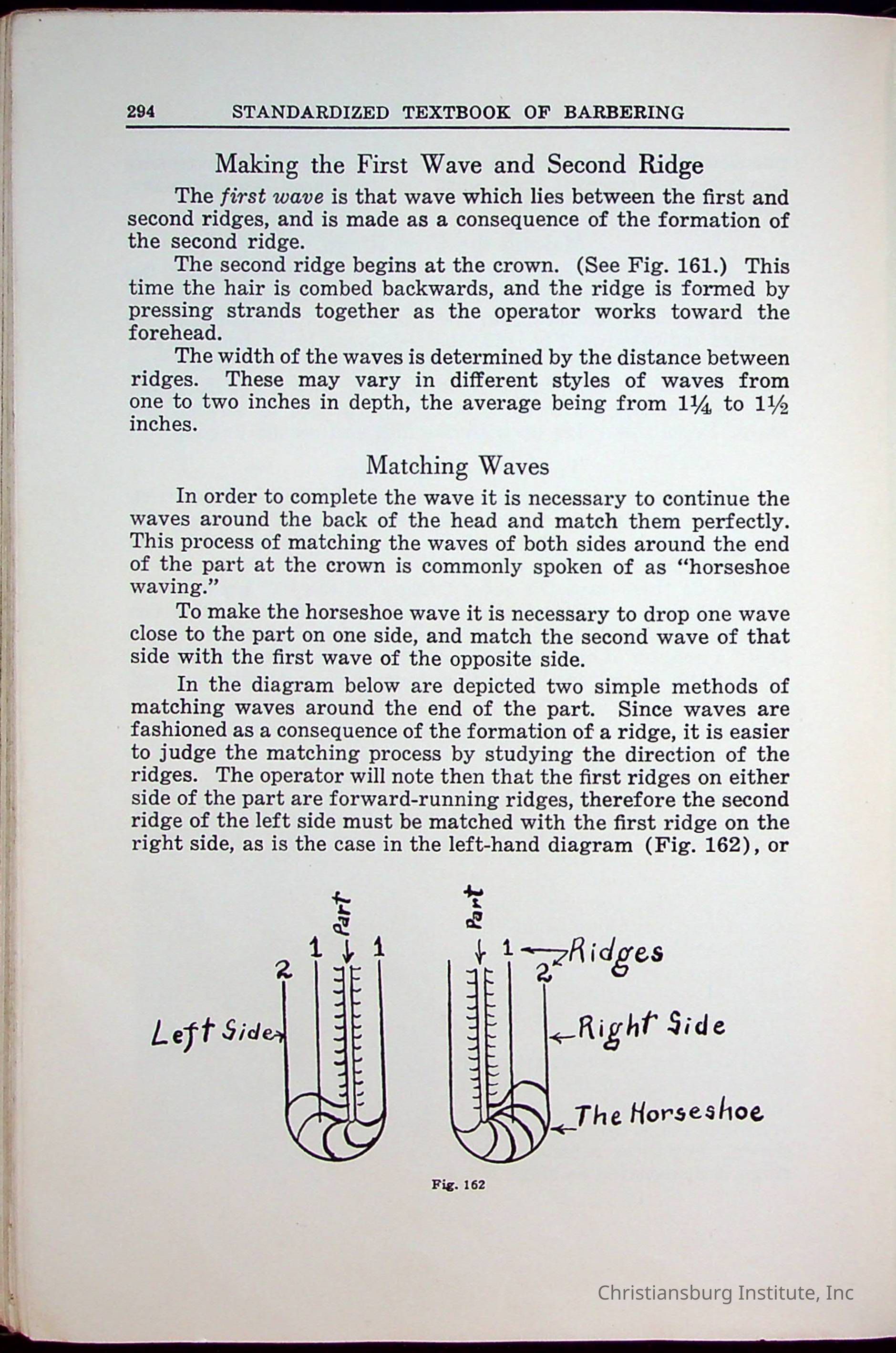 "Standardized Textbook of Barbering: in Two Parts" written and published by the Associated Master Barbers and Beauticians of America in the year 1950. This textbook was in the Christiansburg Institute library.