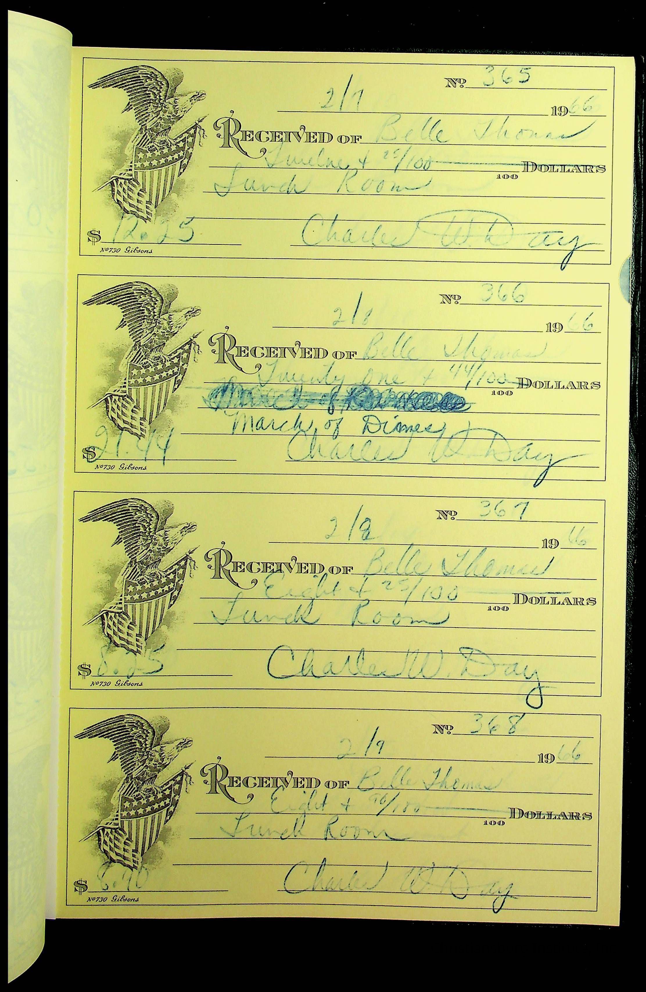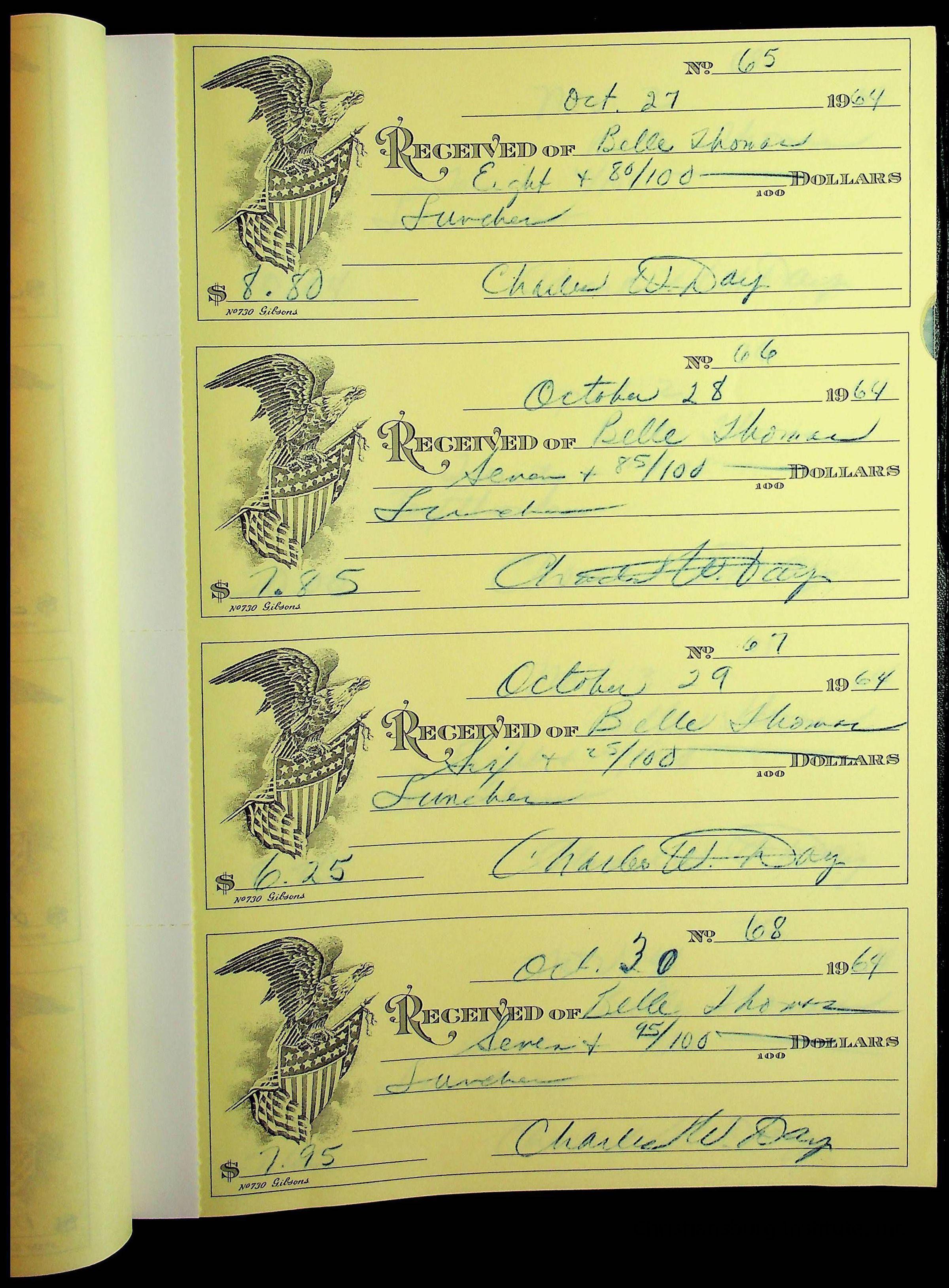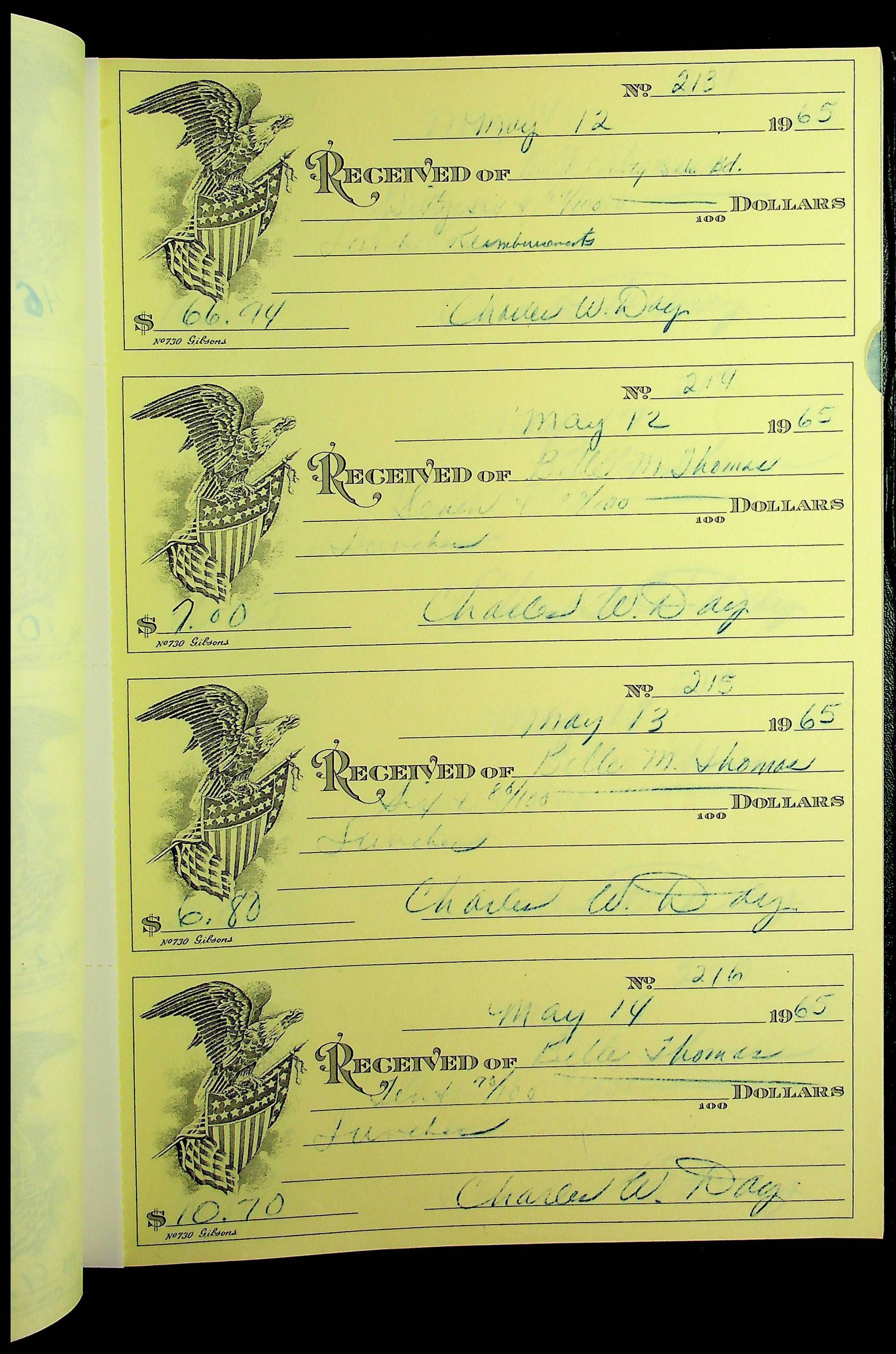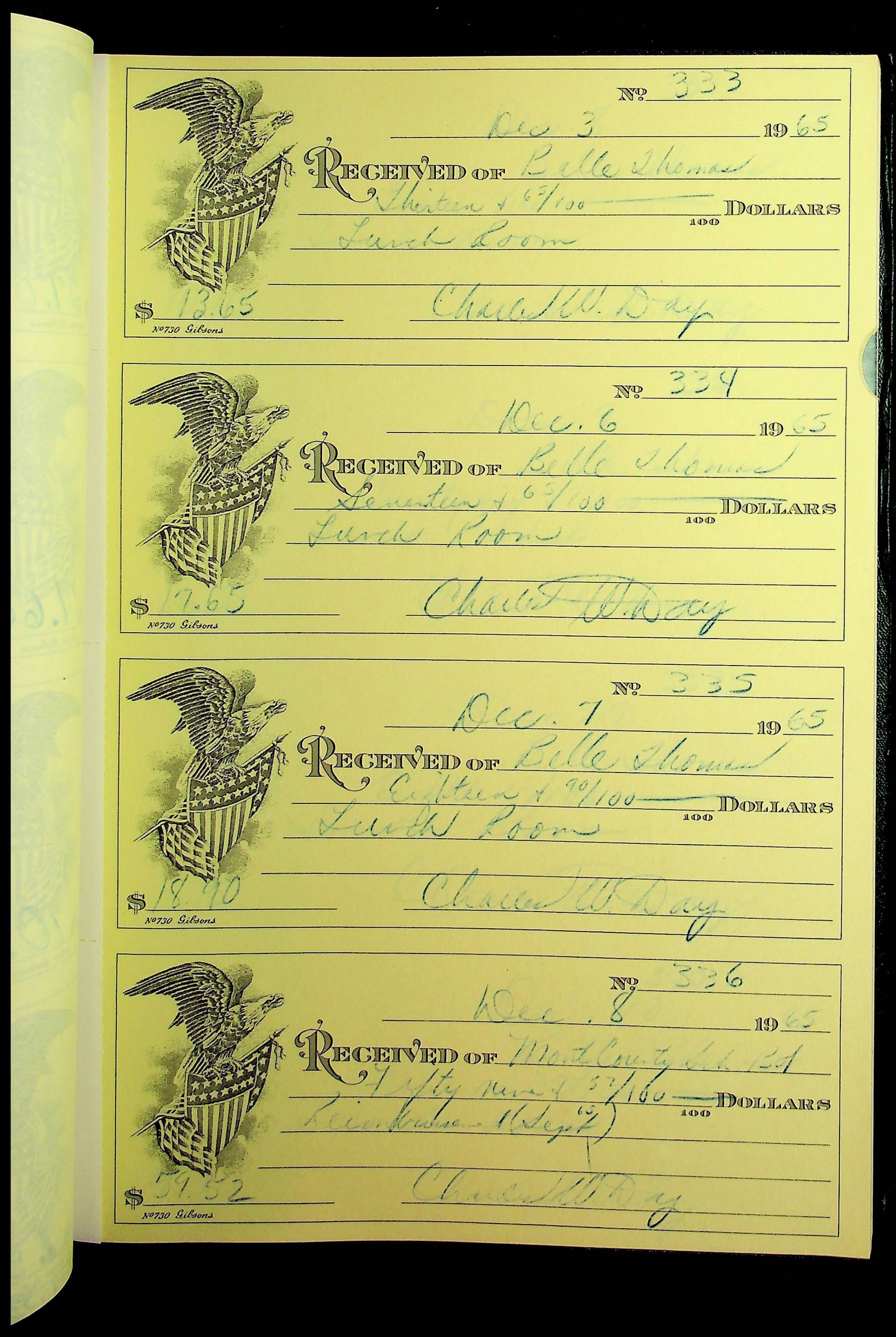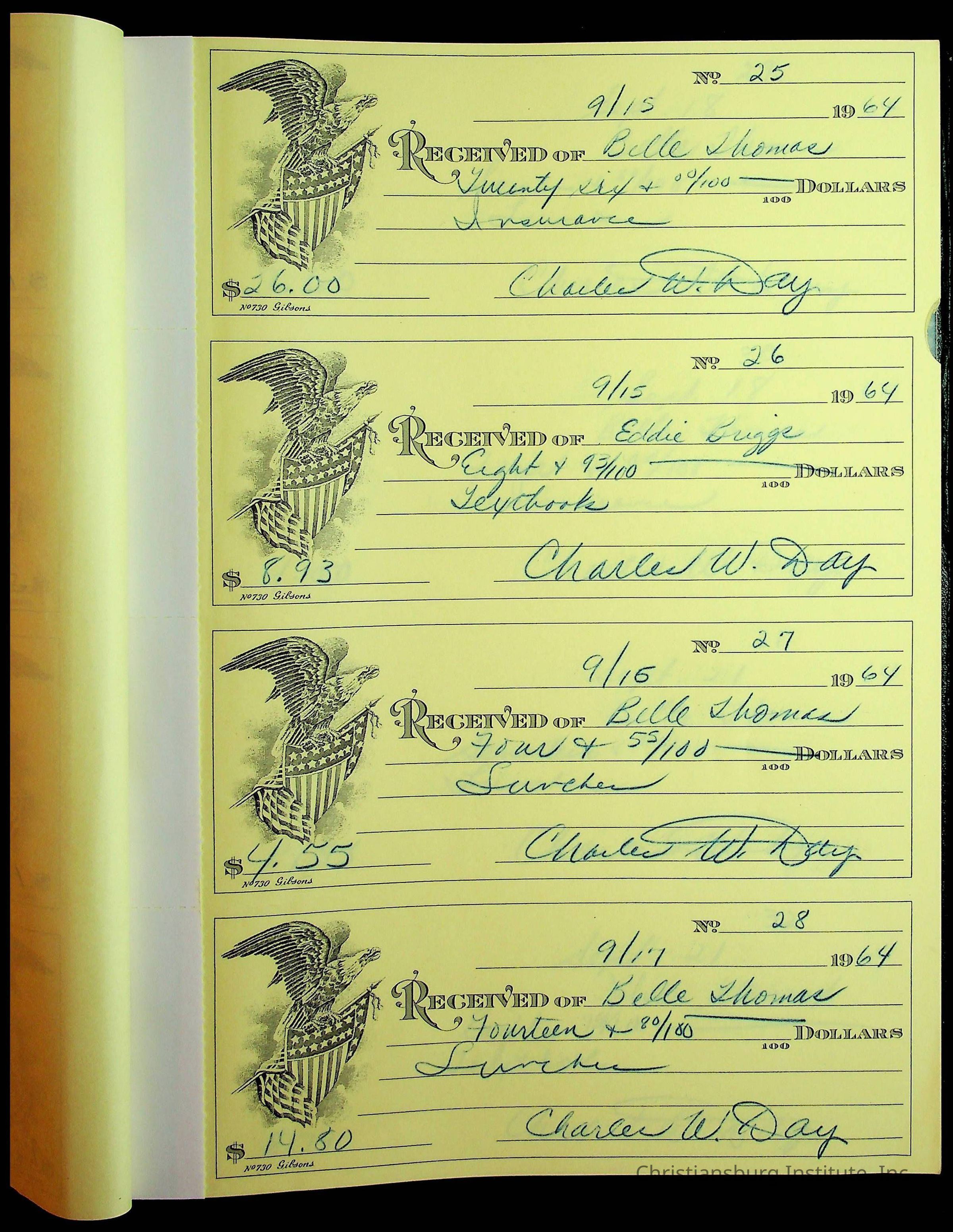 A receipt book manufactured by J.P. Bell company and used by Christiansburg Institute to document expenses and receipts from 1964 through 1966.