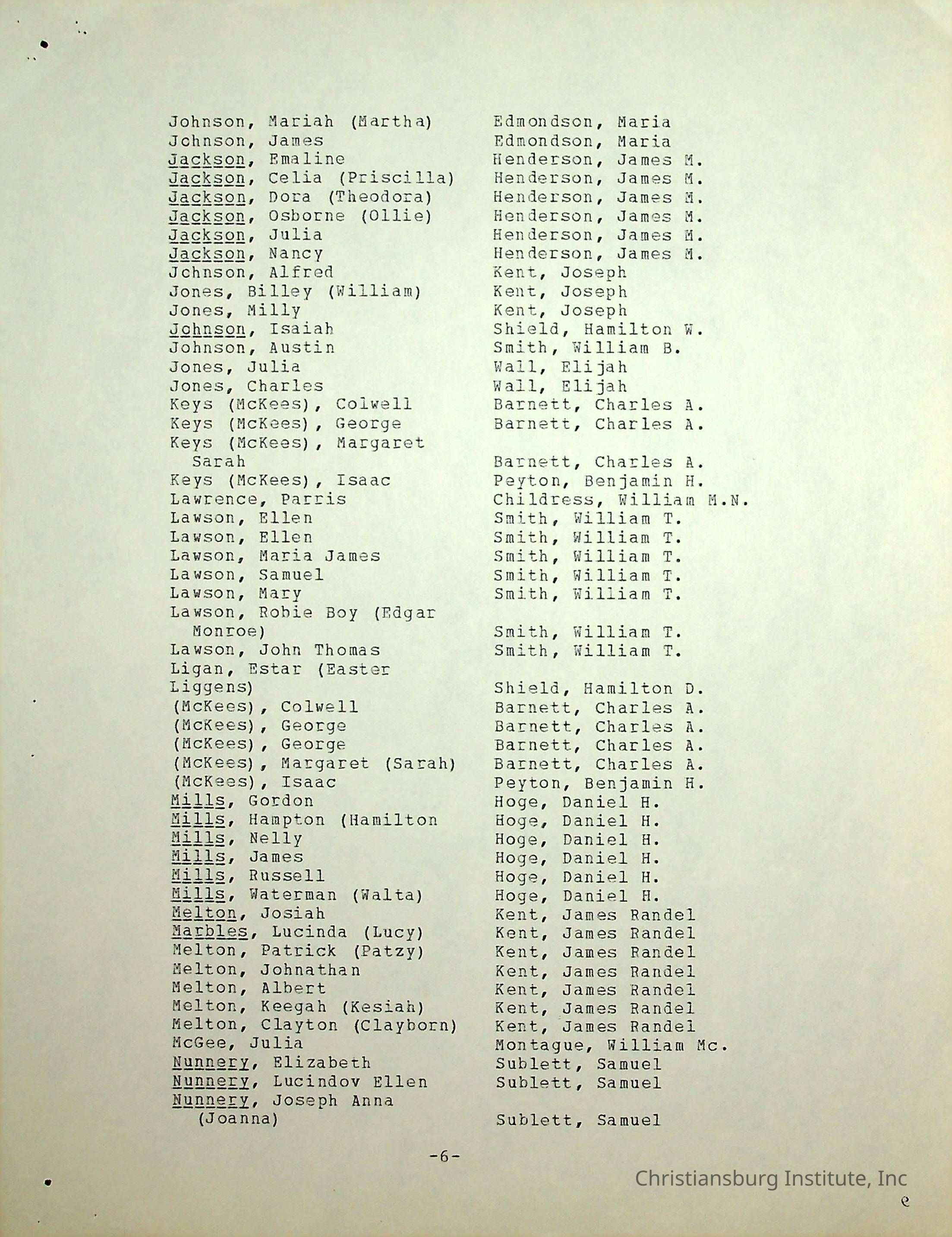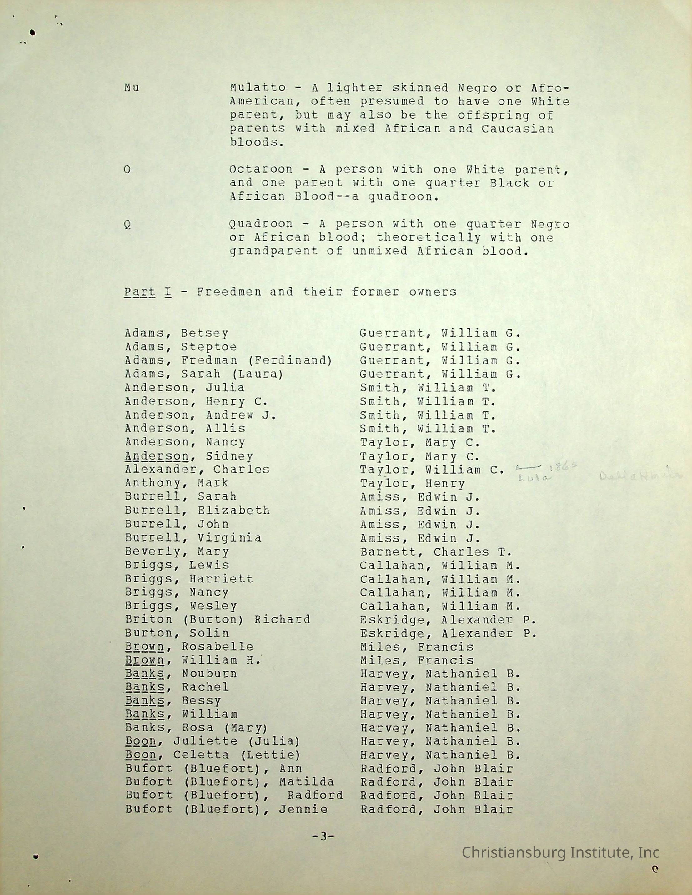 The "Freedmen Identifiers," a discussion draft of a community development study by Richard B. Dickenson for the Ad Hoc Committee for Christiansburg Industrial Institute Historical Landmark Designation, dated December 10th, 1977. This paper contains names, ages, and owners of enslaved peoples in Montgomery County, Virginia from the 1860s.Collection