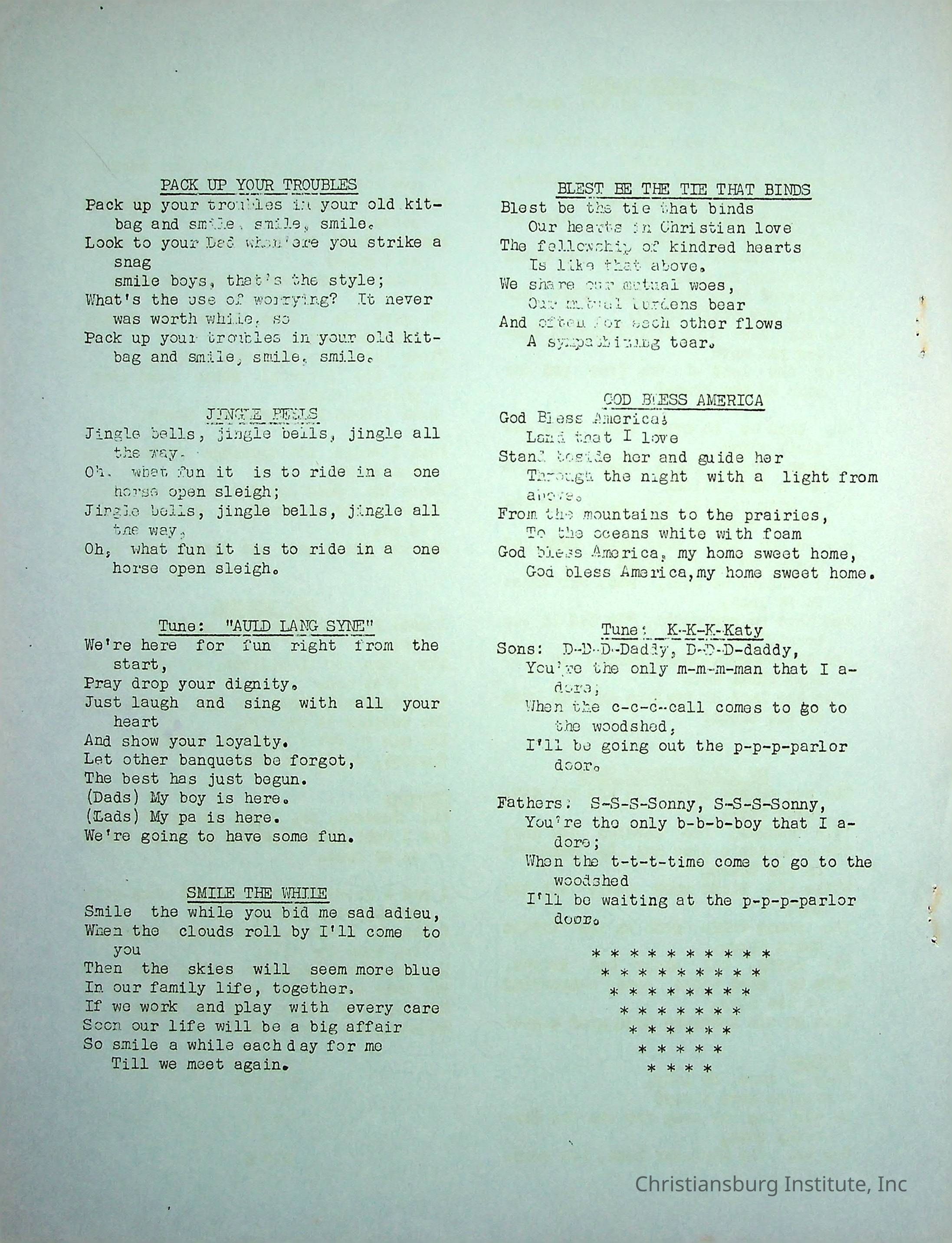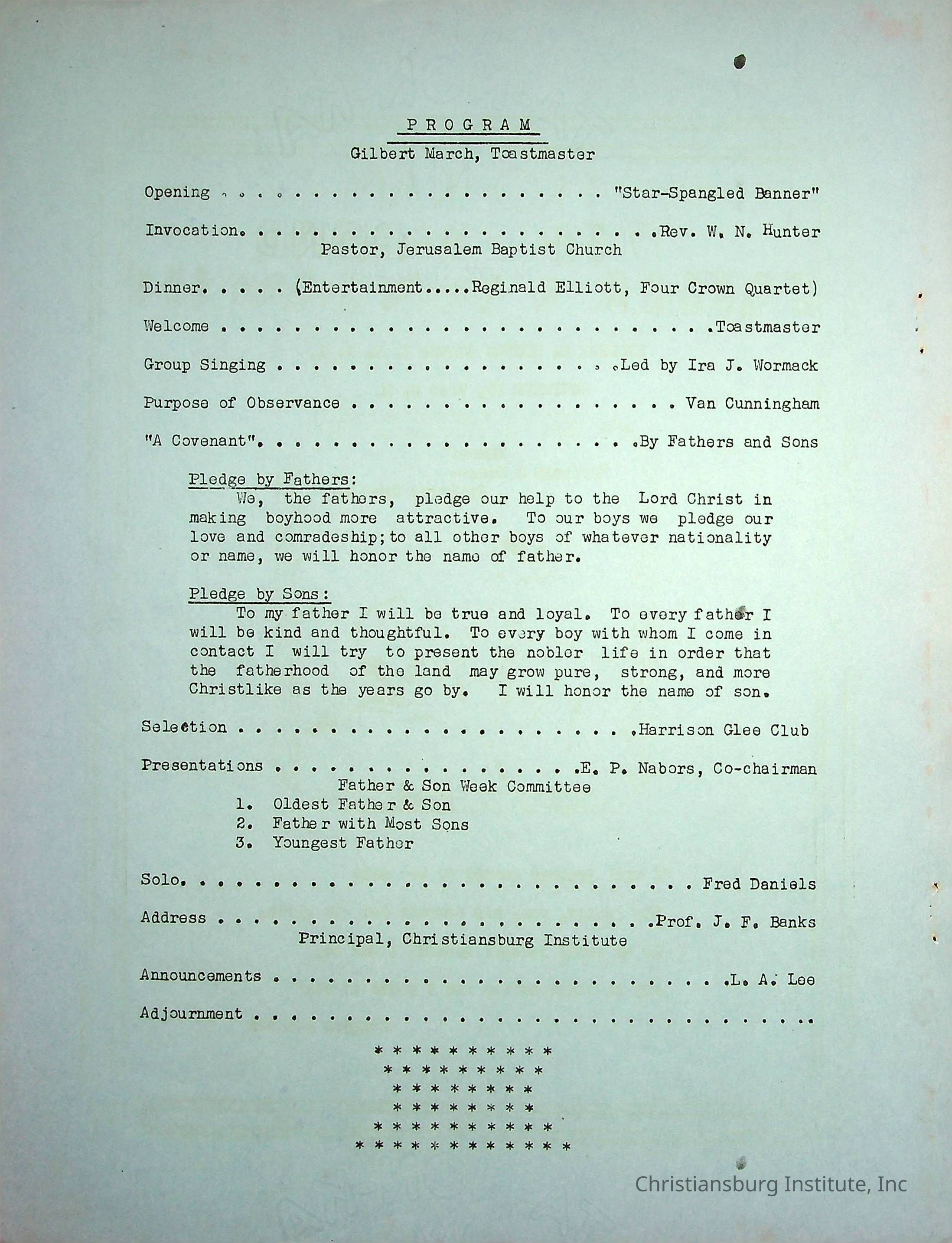 An event program for the 17th annual father and son banquet at the William A. Hunton YMCA Branch on November 17th. Christiansburg Institute principal, John F. Banks spoke an address at this event.Creator