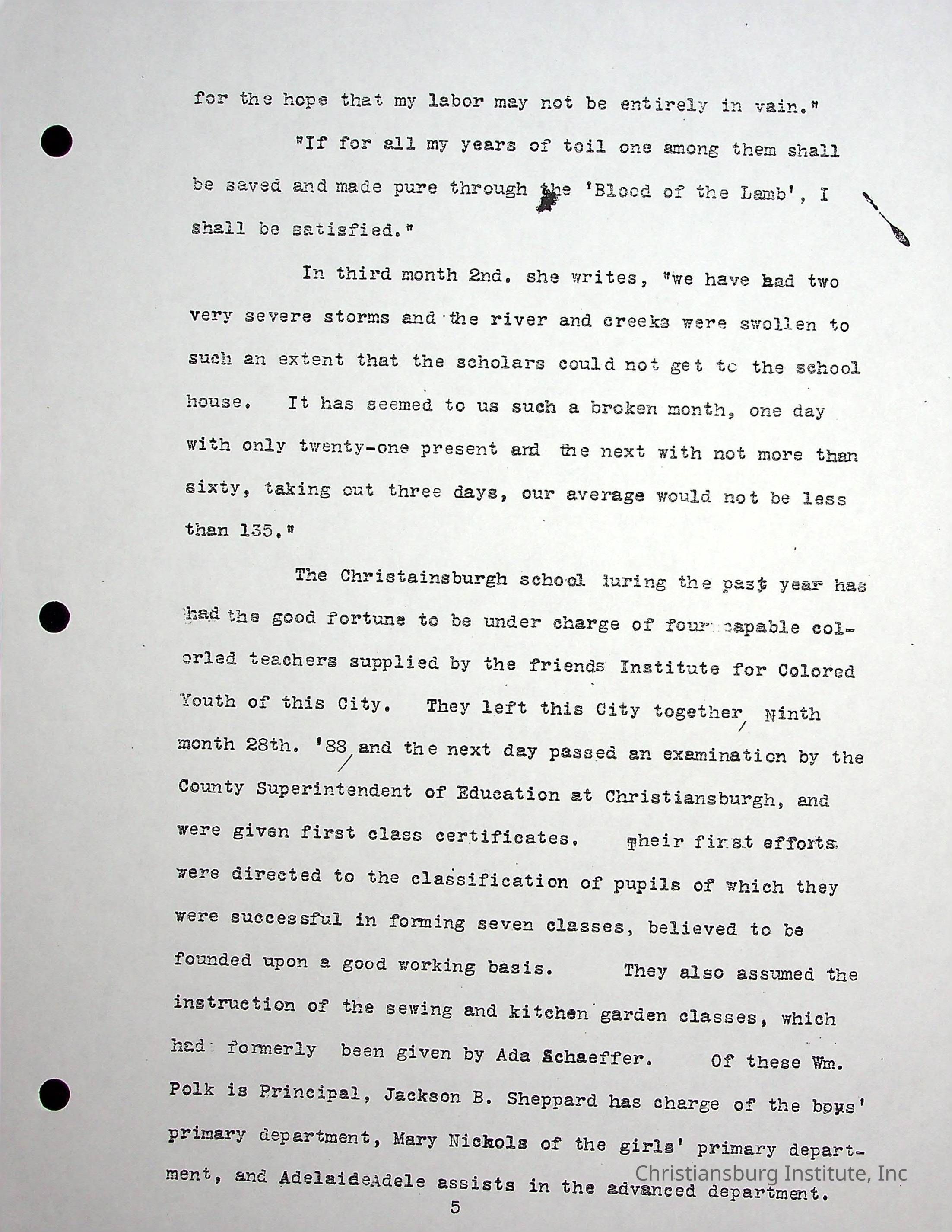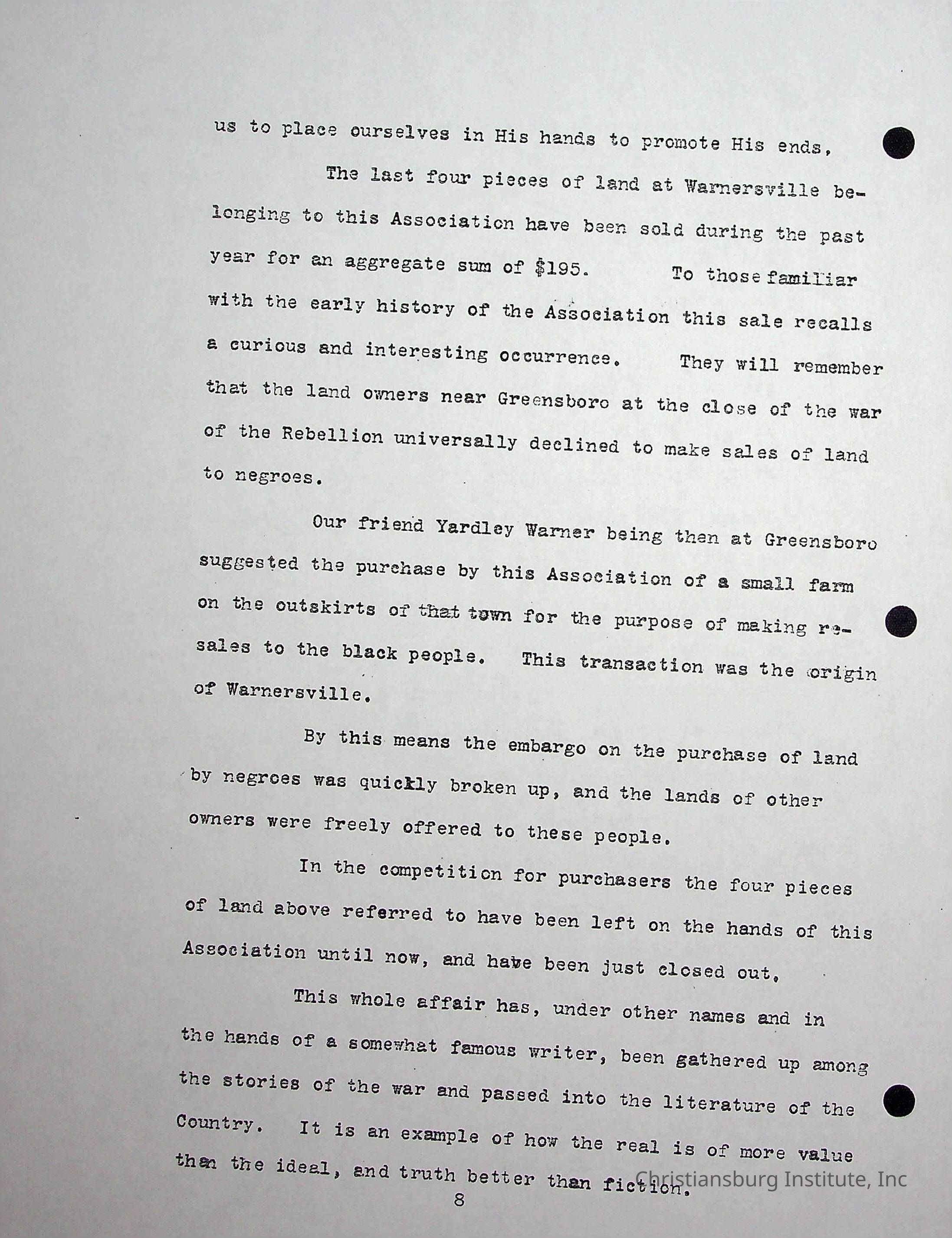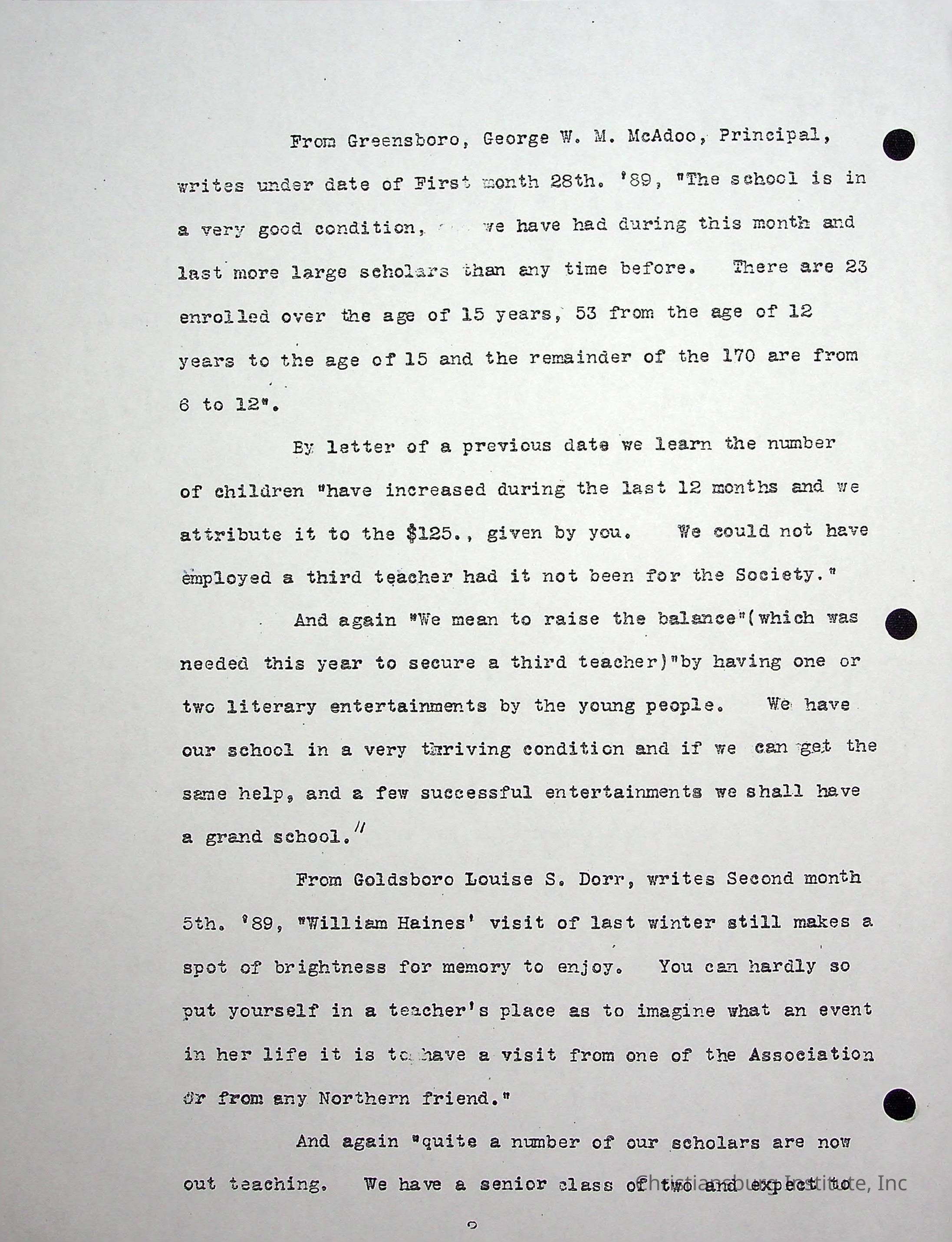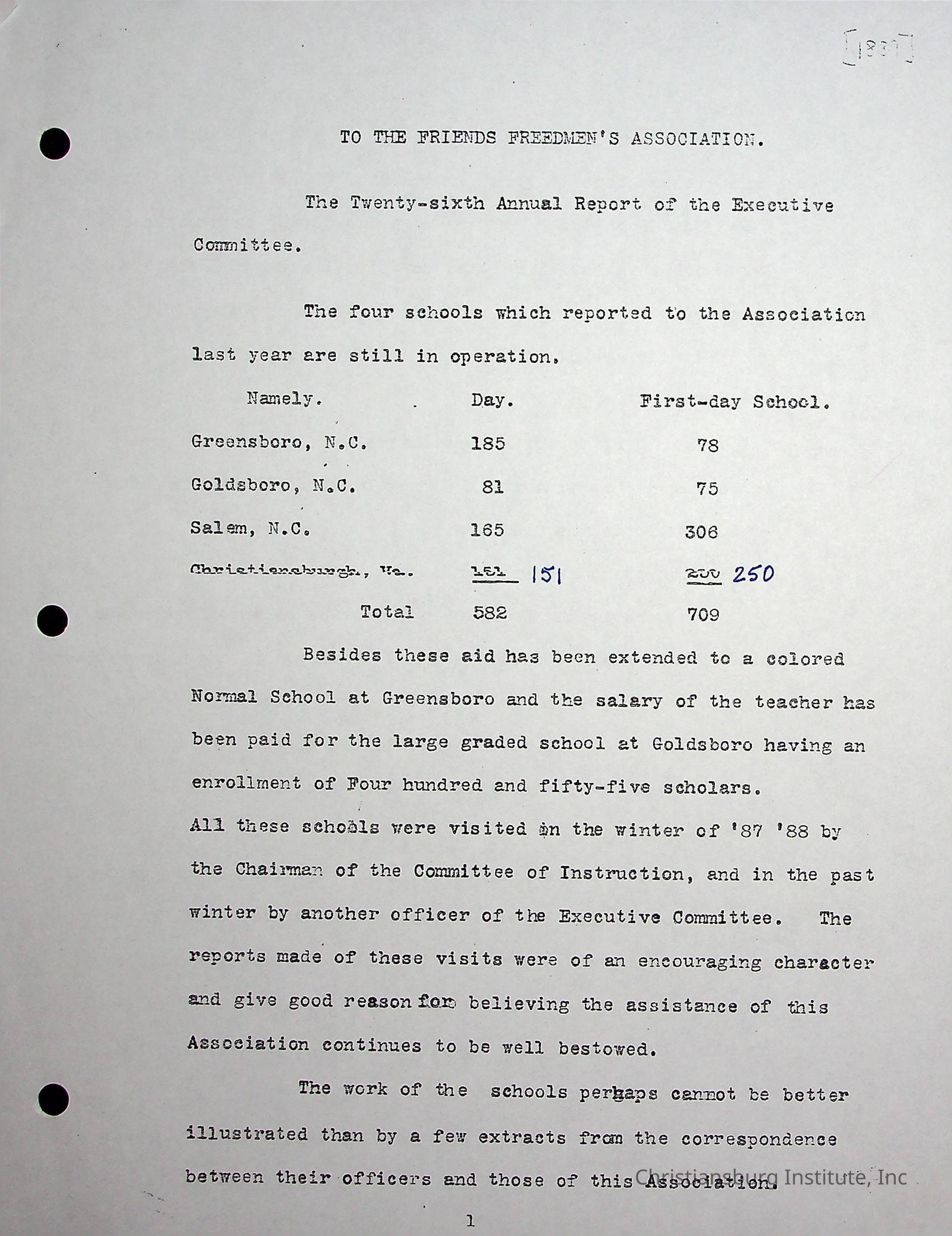 A photocopy version of the 1889 Annual Report of the Friends Freedmen's Association from the executive committee. This report includes Christiansburg Industrial Institute and is dated 1889.Collection