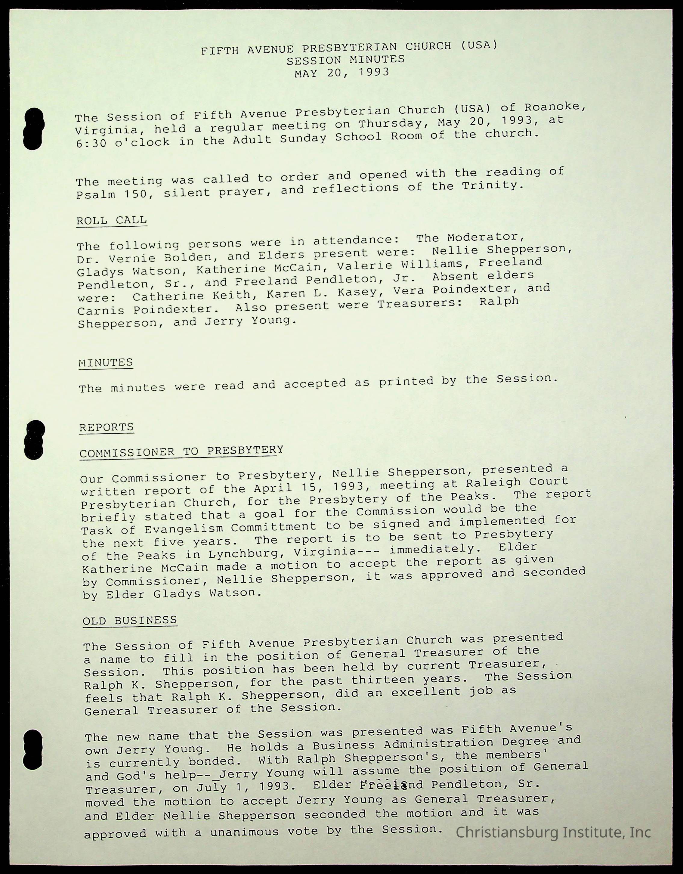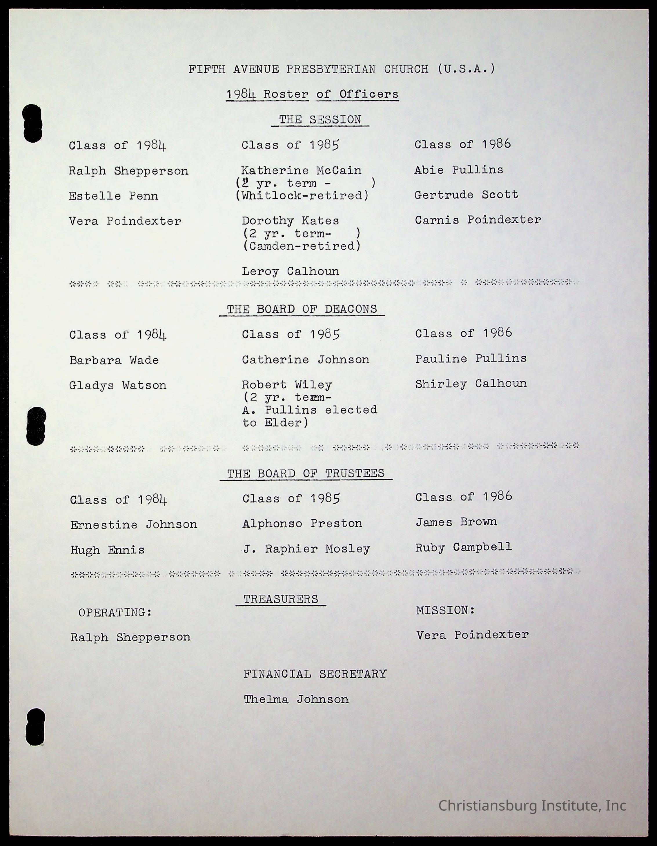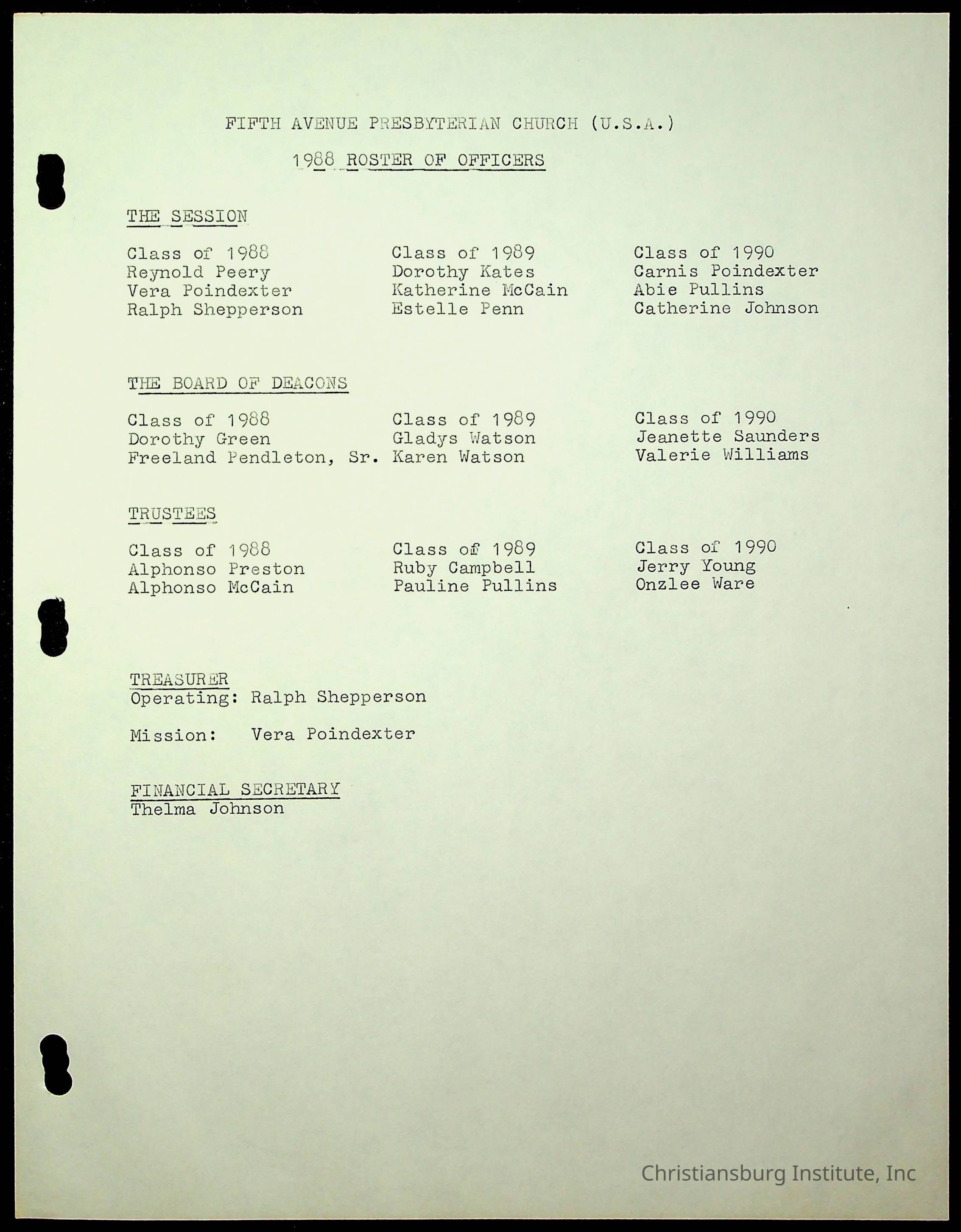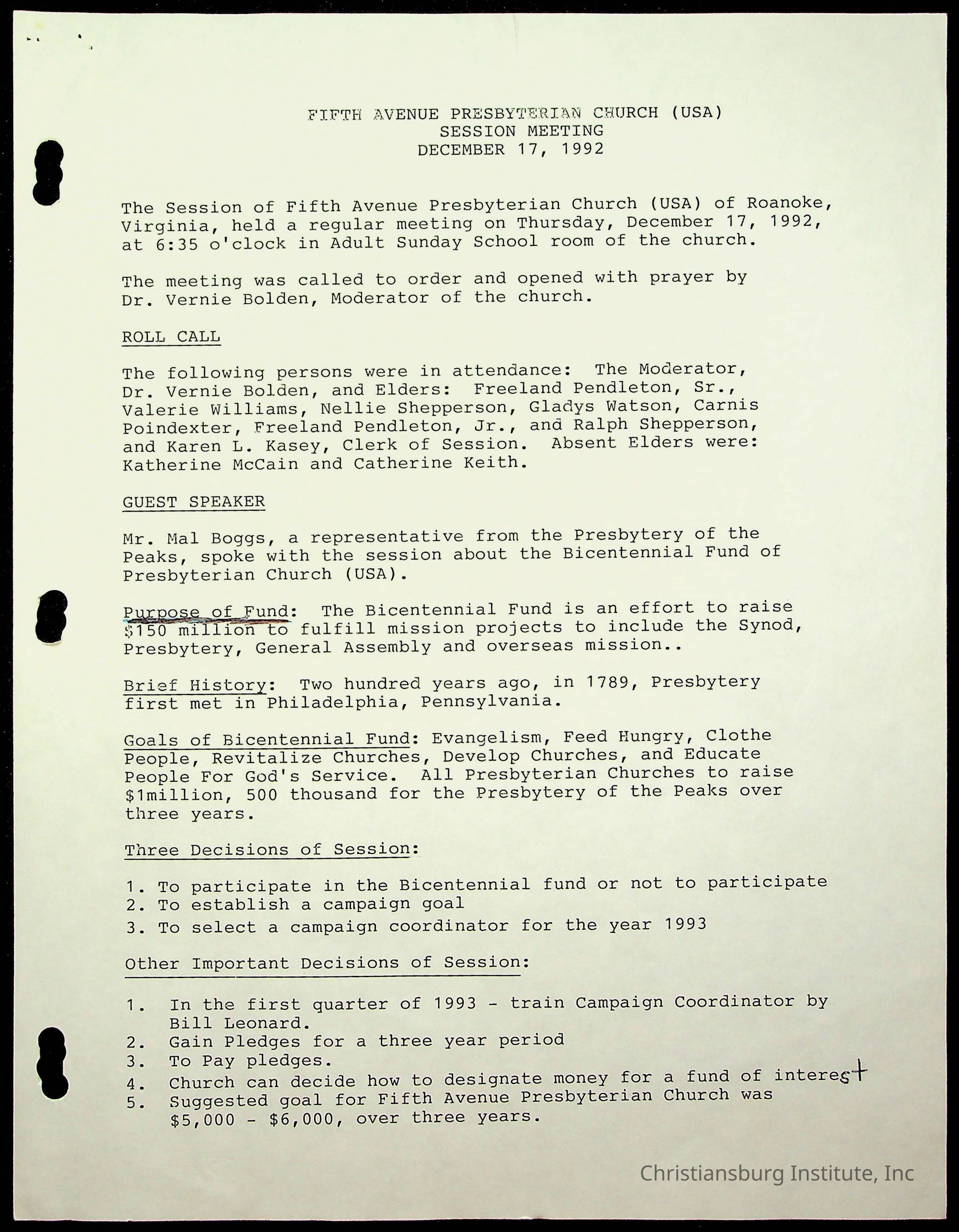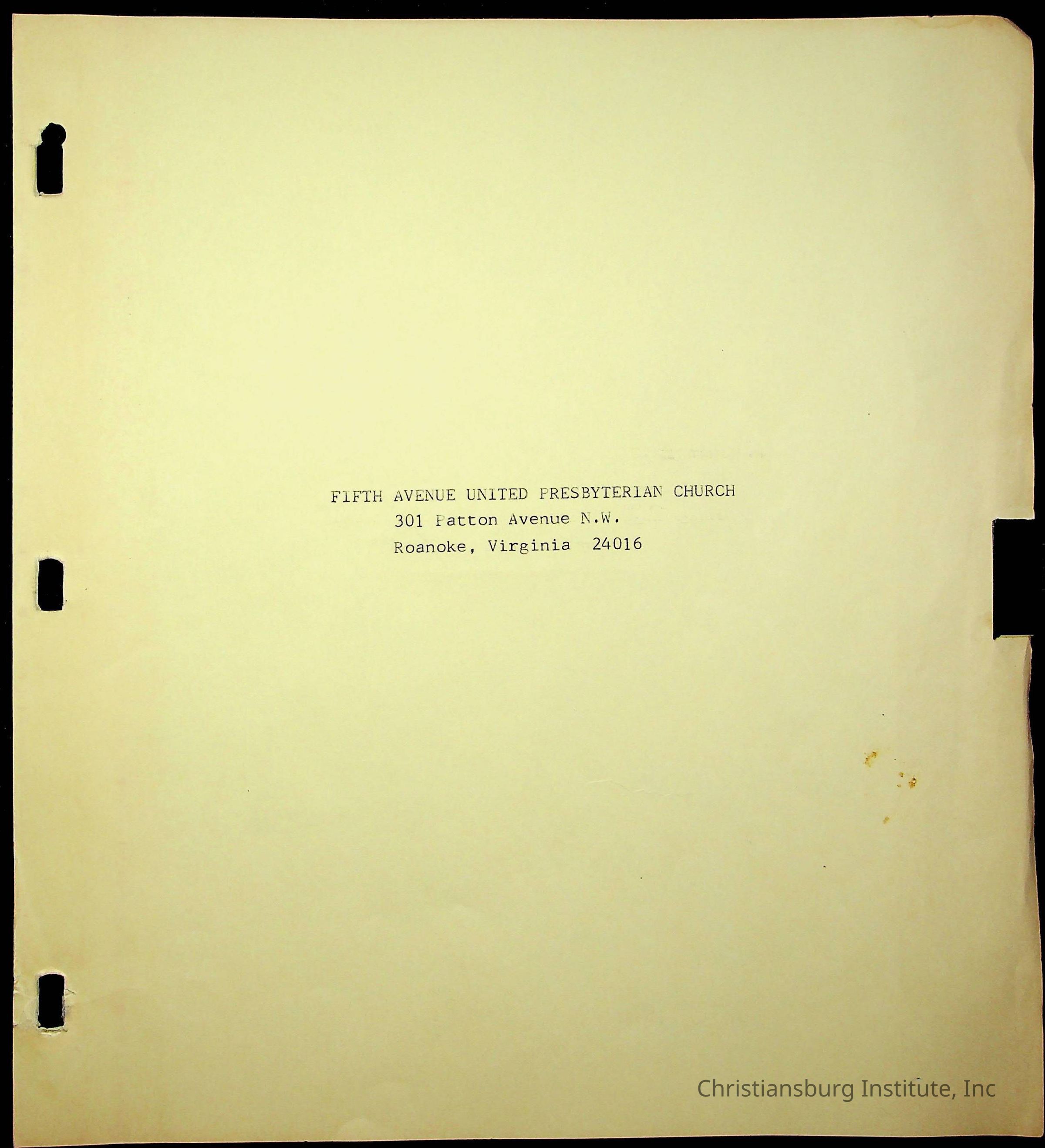 Copyright has been assigned to Christiansburg Institute Museum & Archives by Fifth Avenue Presbyterian Church. For permission to publish materials created by the donor, contact CIMA@christiansburginstitute.com. Materials not created by Fifth Avenue Presbyterian Church may still be under copyright.