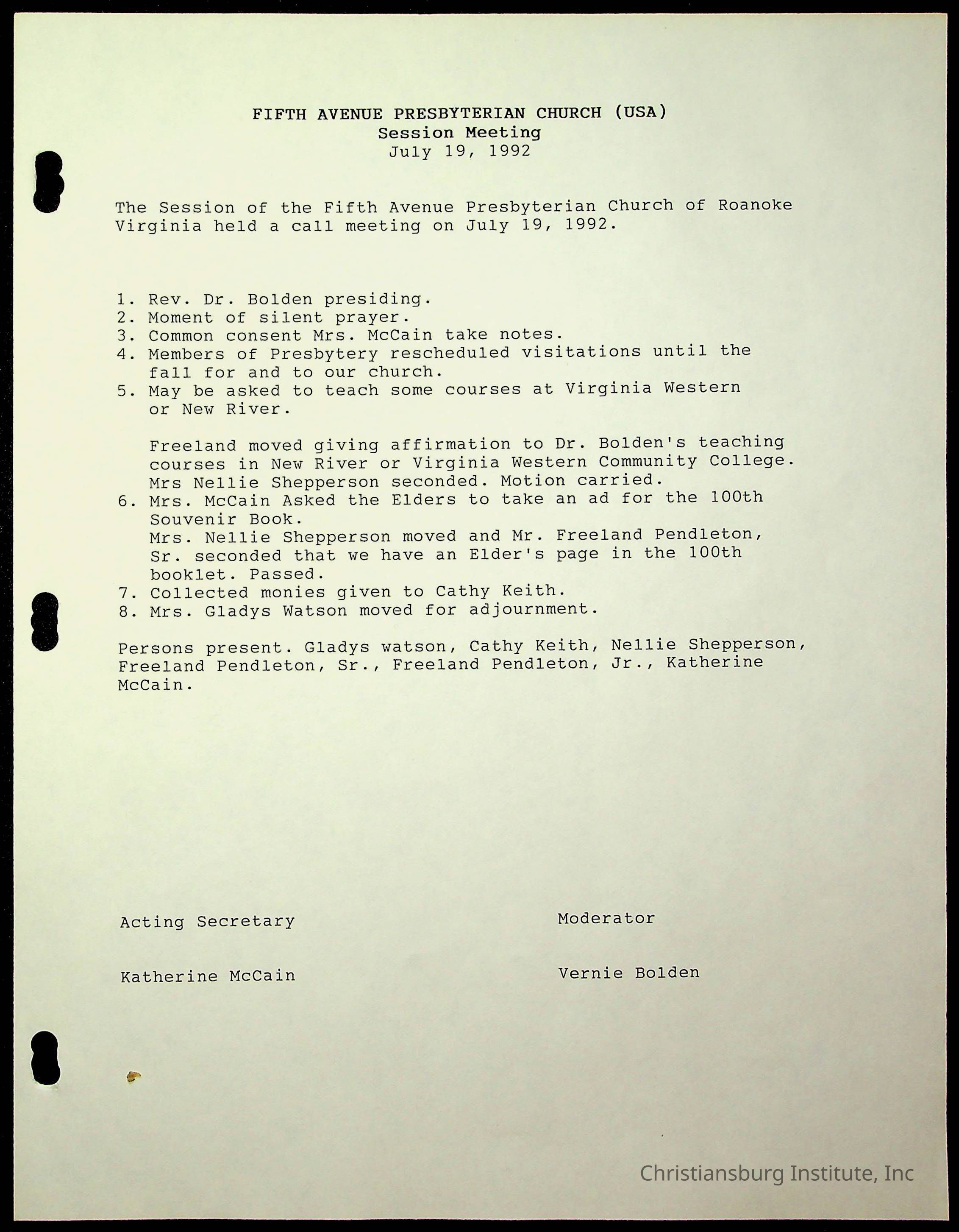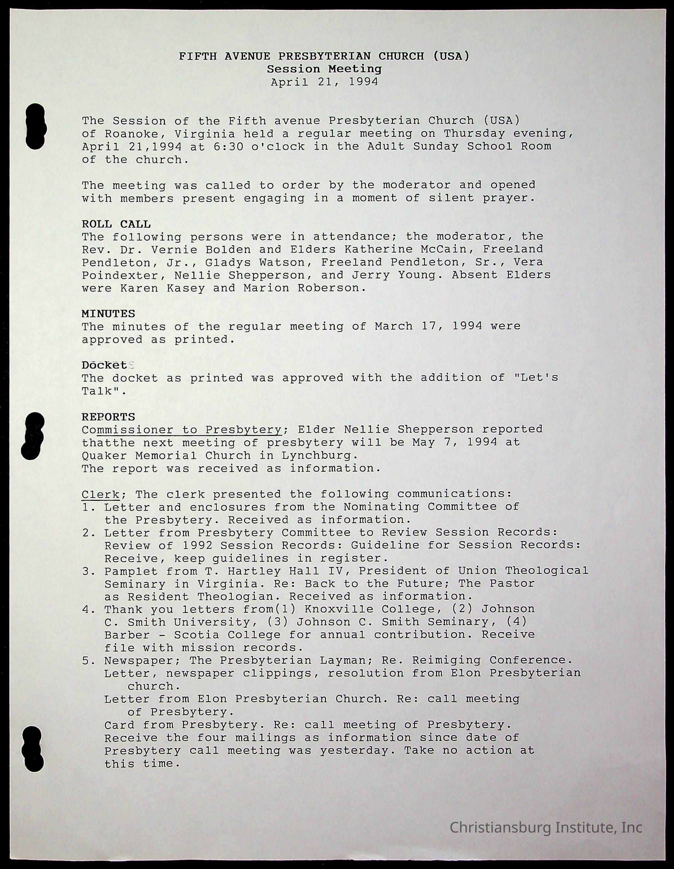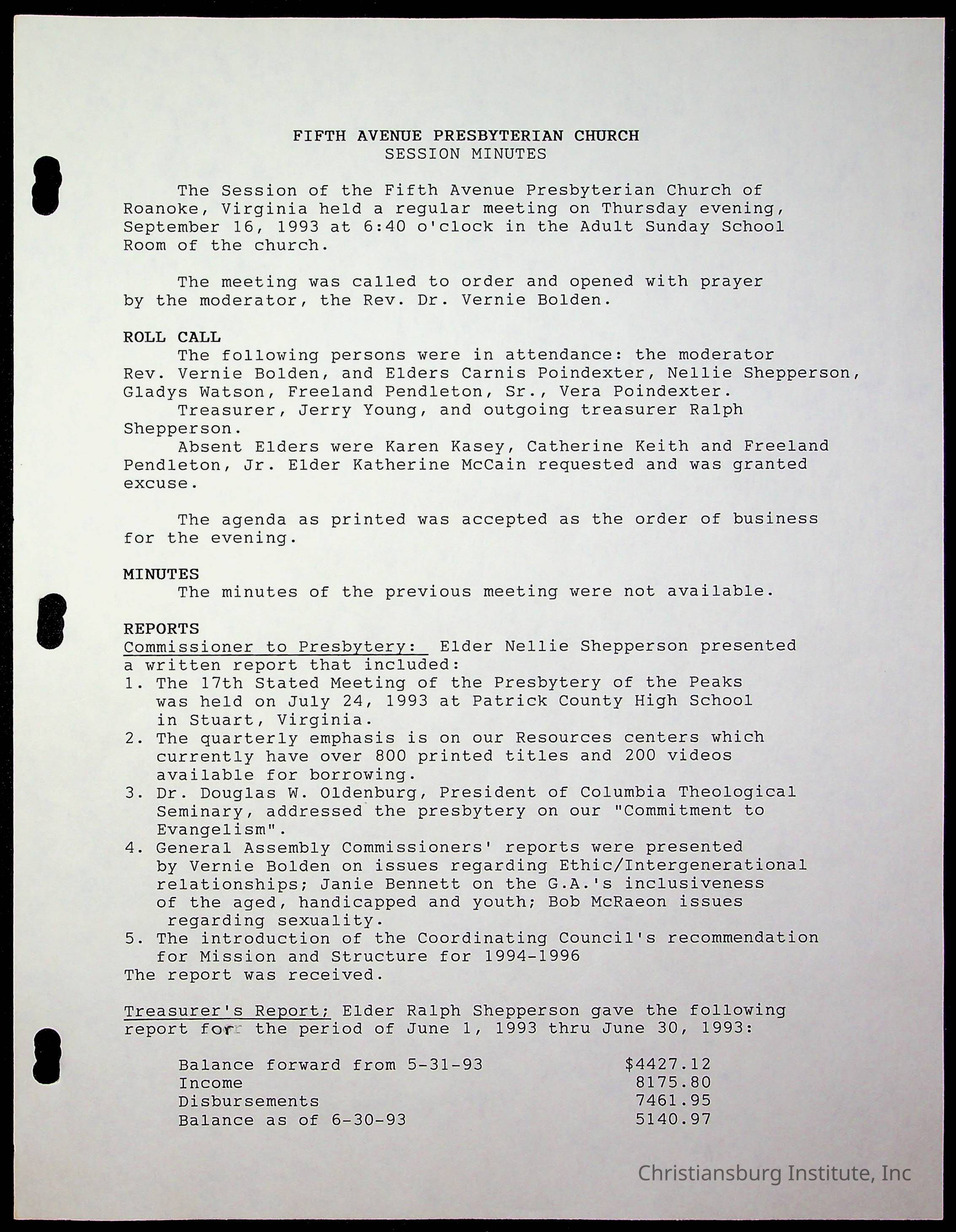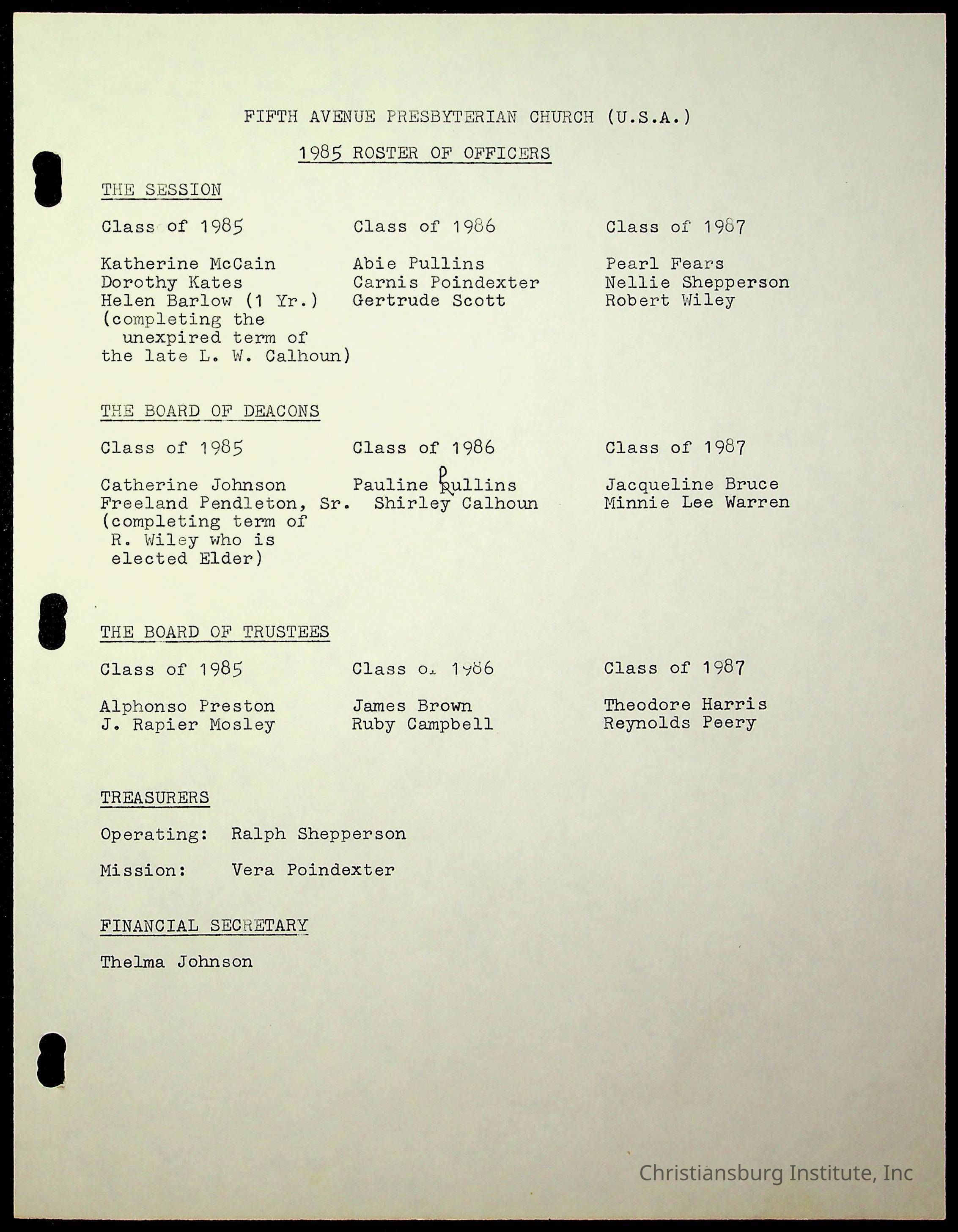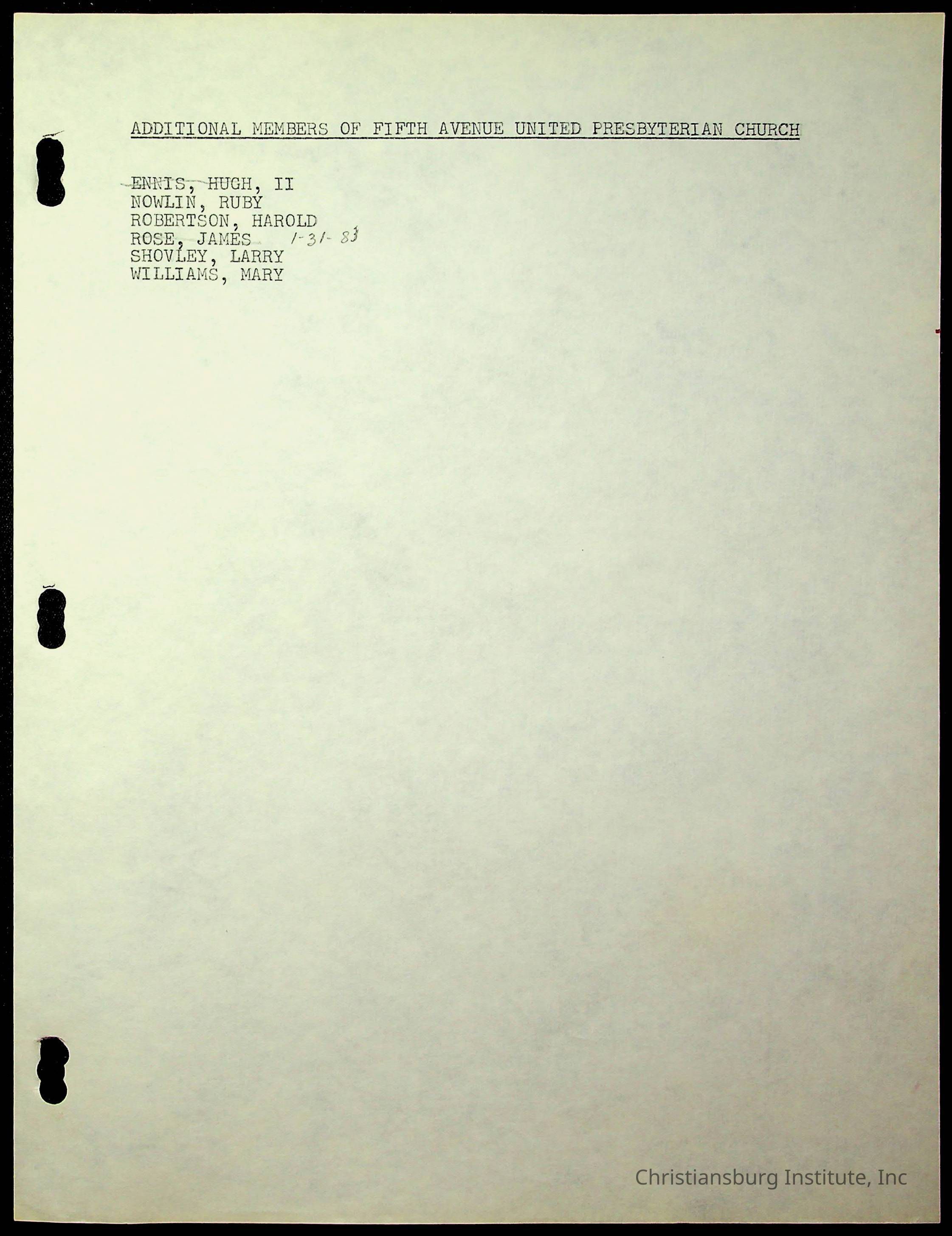 Copyright has been assigned to Christiansburg Institute Museum & Archives by Fifth Avenue Presbyterian Church. For permission to publish materials created by the donor, contact CIMA@christiansburginstitute.com. Materials not created by Fifth Avenue Presbyterian Church may still be under copyright.