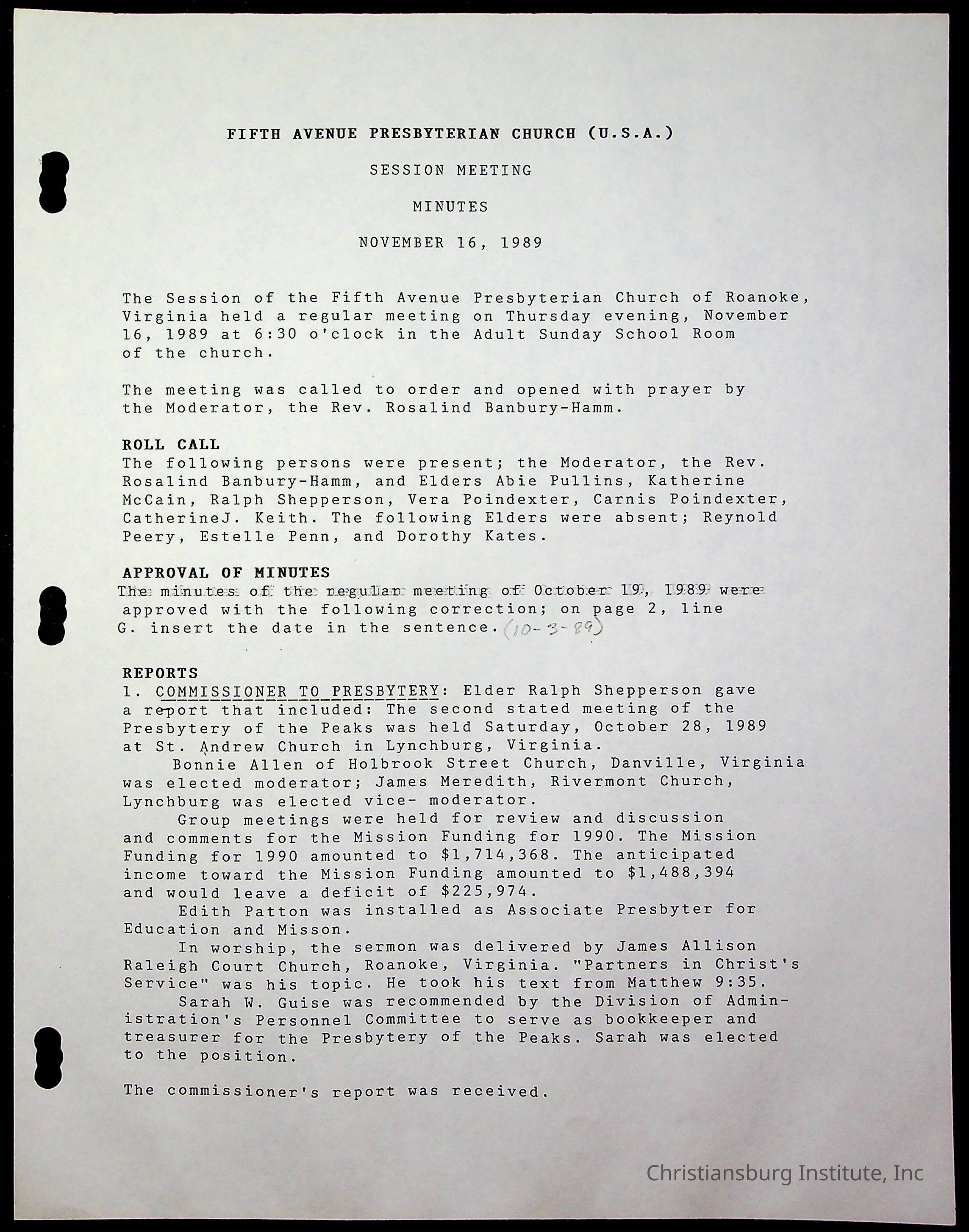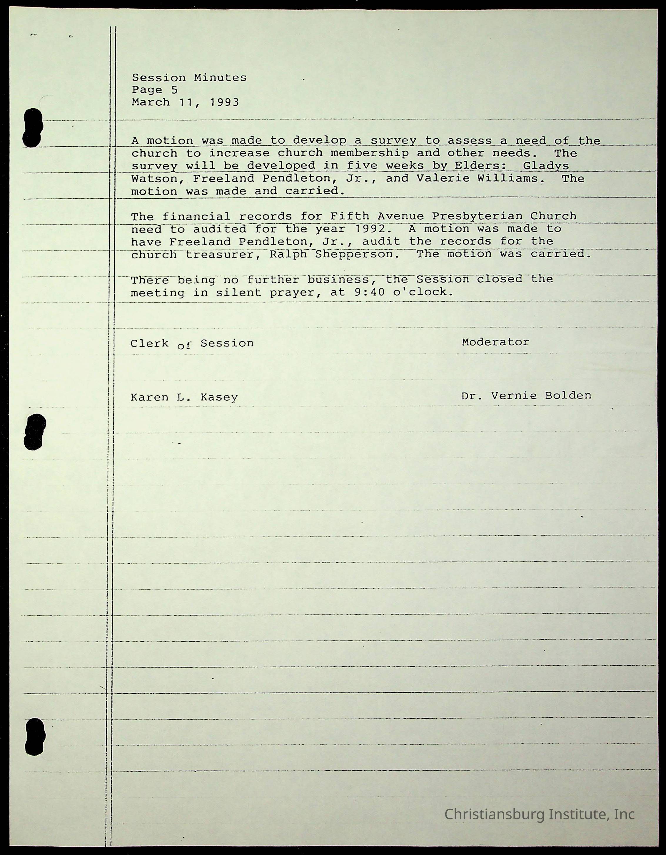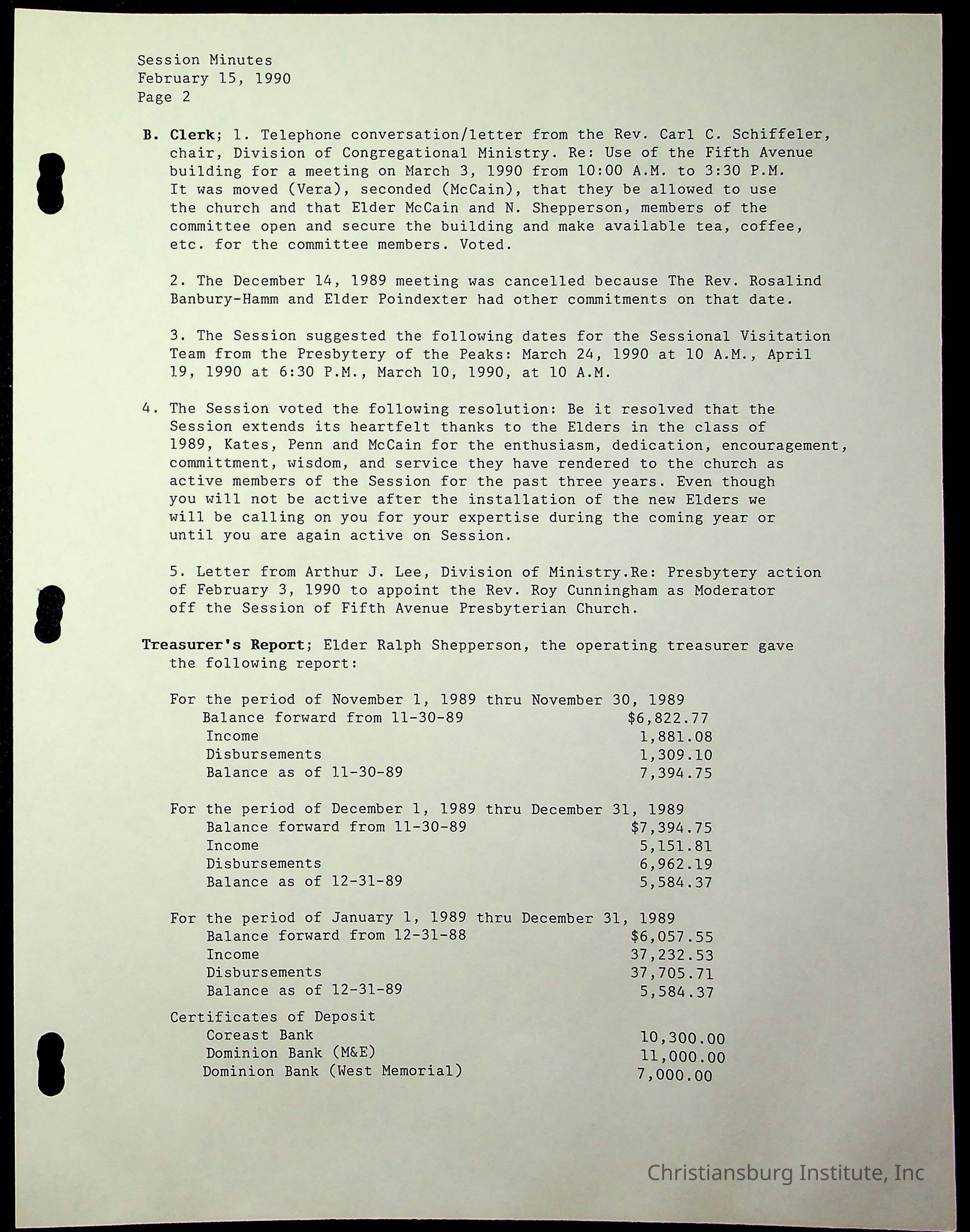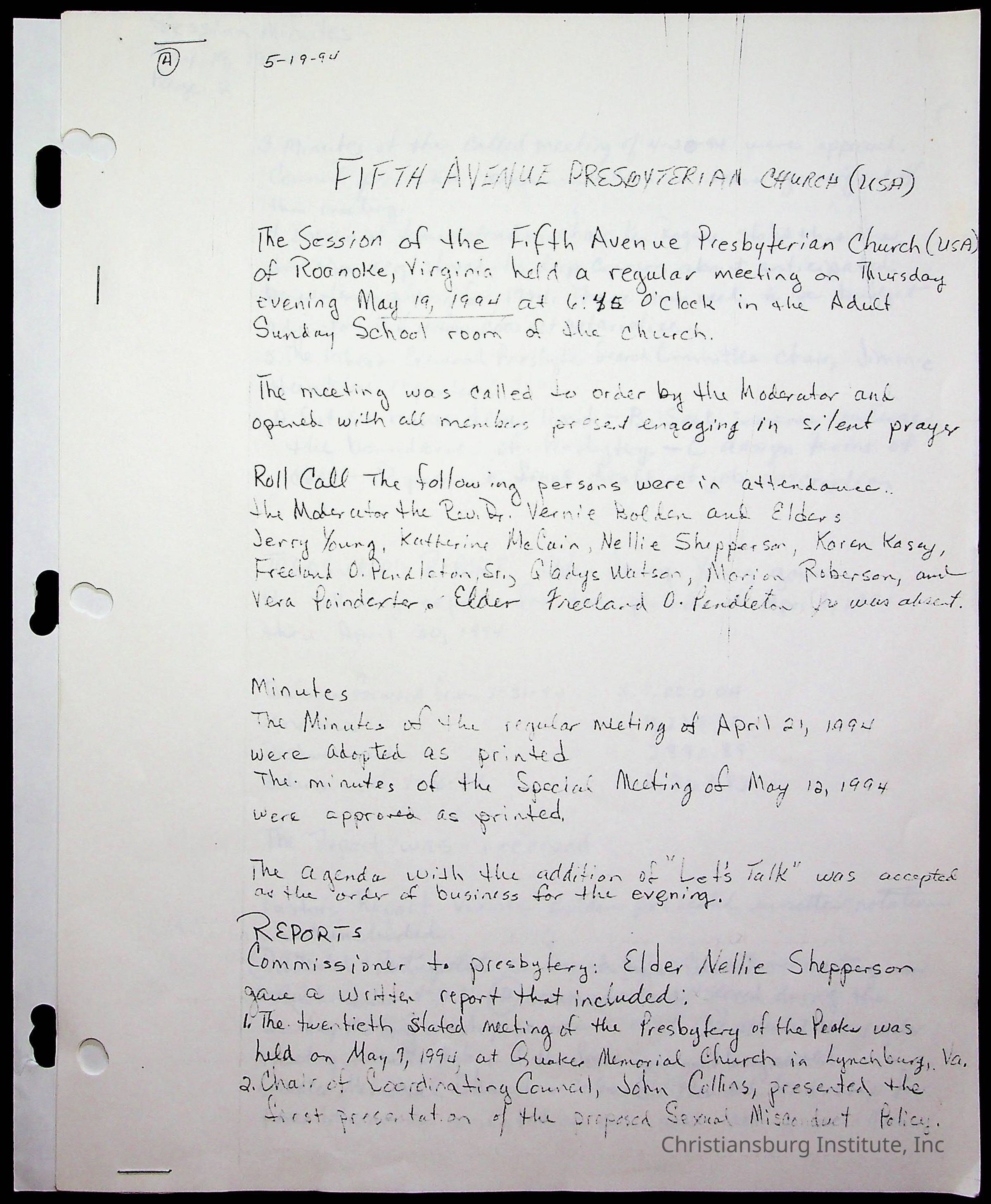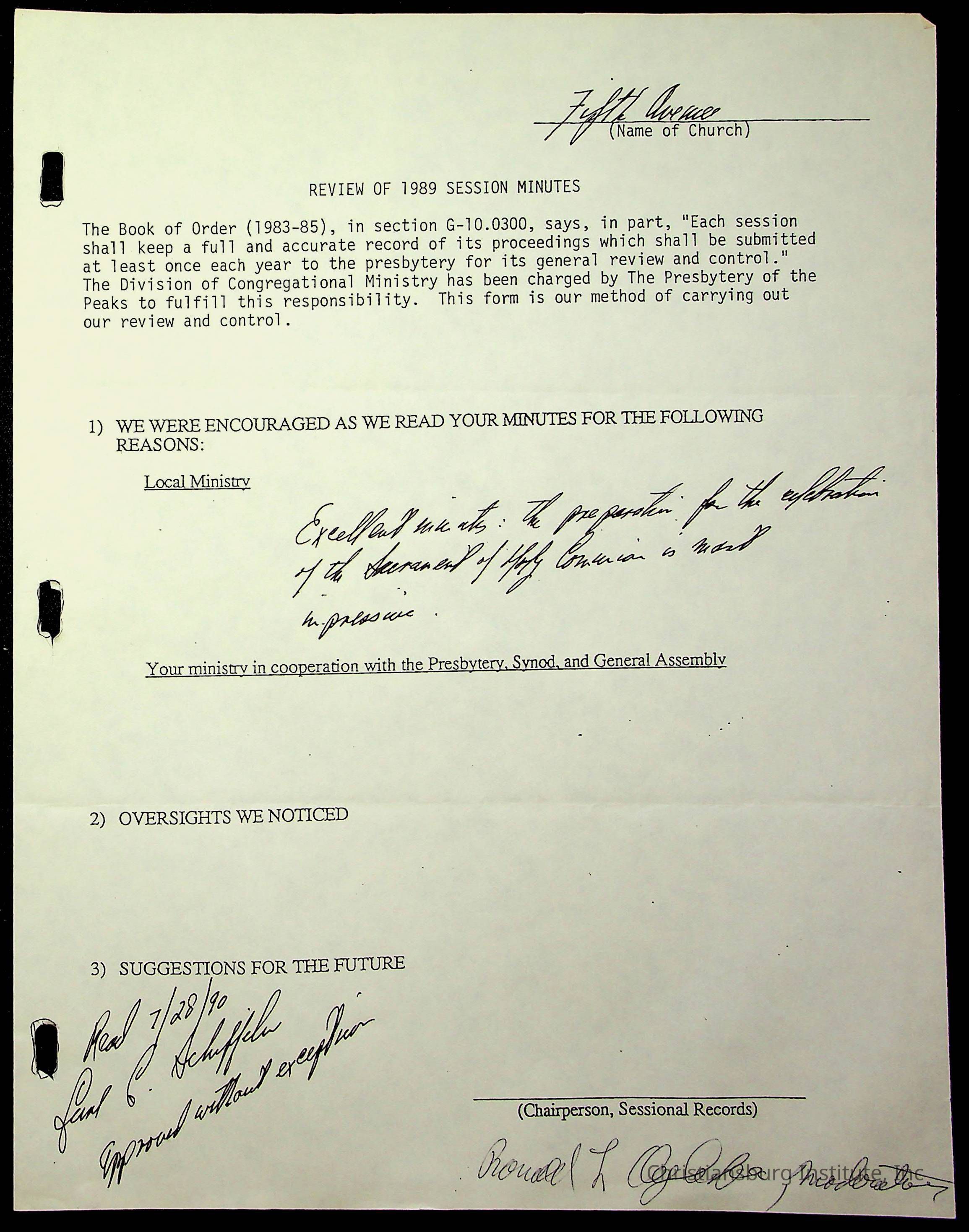 The session minutes for the Fifth Avenue Presbyterian Church from the years 1989-1994.Collection