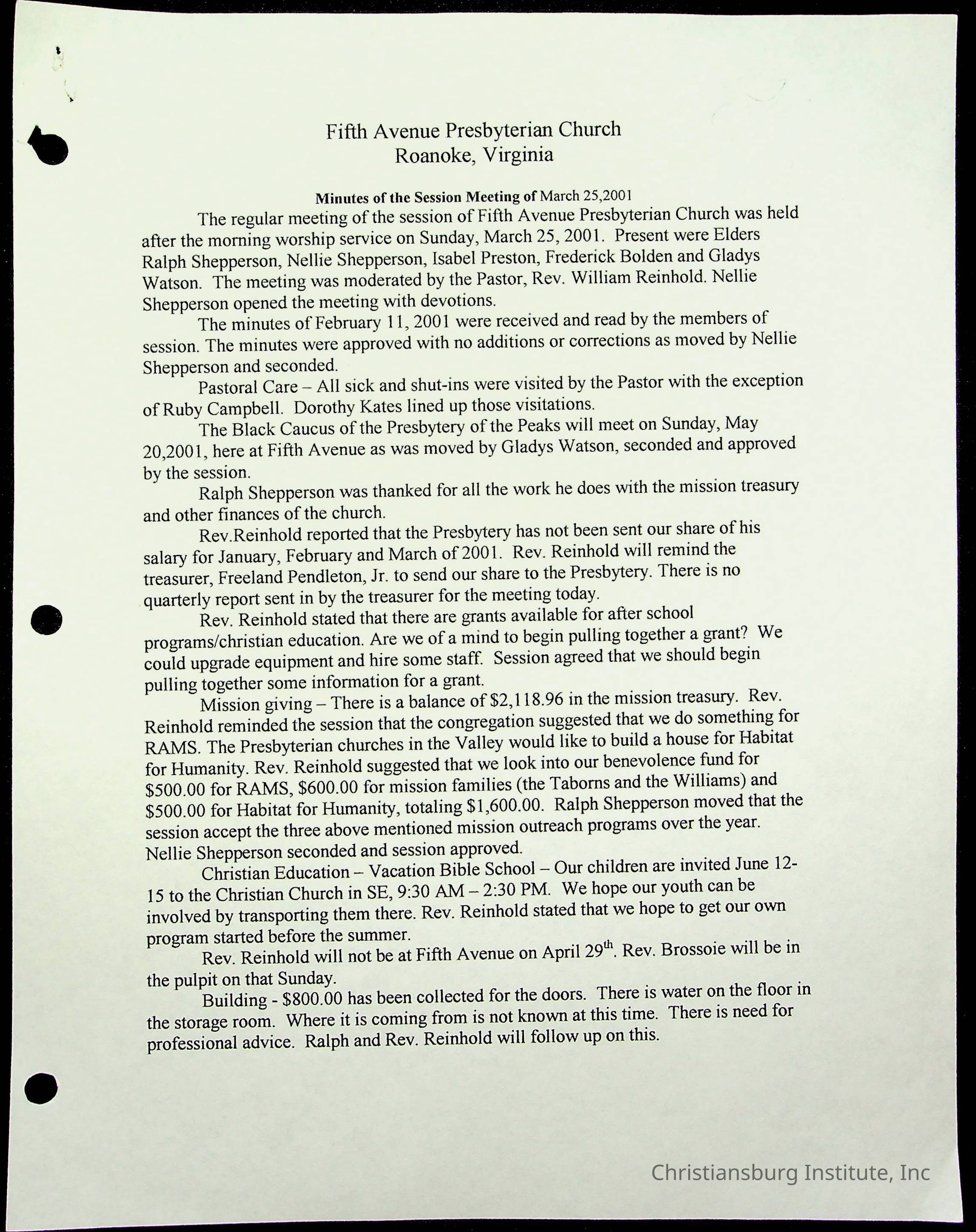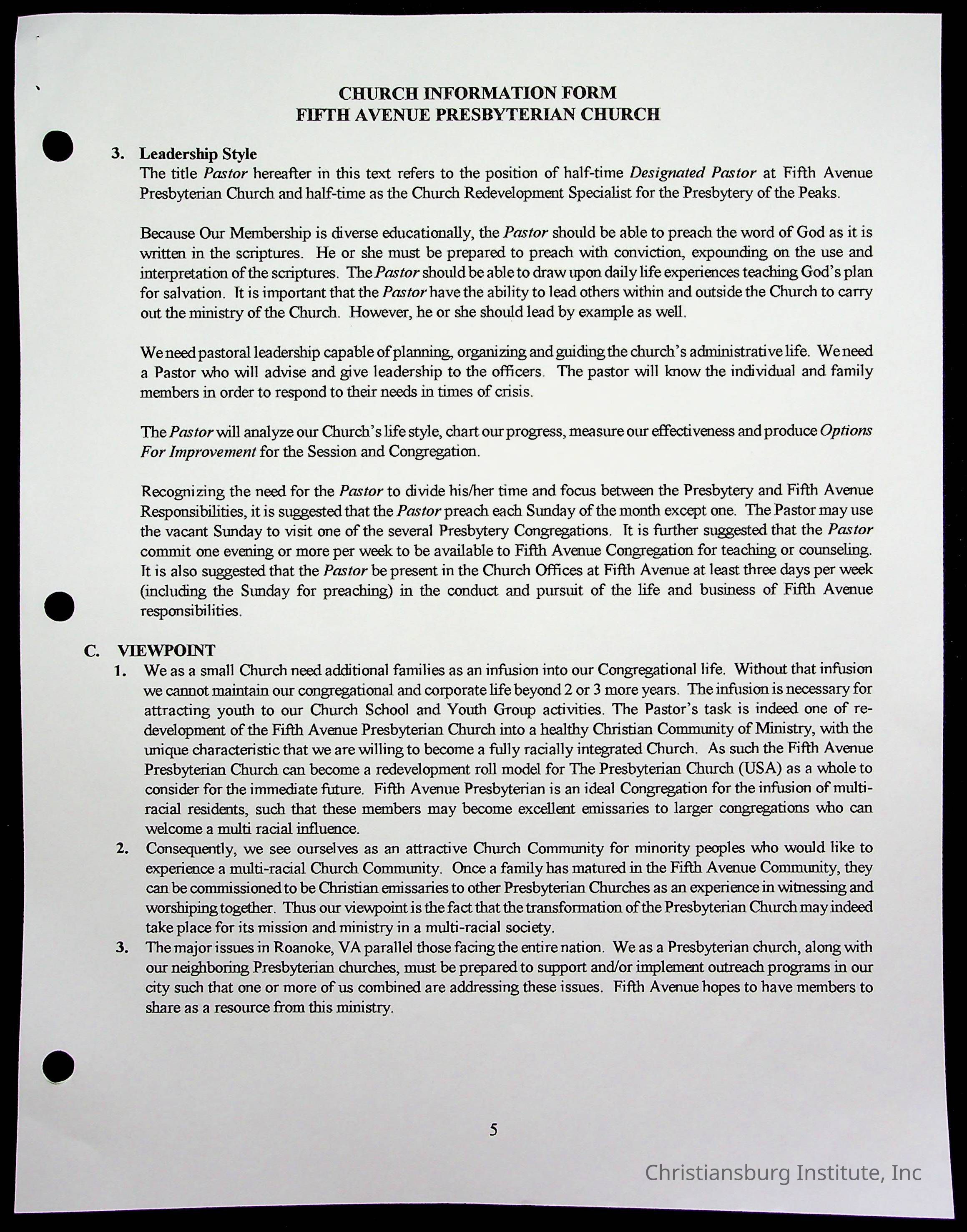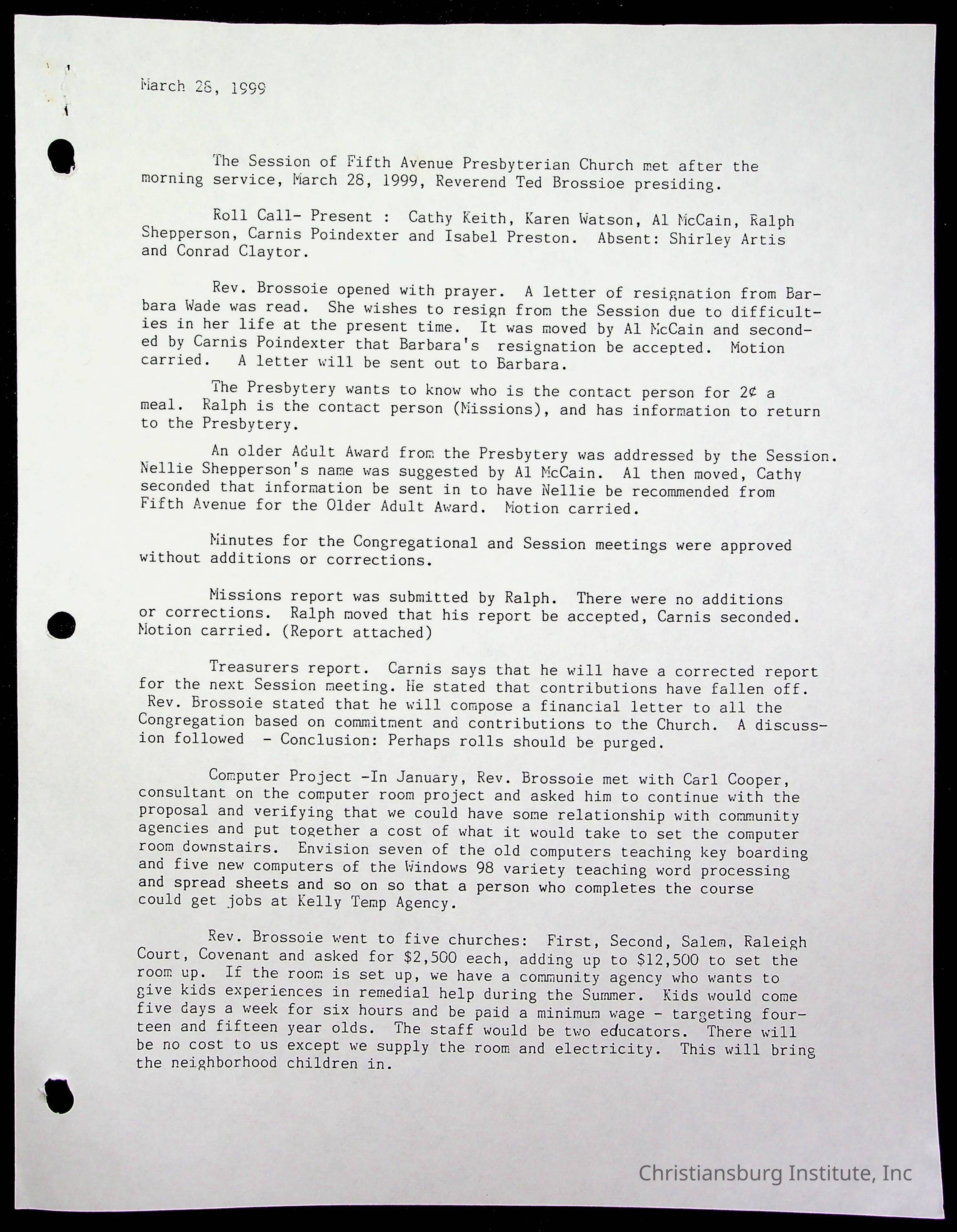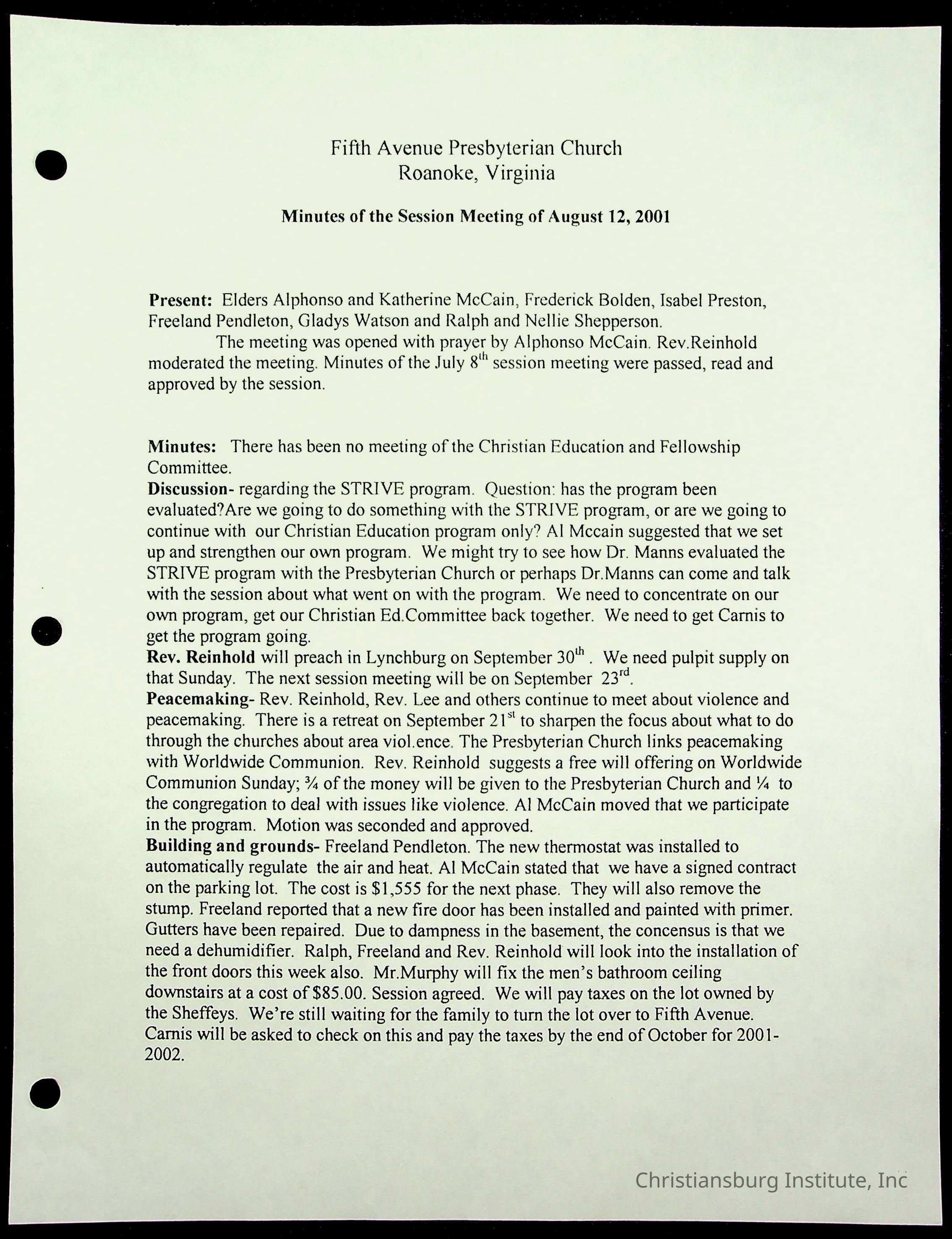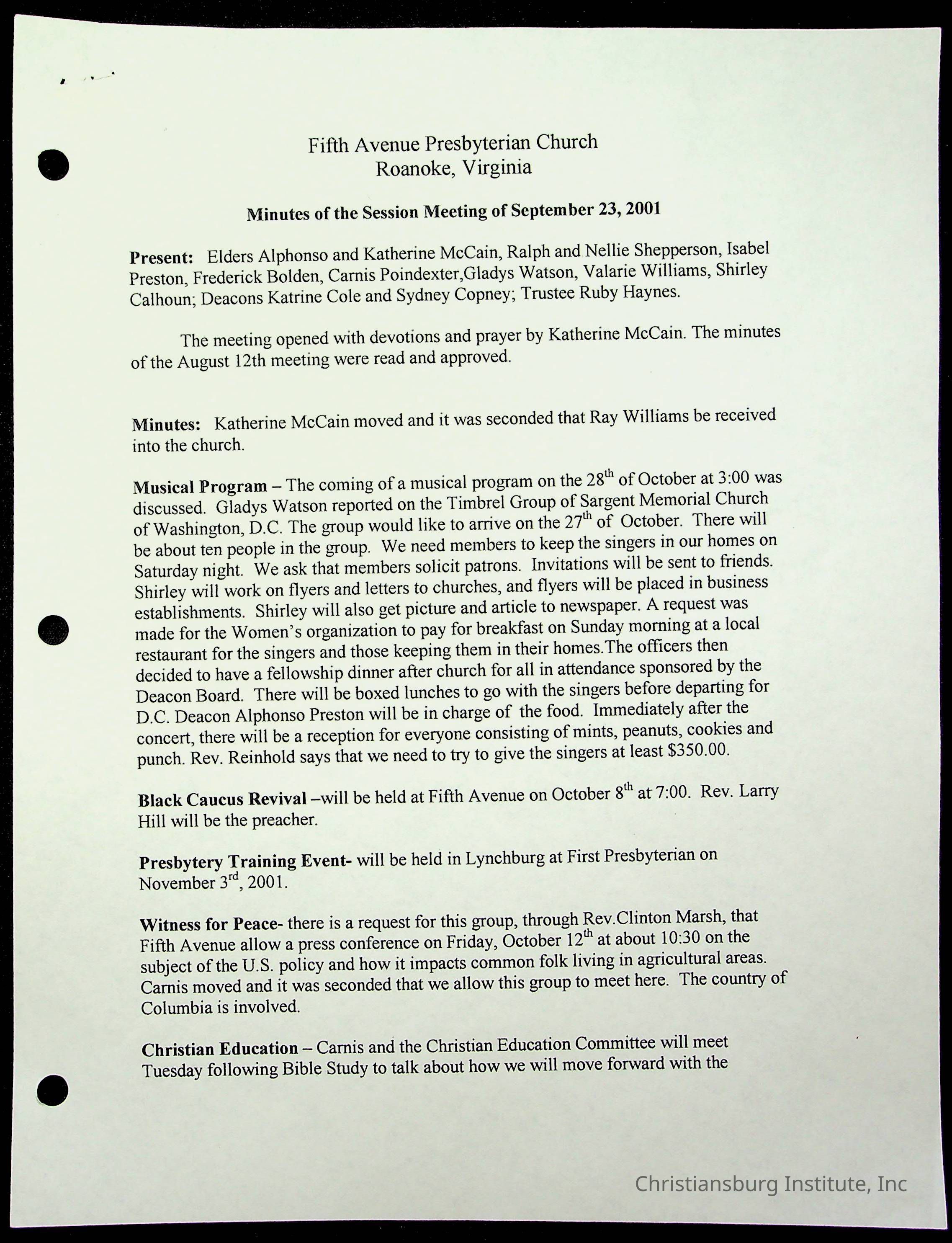 Copyright has been assigned to Christiansburg Institute Museum & Archives by Fifth Avenue Presbyterian Church. For permission to publish materials created by the donor, contact CIMA@christiansburginstitute.com. Materials not created by Fifth Avenue Presbyterian Church may still be under copyright.
