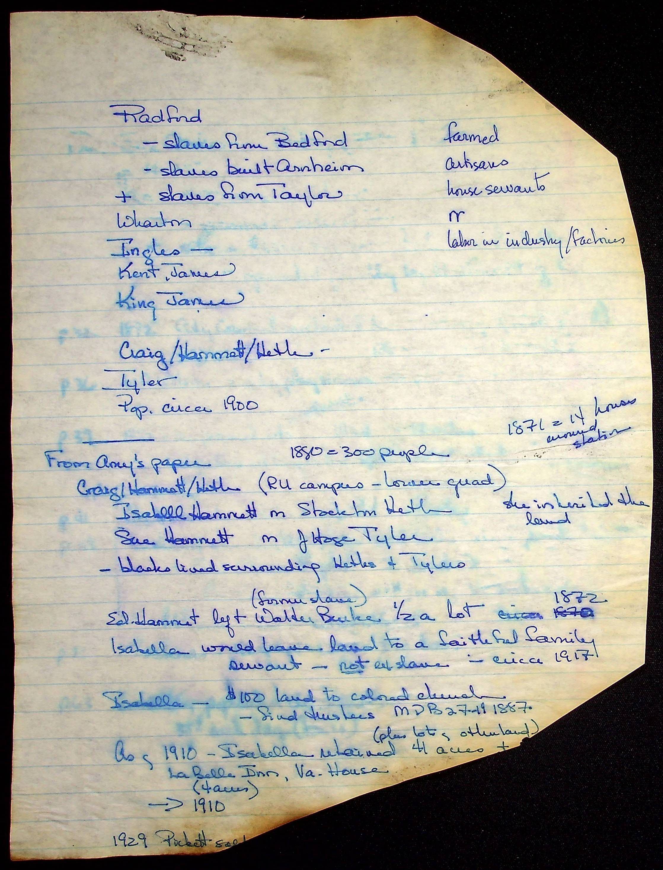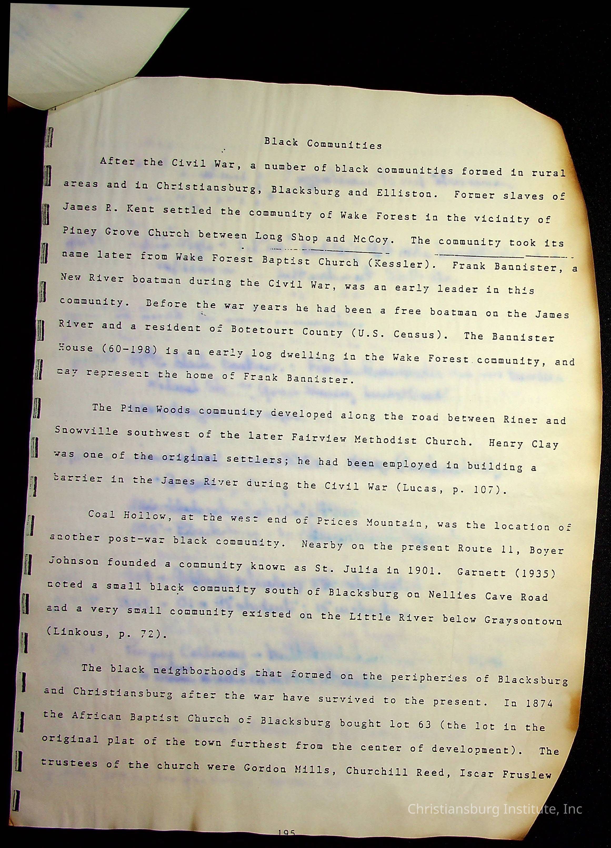A folder of research materials collected by Radford University professor, Dr. Linda Killen. This folder is titled 'Miscellaneous Radford Black History' and includes various research conducted about Black history in Radford, Virginia. Please note: some of the documents were damaged by fire.
