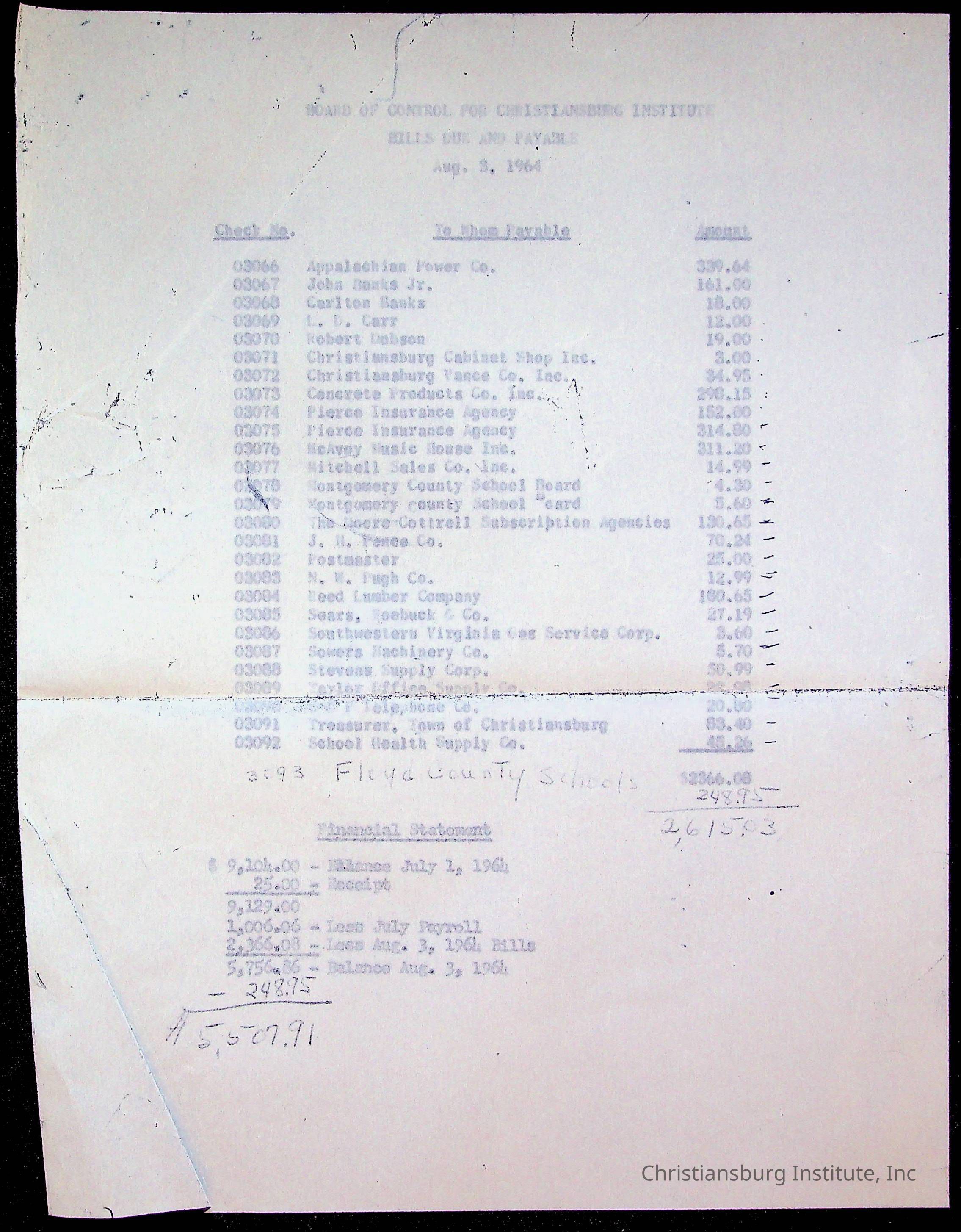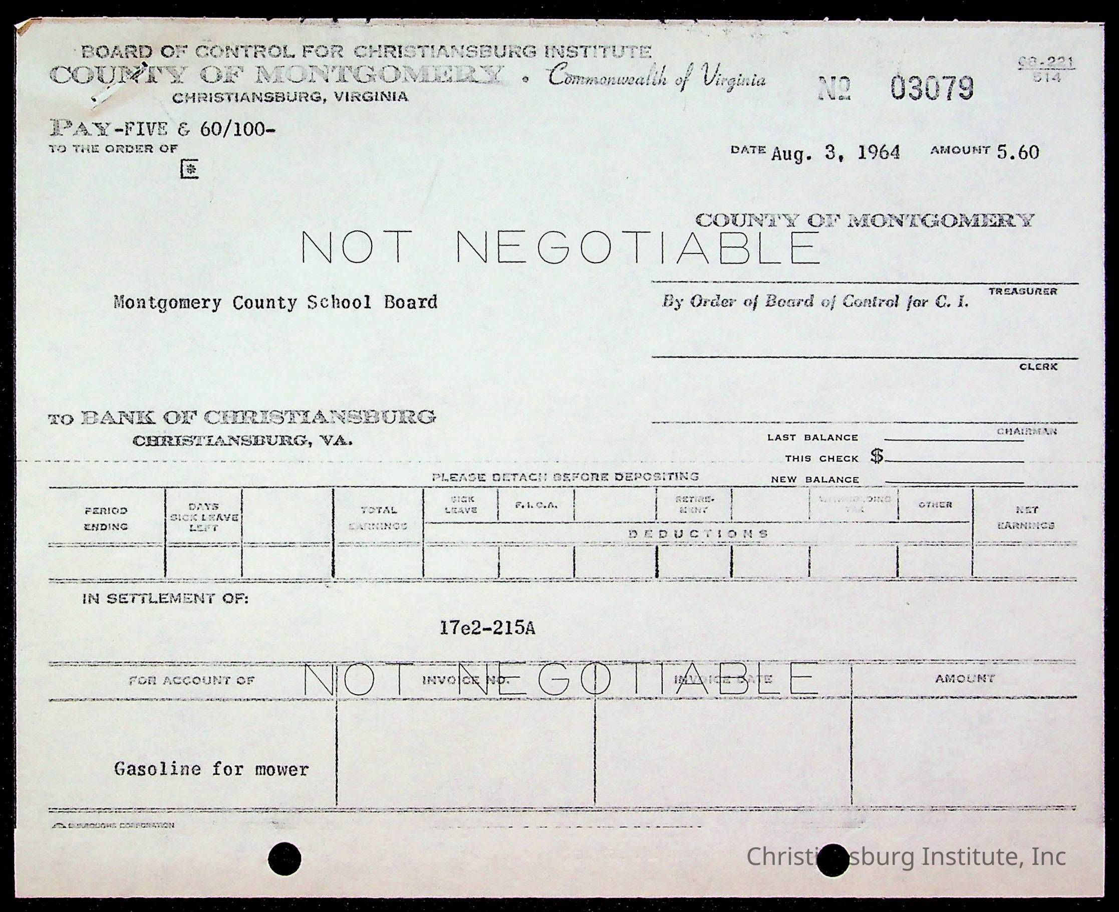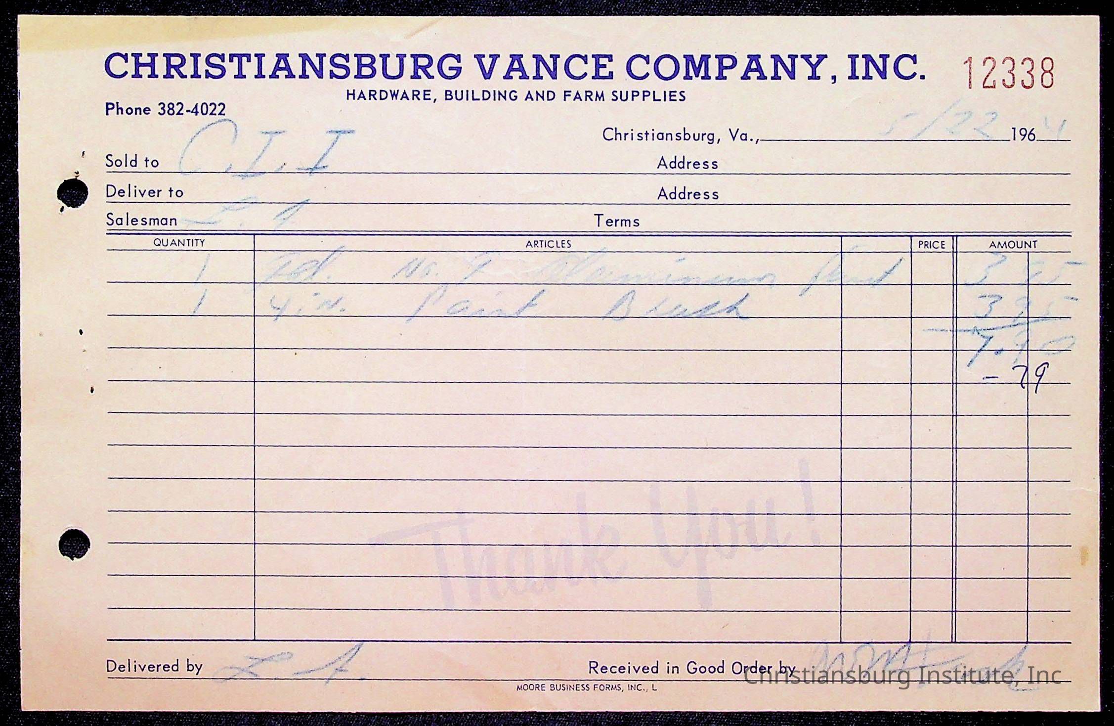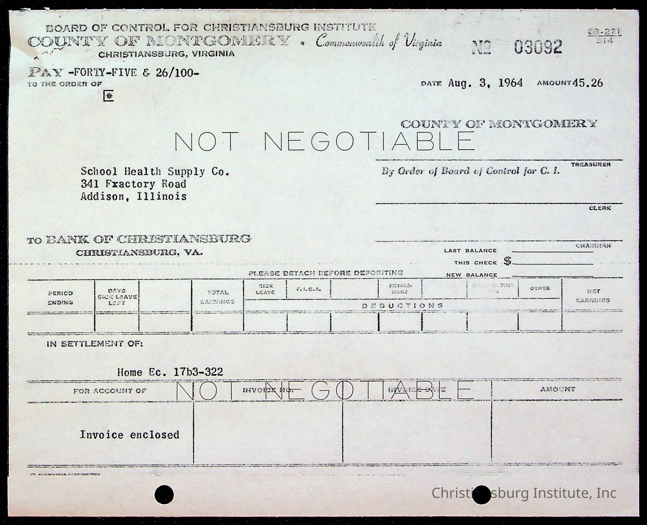 An archive of bills and receipts for the Board of Control of Christiansburg Institute and the Montgomery County School Board, circa 1960s.