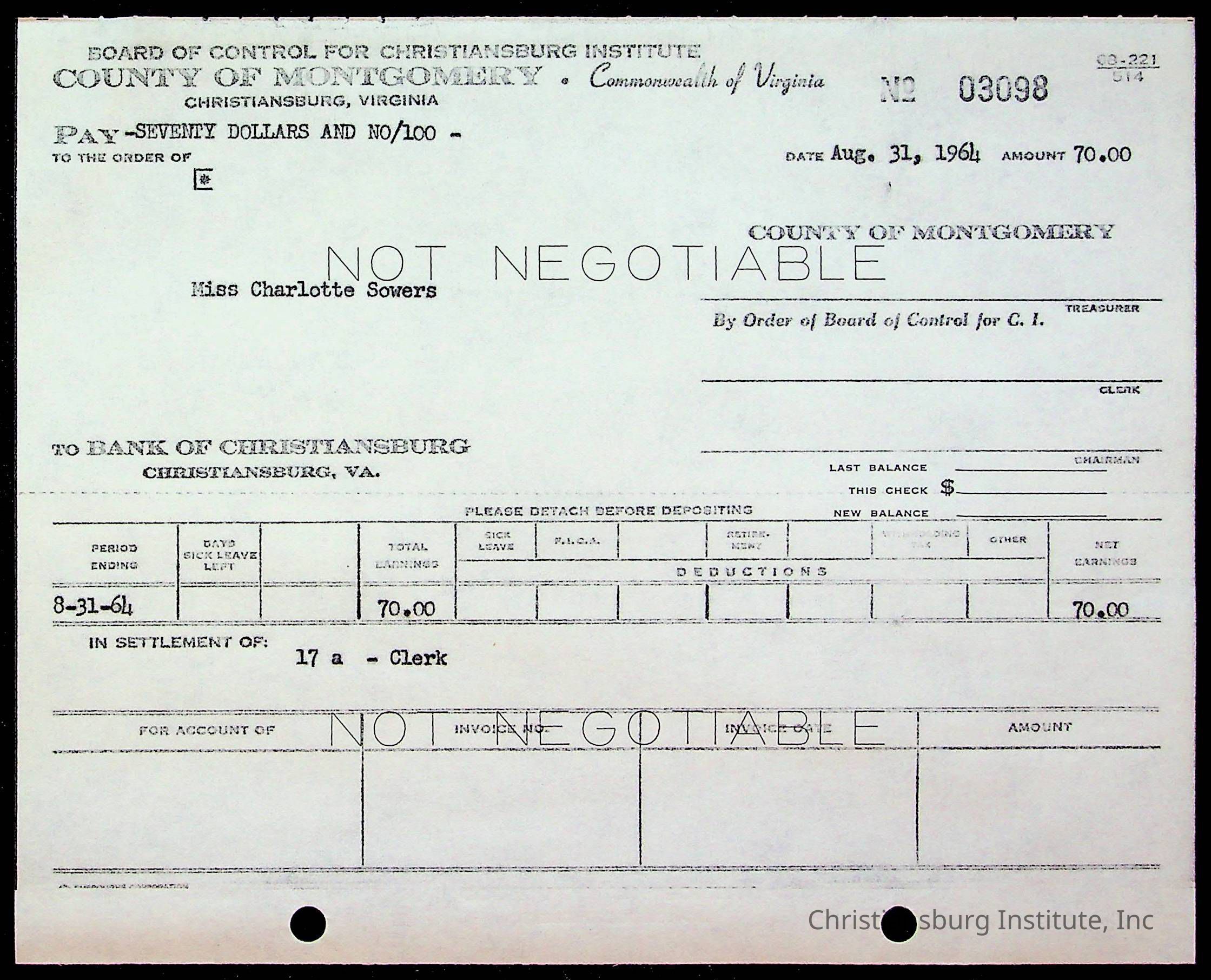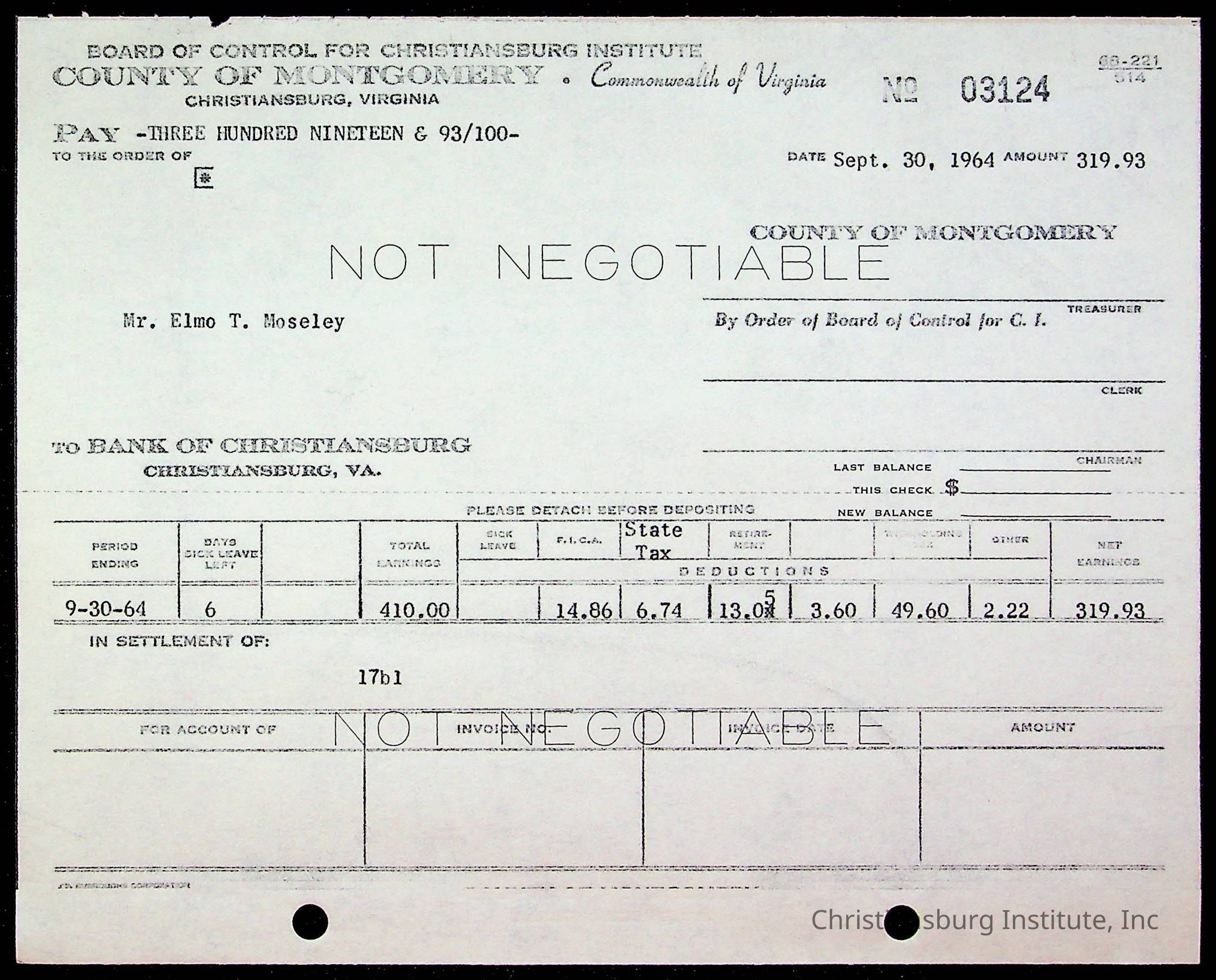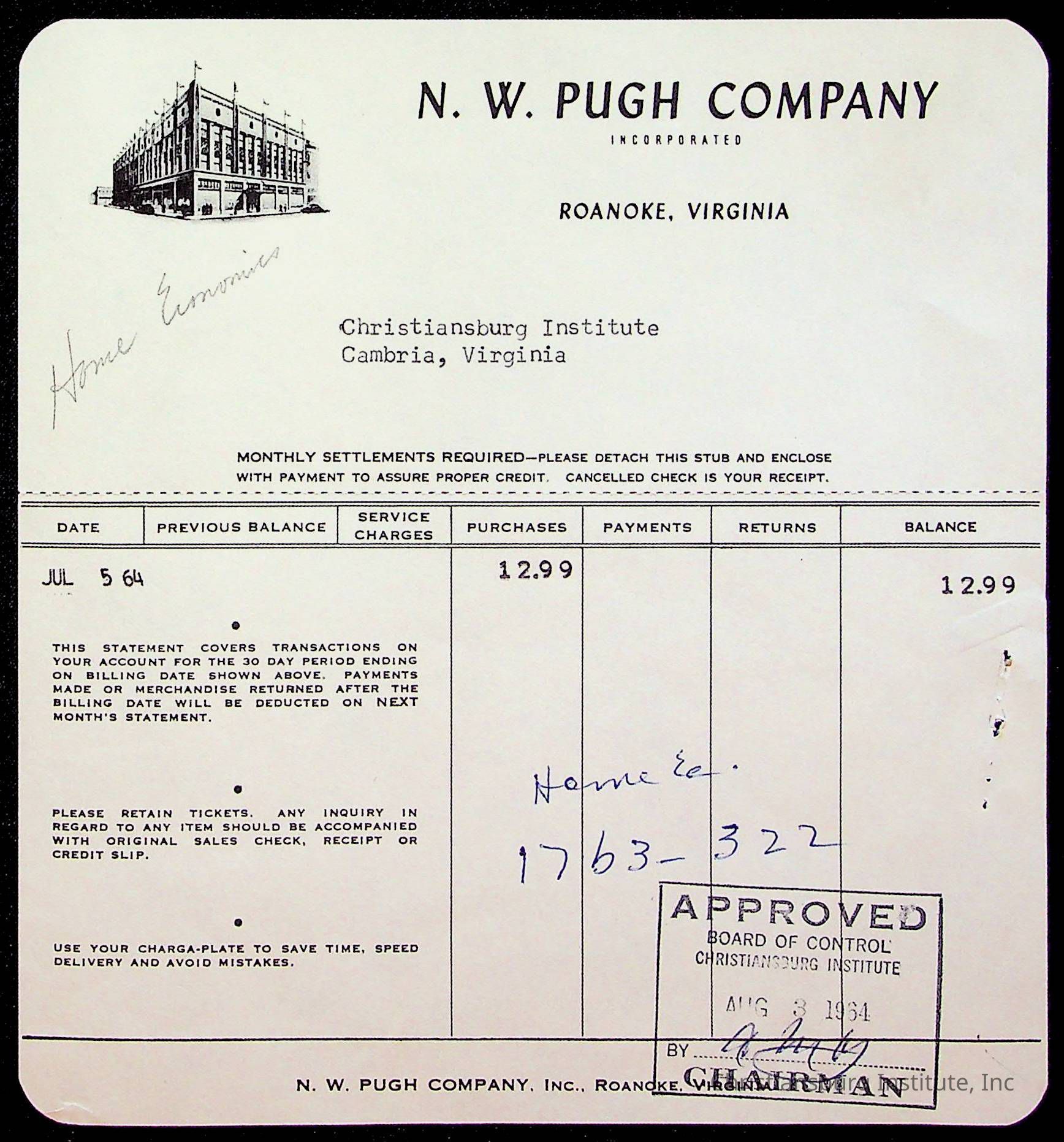 An archive of bills and receipts for the Board of Control of Christiansburg Institute and the Montgomery County School Board, circa 1960s.
