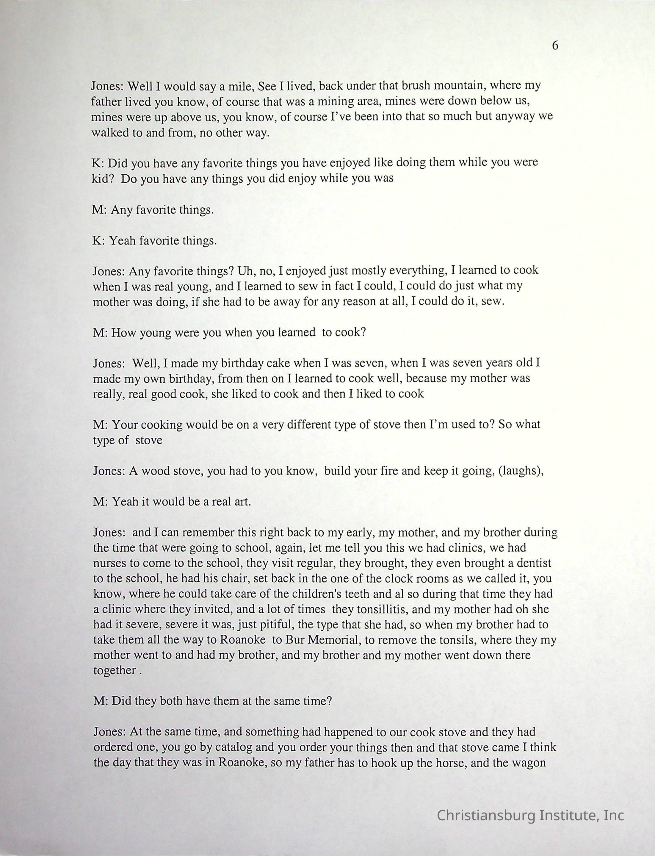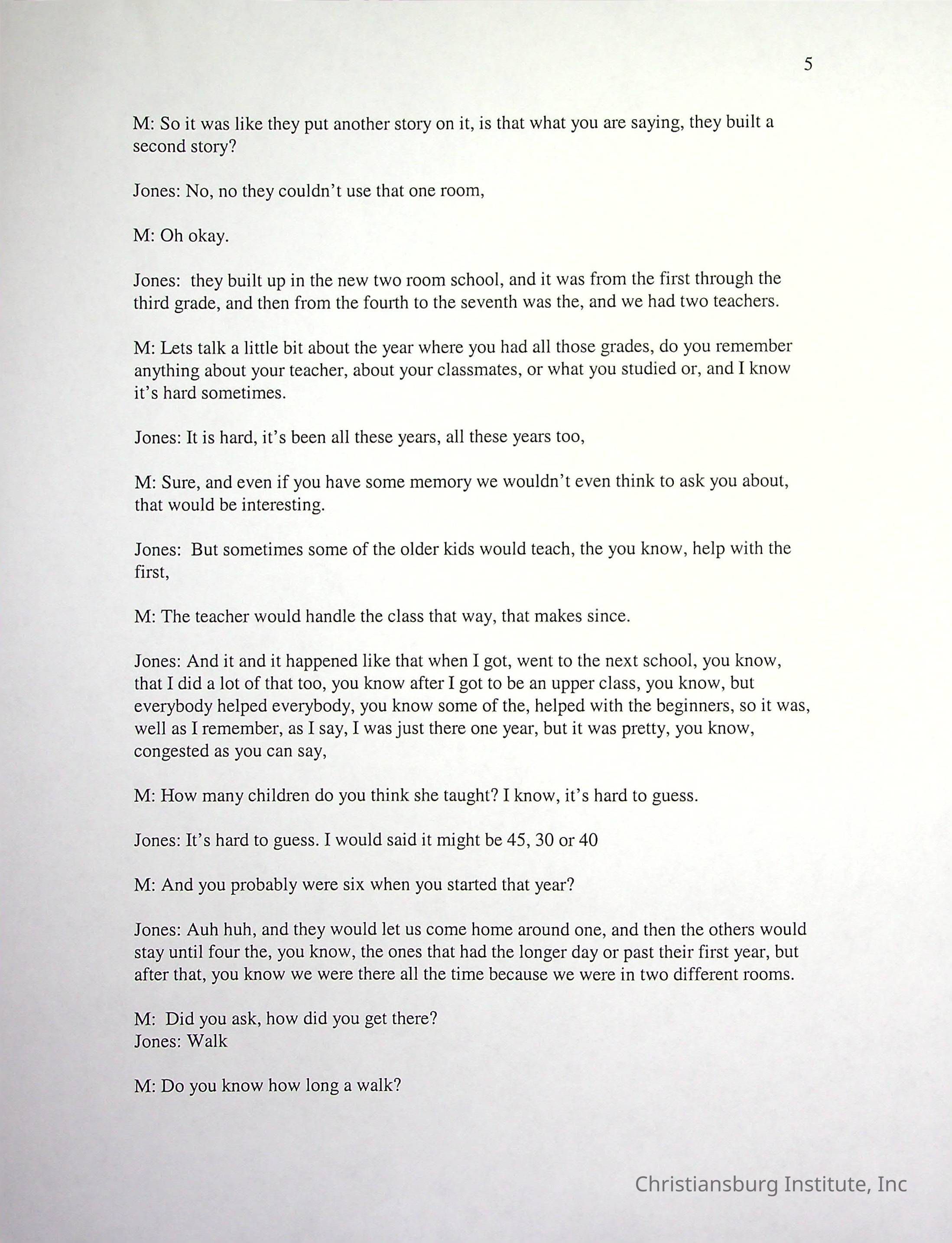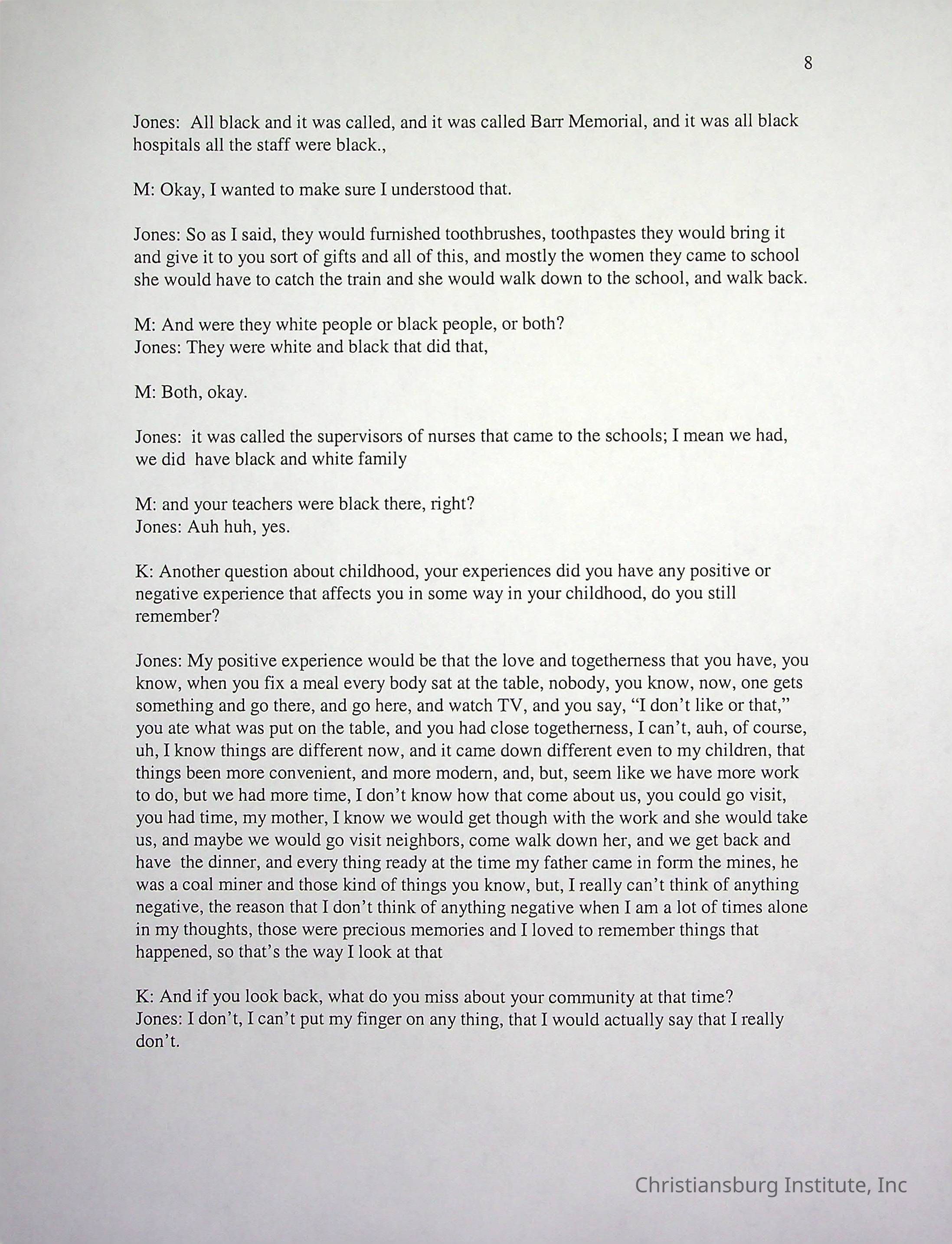 An oral history with Christiansburg Institute alumni, Esther Jones conducted by Kalthoum Alkandari and Maria Lymans on October 26th, 2000 and a second interview conducted on November 52nd, 2000.Collection