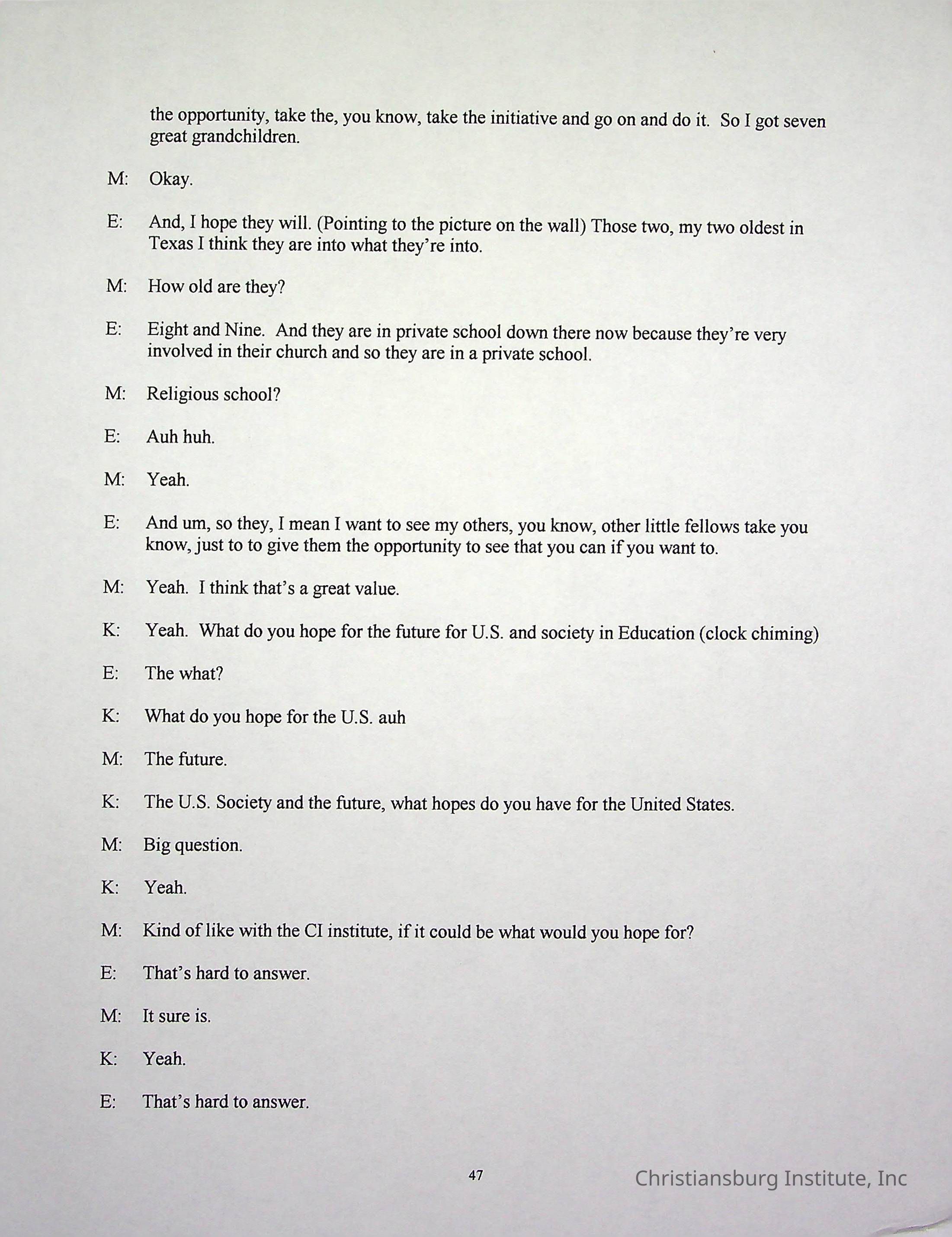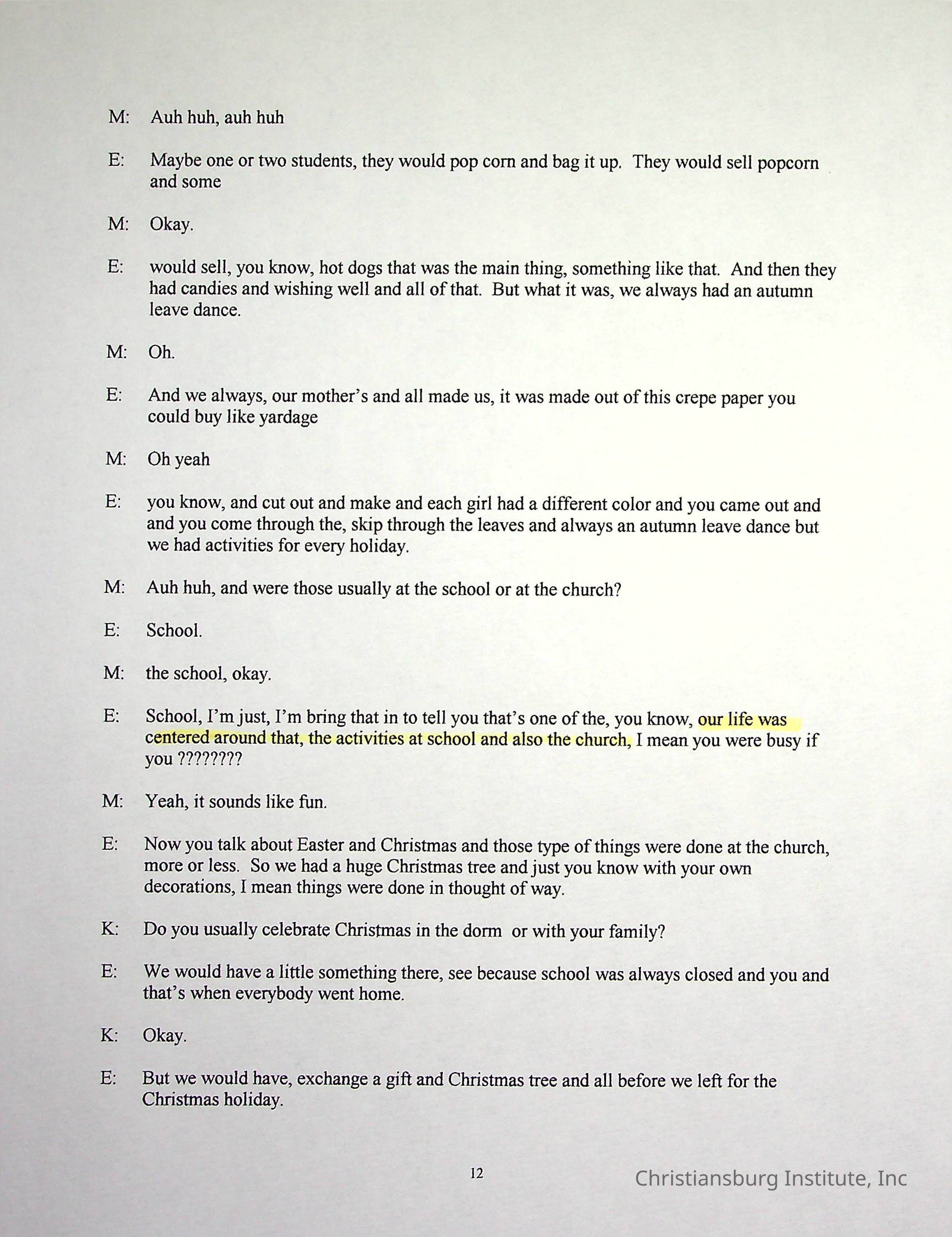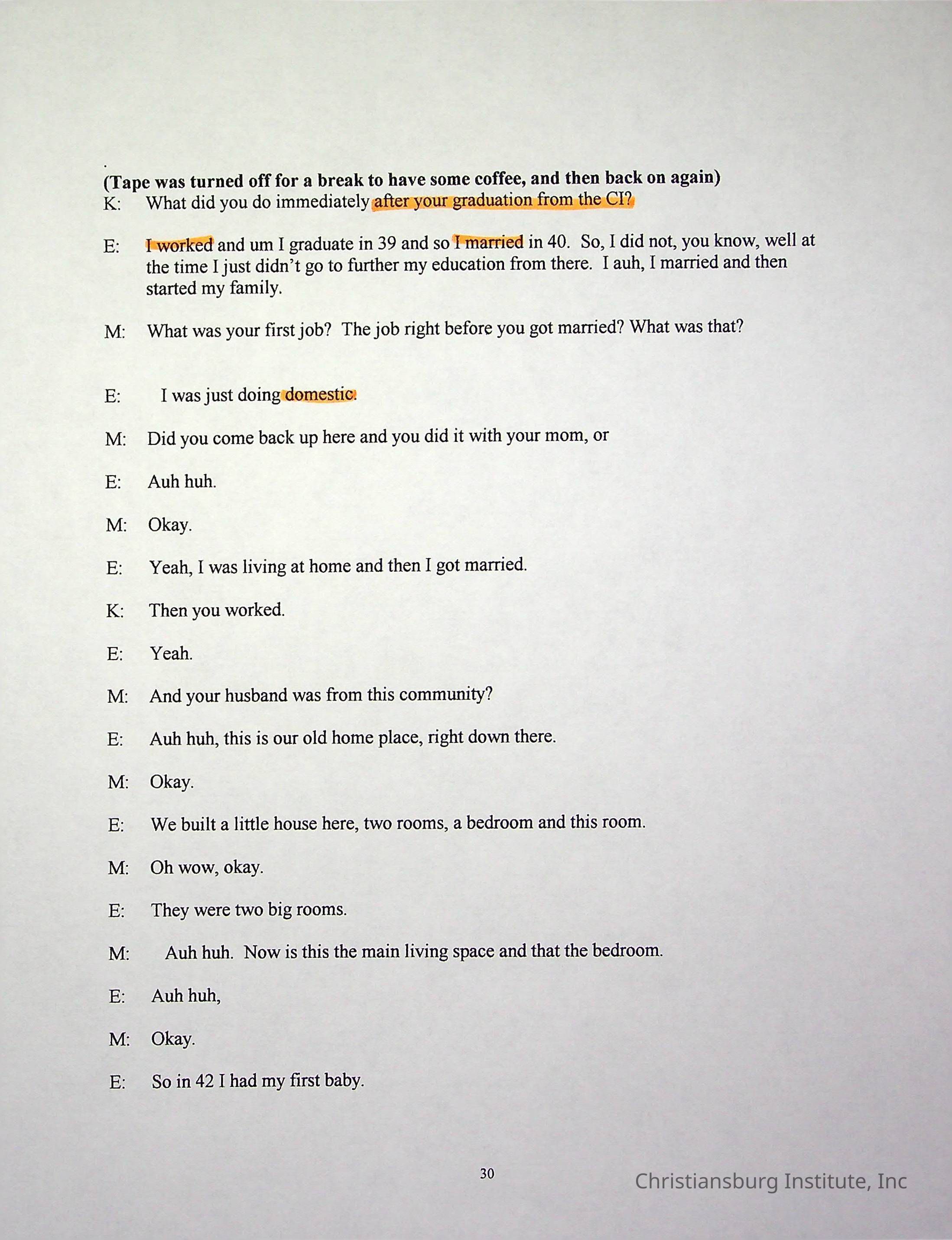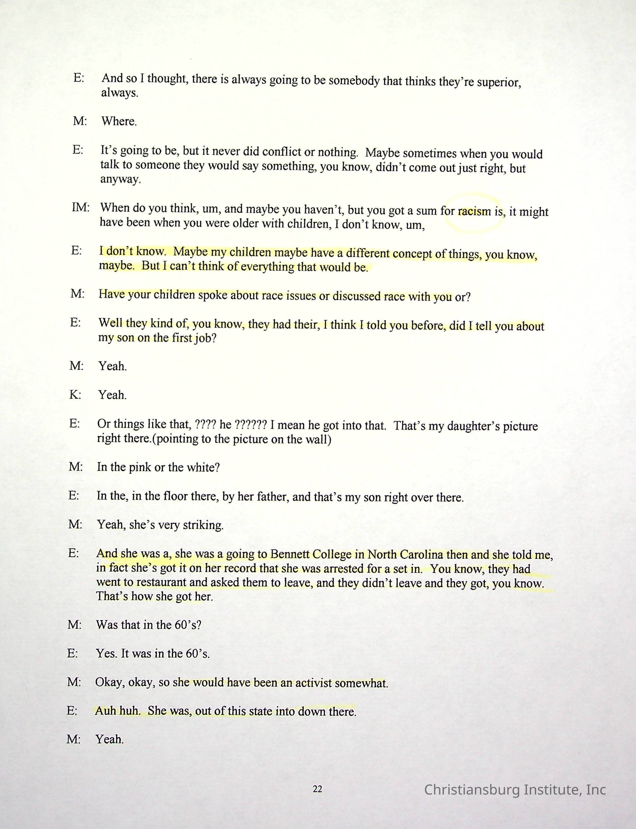 An oral history with Christiansburg Institute alumni, Esther Jones conducted by Kalthoum Alkandari and Maria Lymans on October 26th, 2000 and a second interview conducted on November 52nd, 2000.Collection