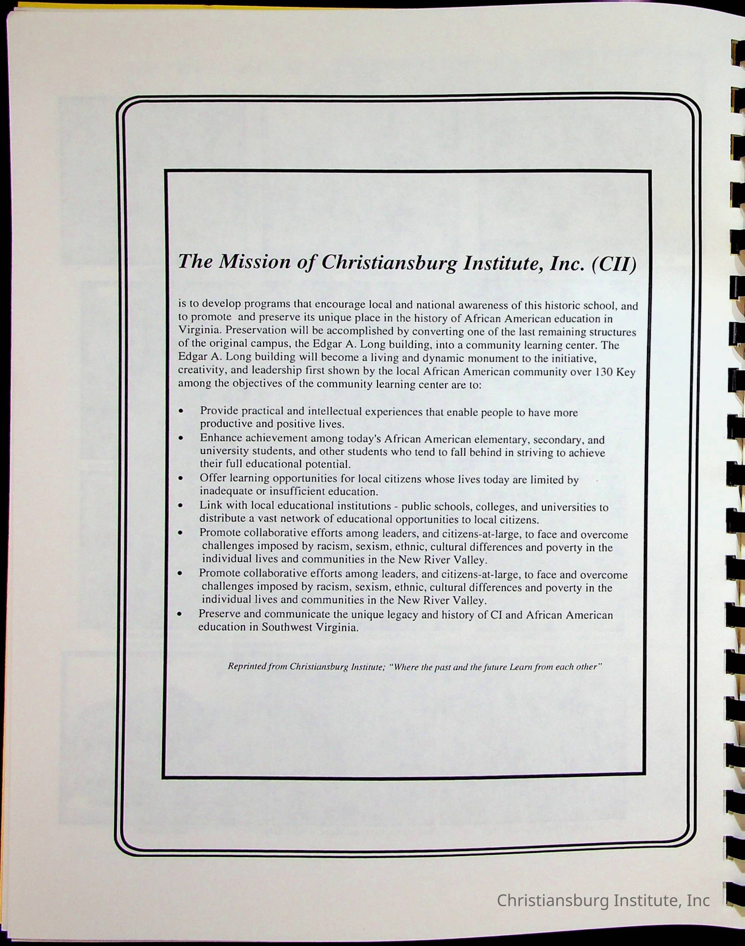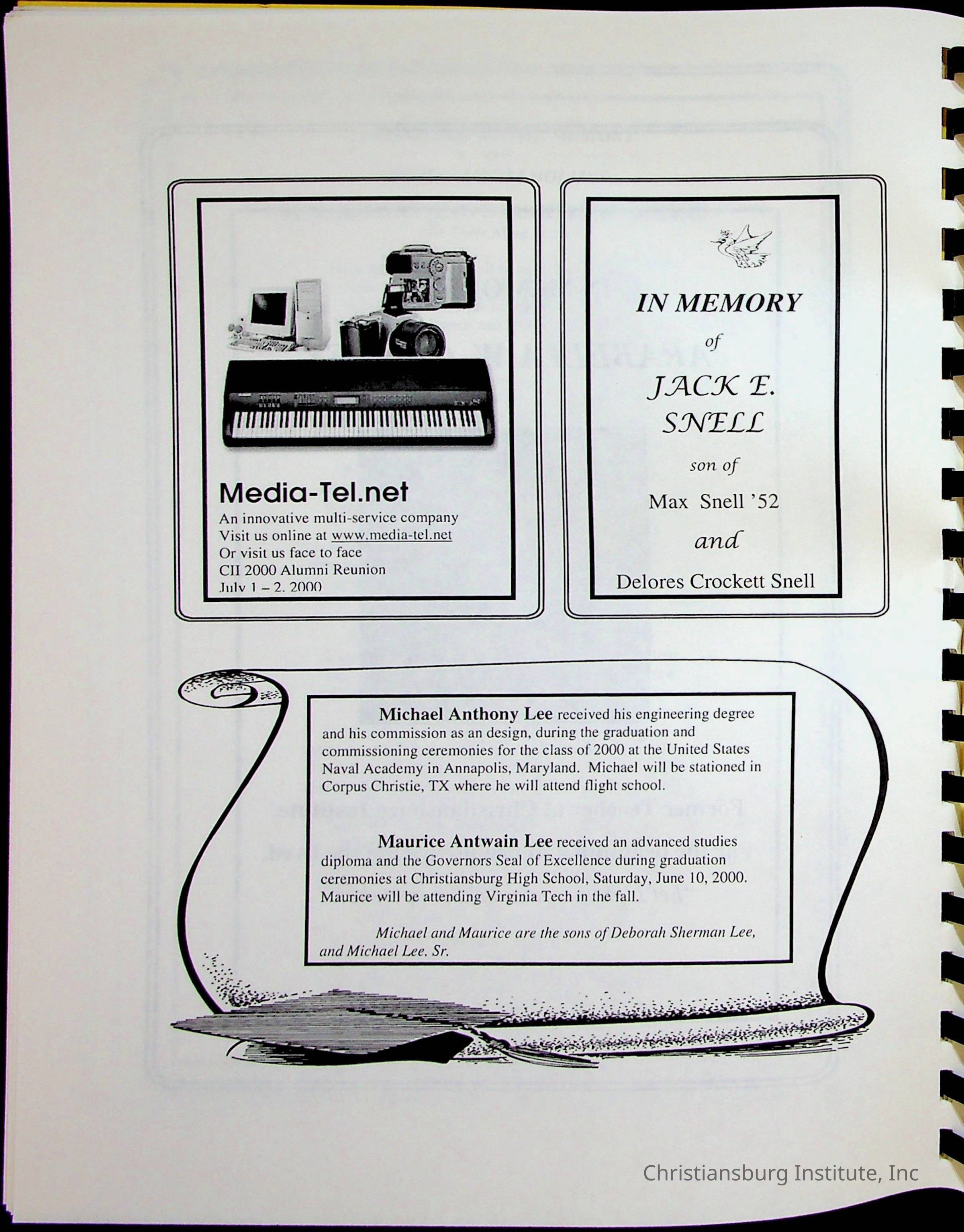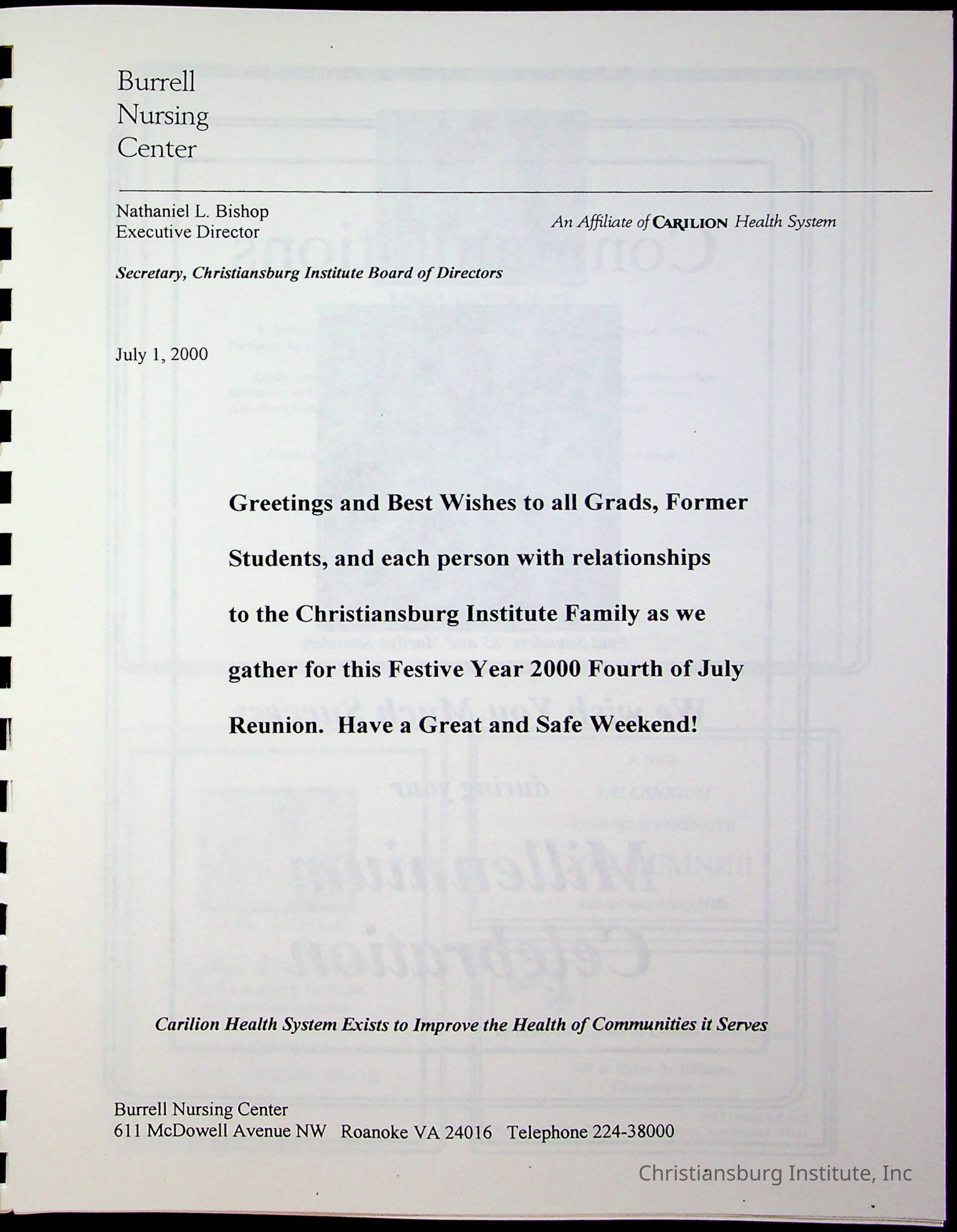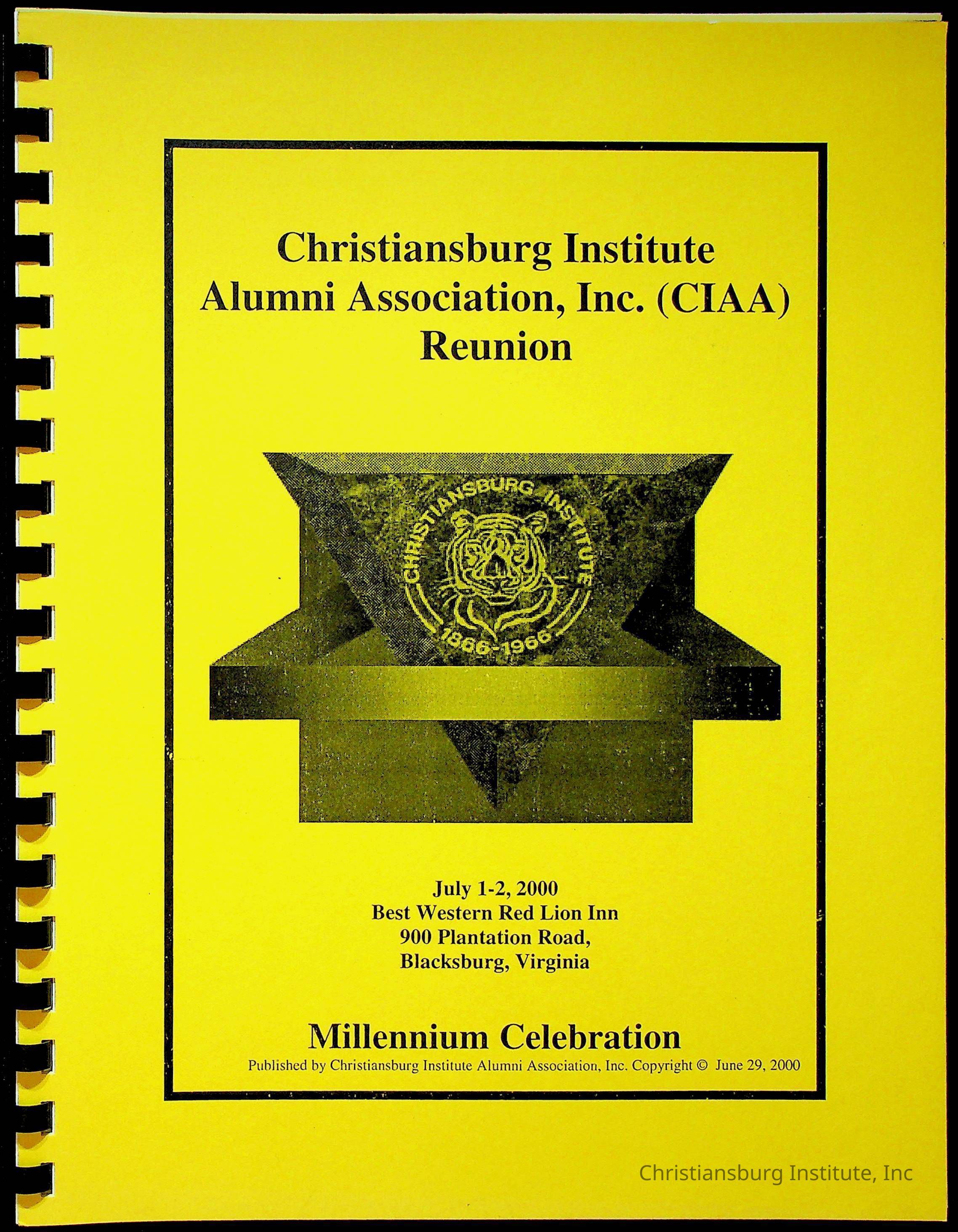 The official program and souvenir book for the Christiansburg Institute Alumni Association reunion that took place on July 1st-2nd 2000 at the Best Western Red Lion Inn in Blacksburg, Virginia.