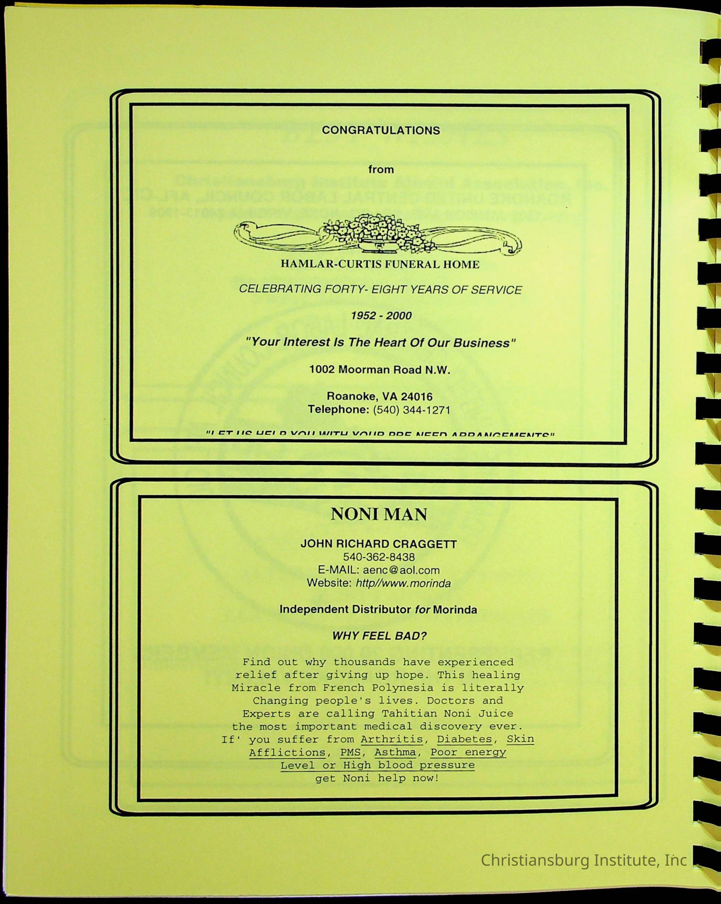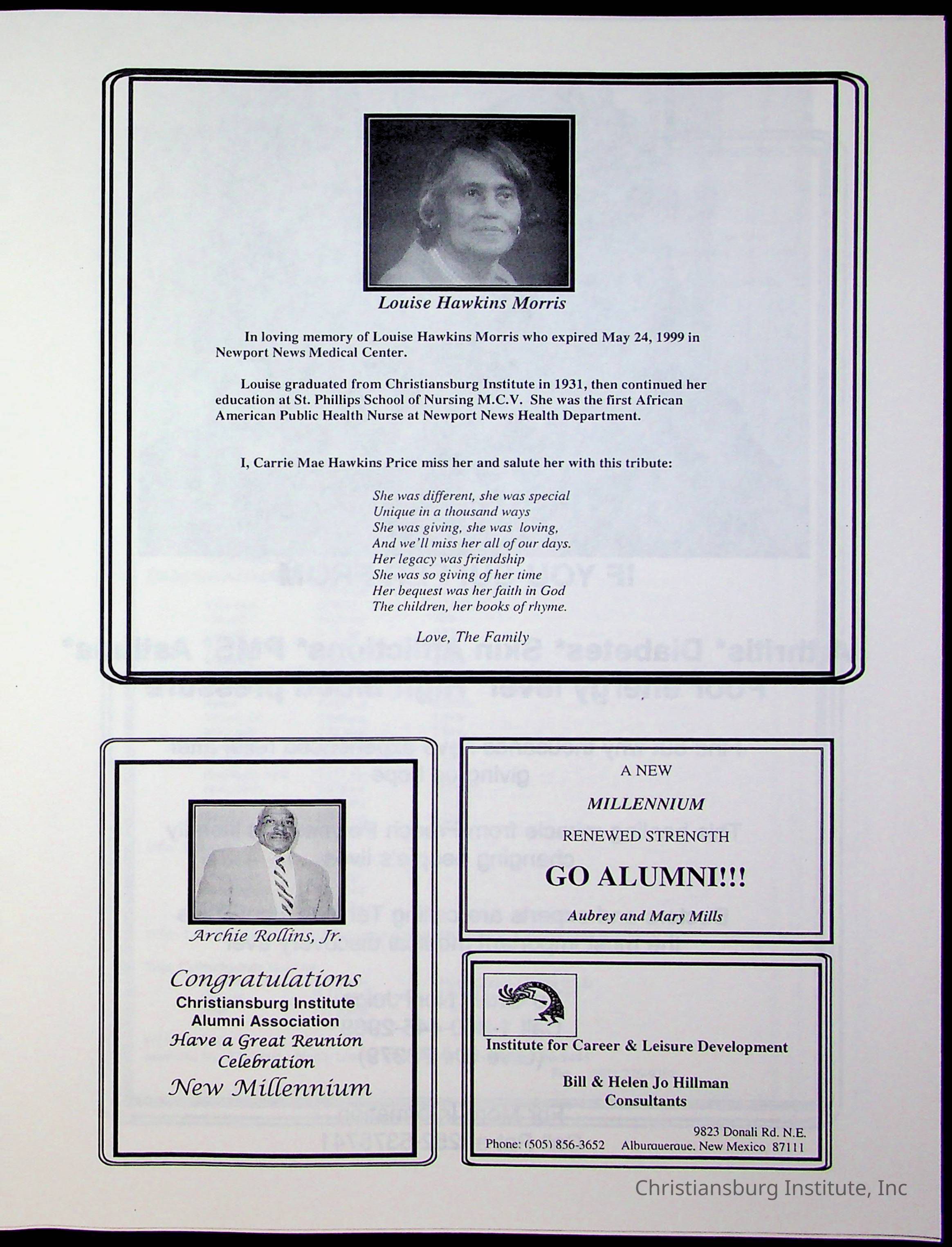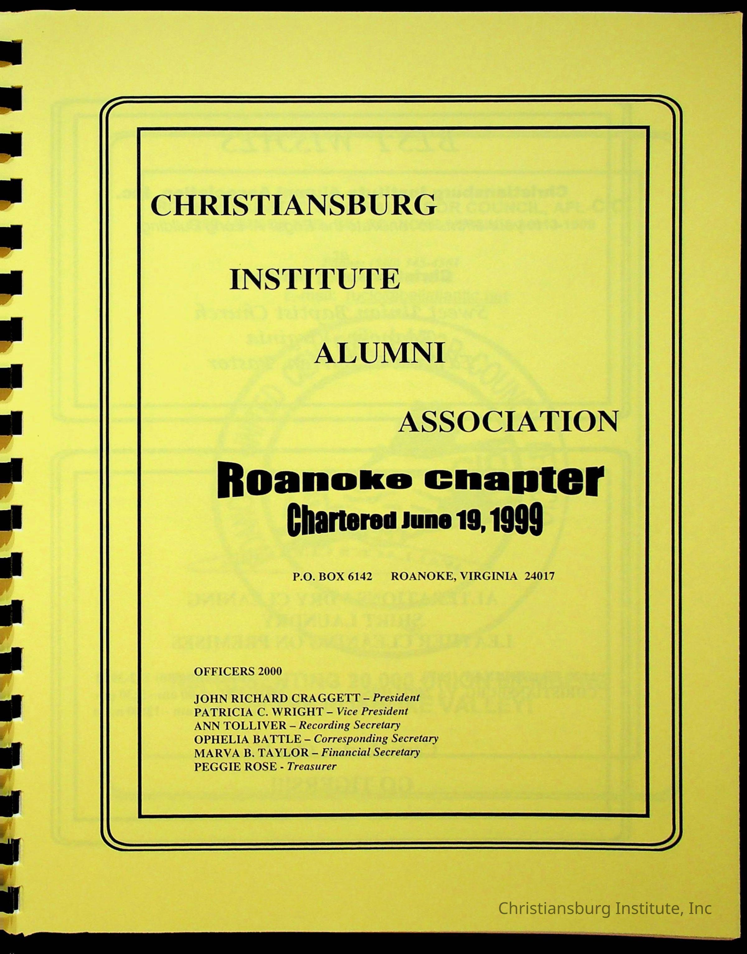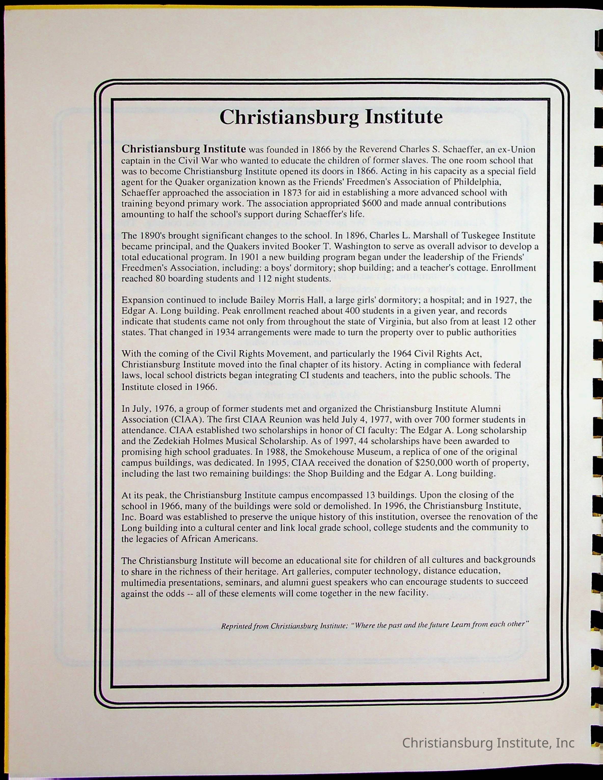 The official program and souvenir book for the Christiansburg Institute Alumni Association reunion that took place on July 1st-2nd 2000 at the Best Western Red Lion Inn in Blacksburg, Virginia.