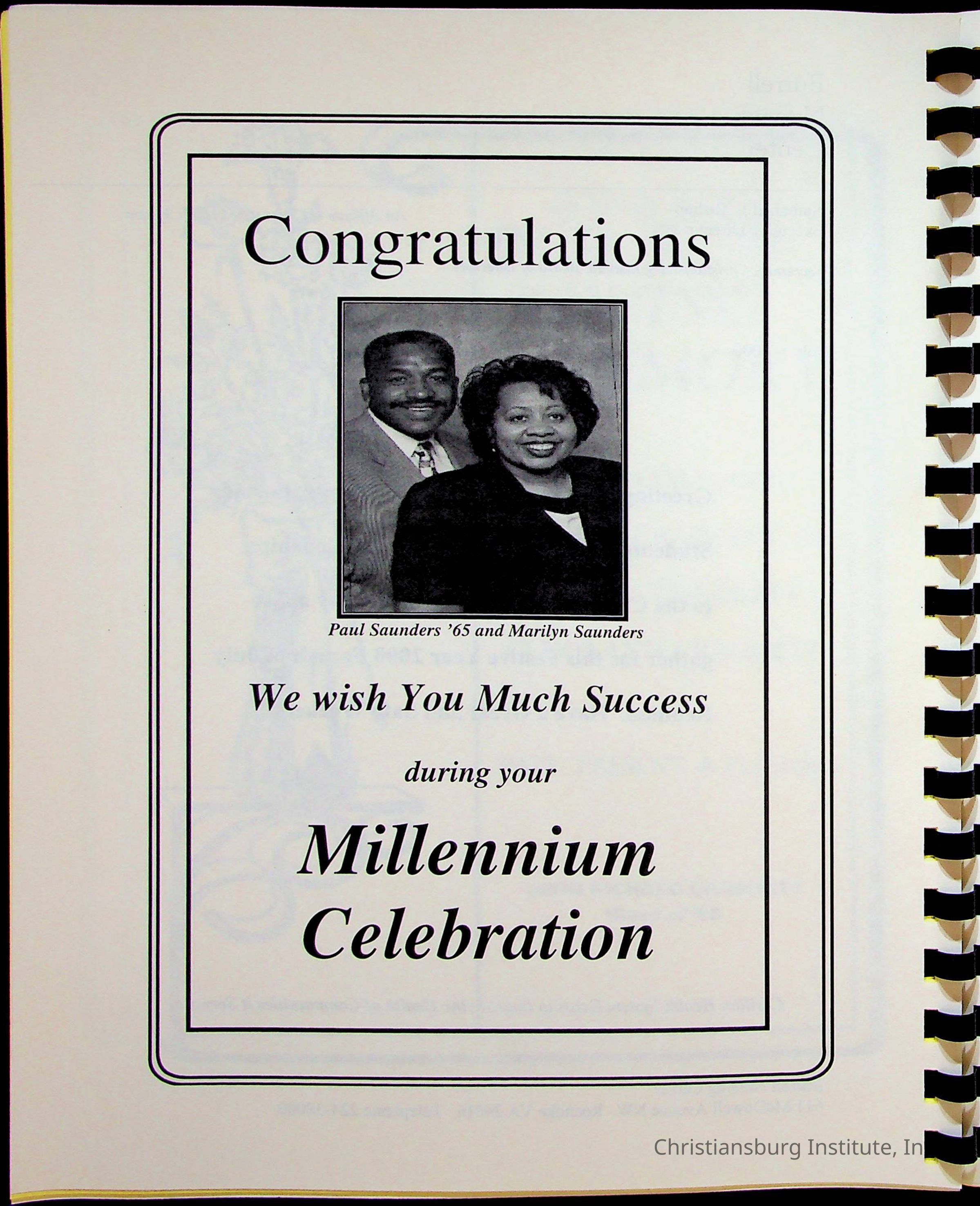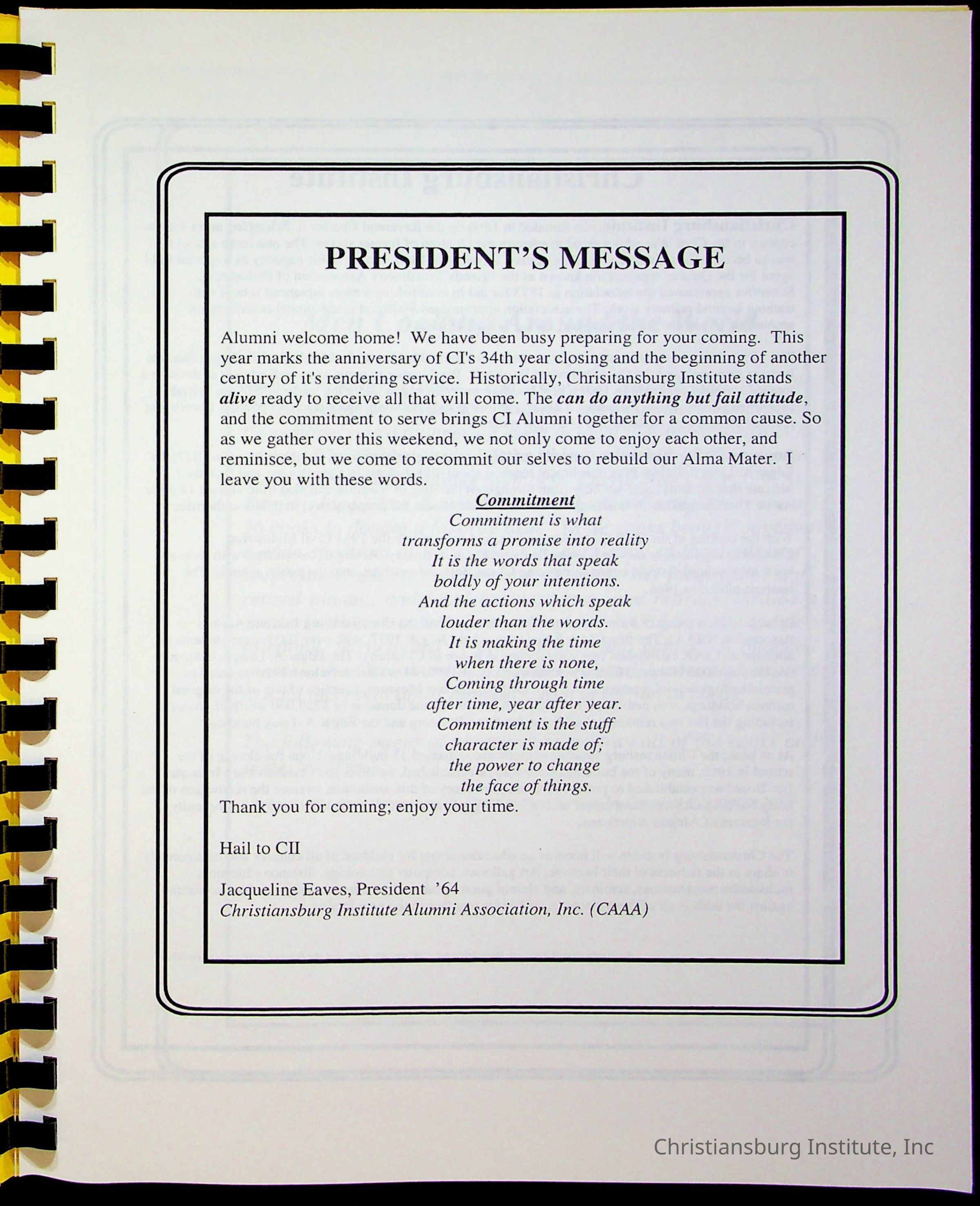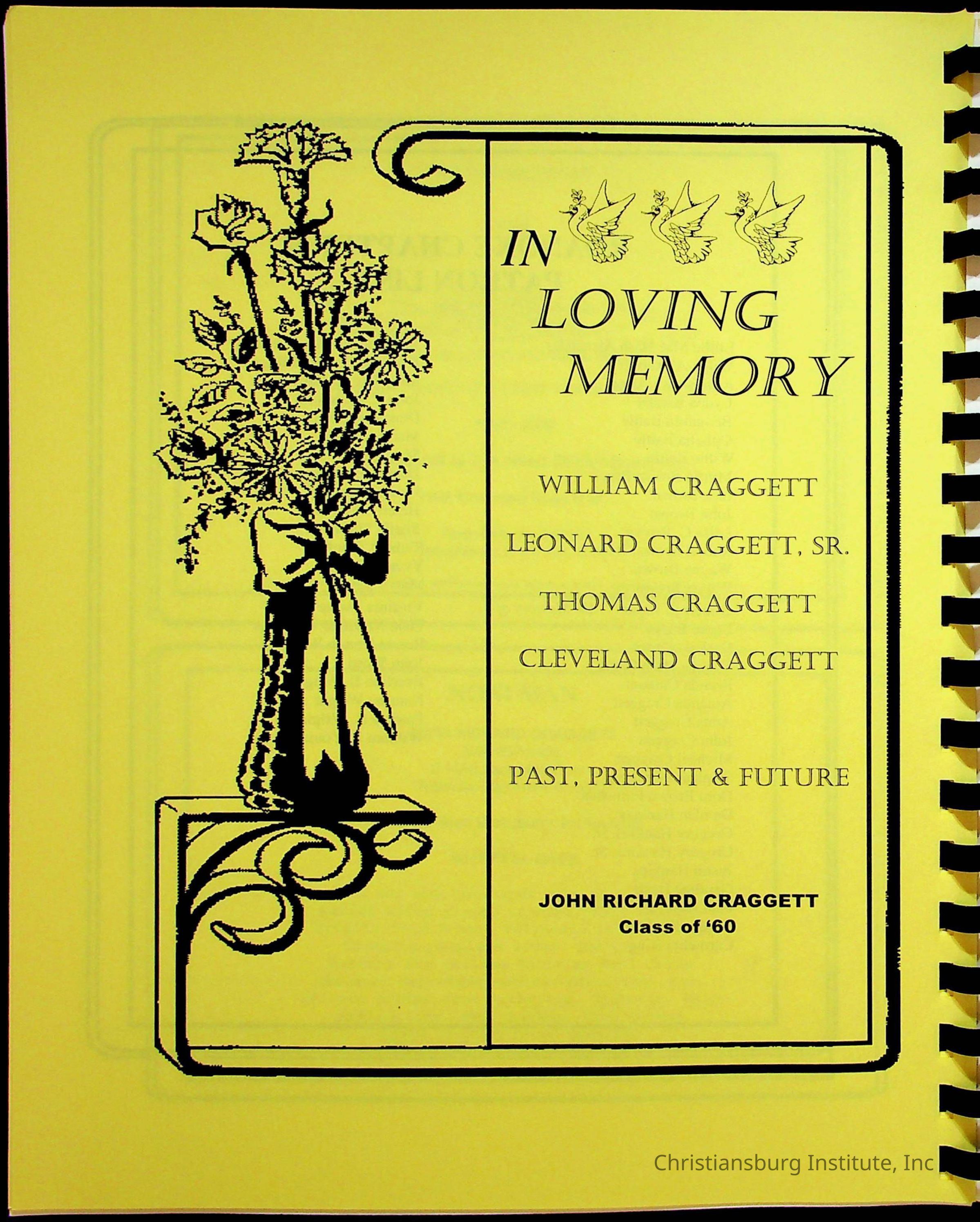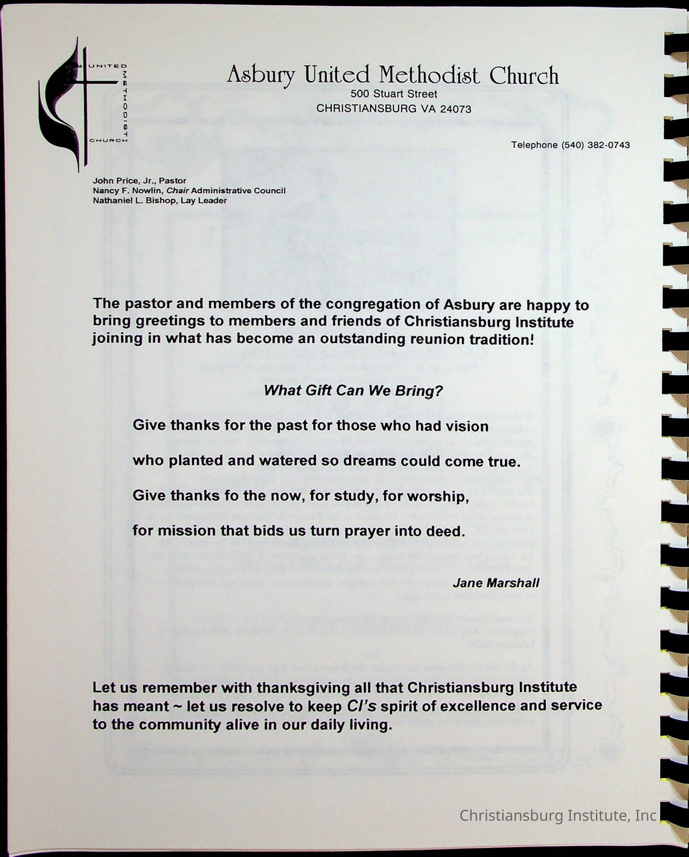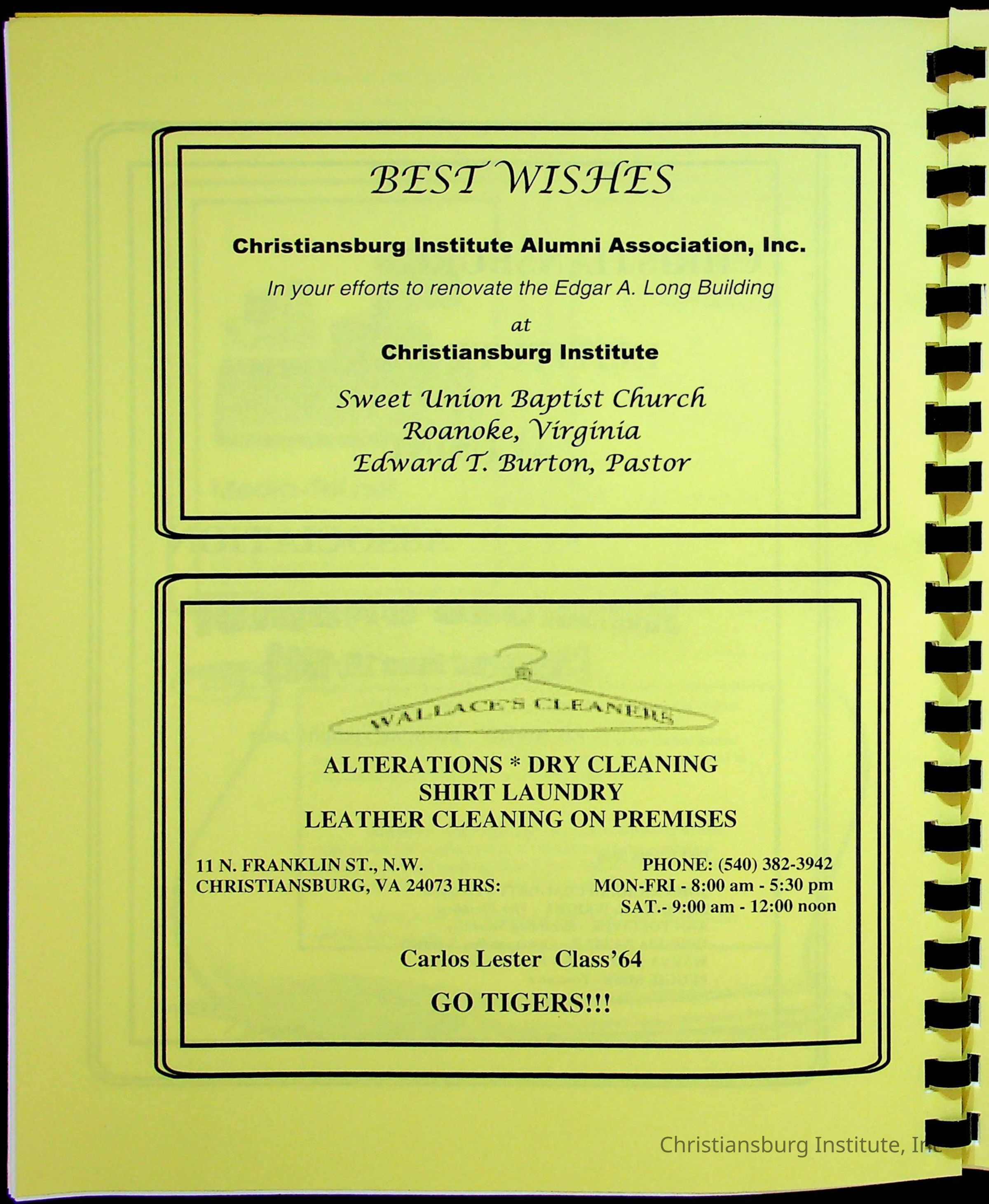 The official program and souvenir book for the Christiansburg Institute Alumni Association reunion that took place on July 1st-2nd 2000 at the Best Western Red Lion Inn in Blacksburg, Virginia.