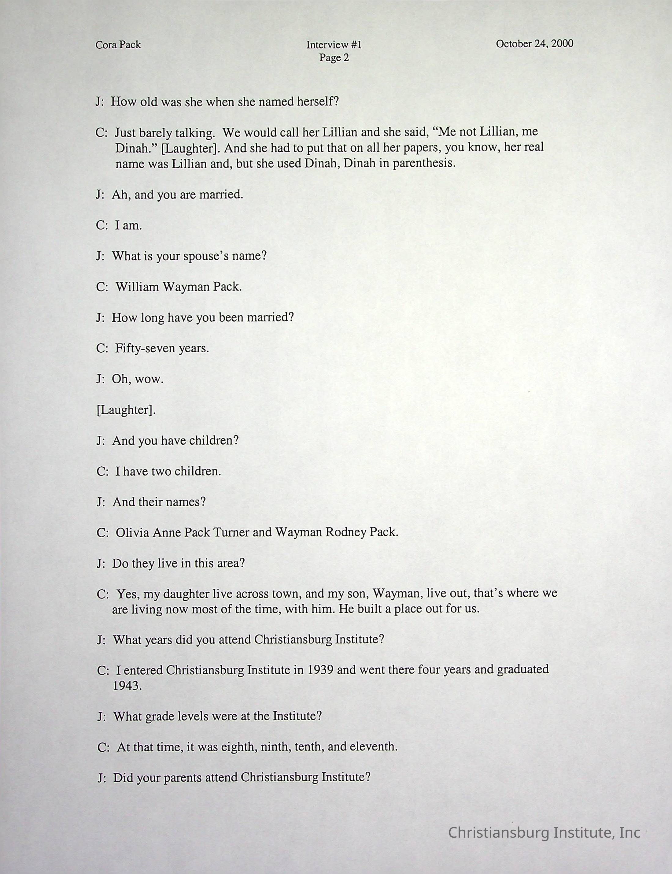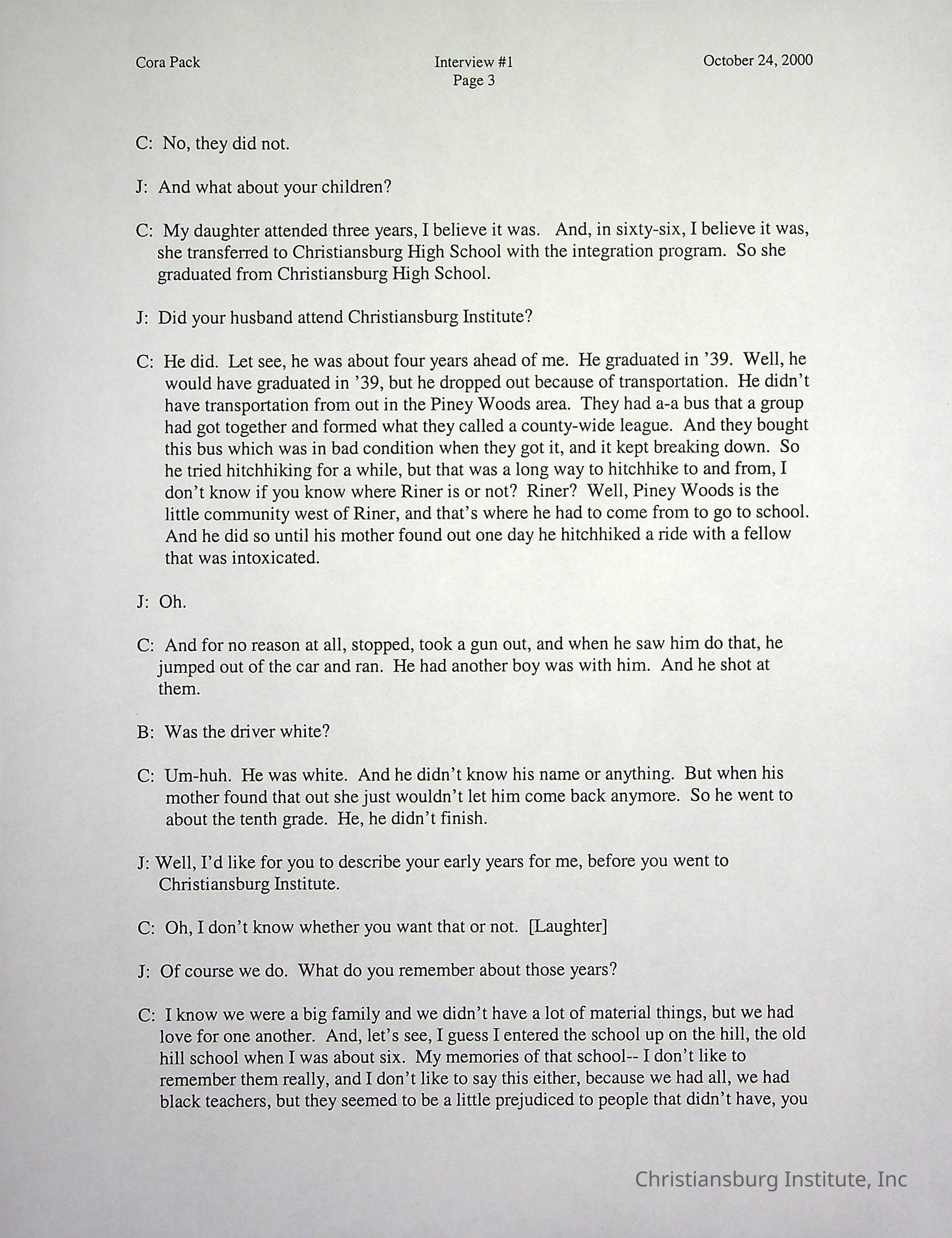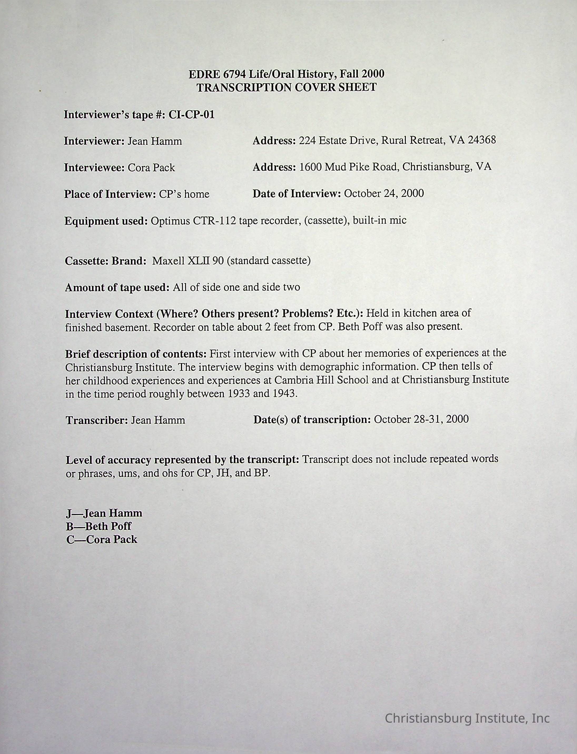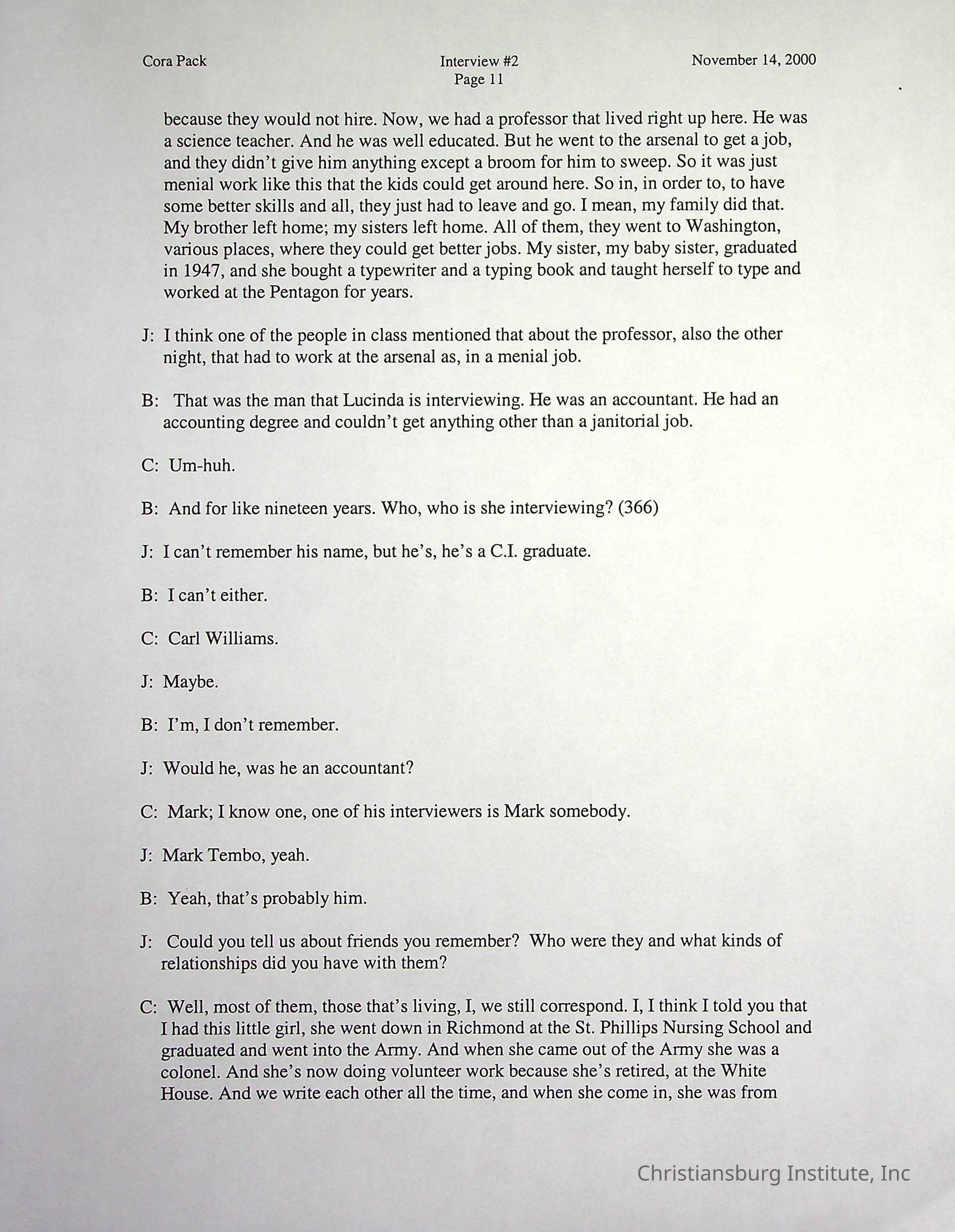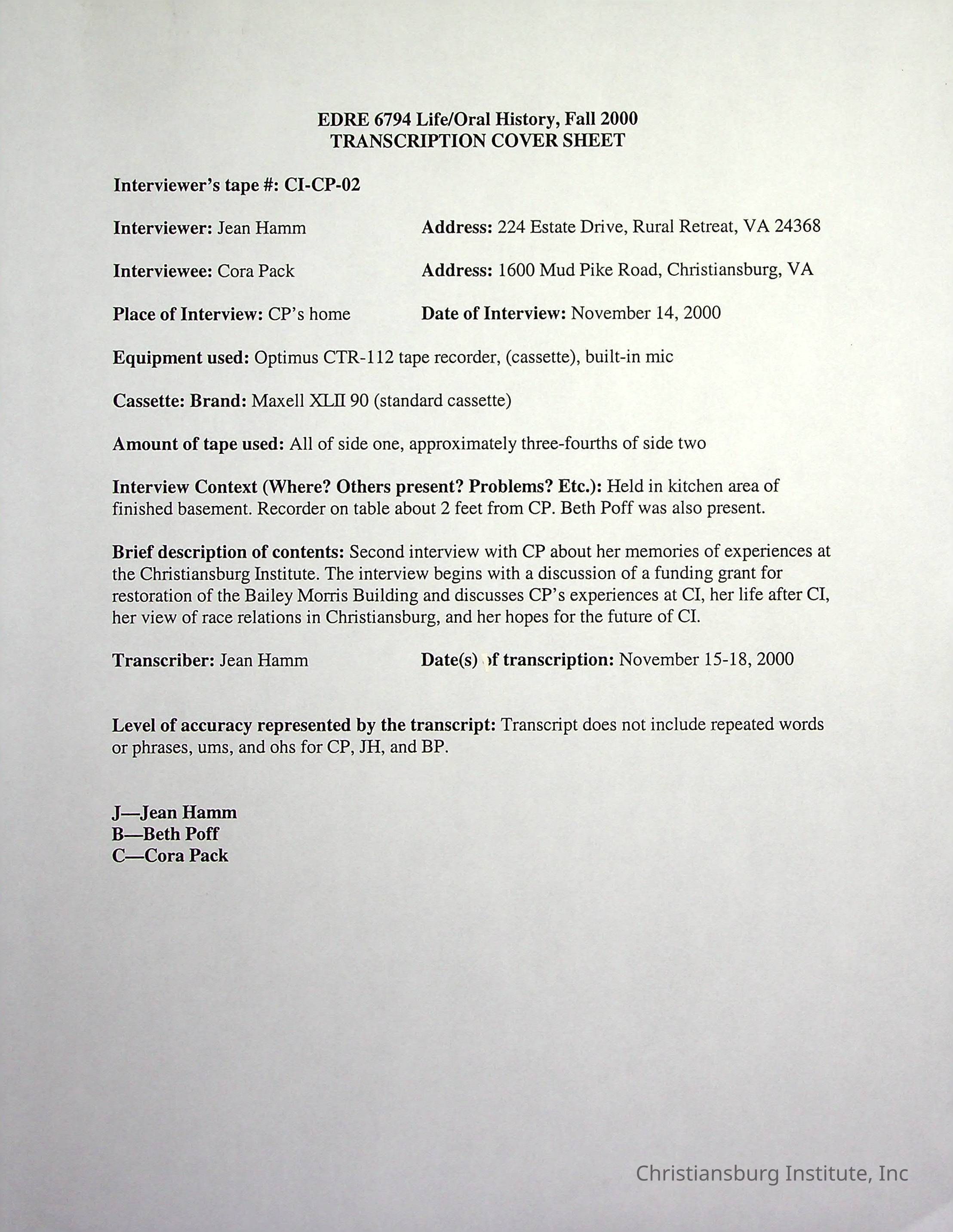 Two oral histories with Christiansburg Institute alumni, Cora Pack conducted by Jean Hamm on October 24th, 2000 and November 14th, 2000.Creator