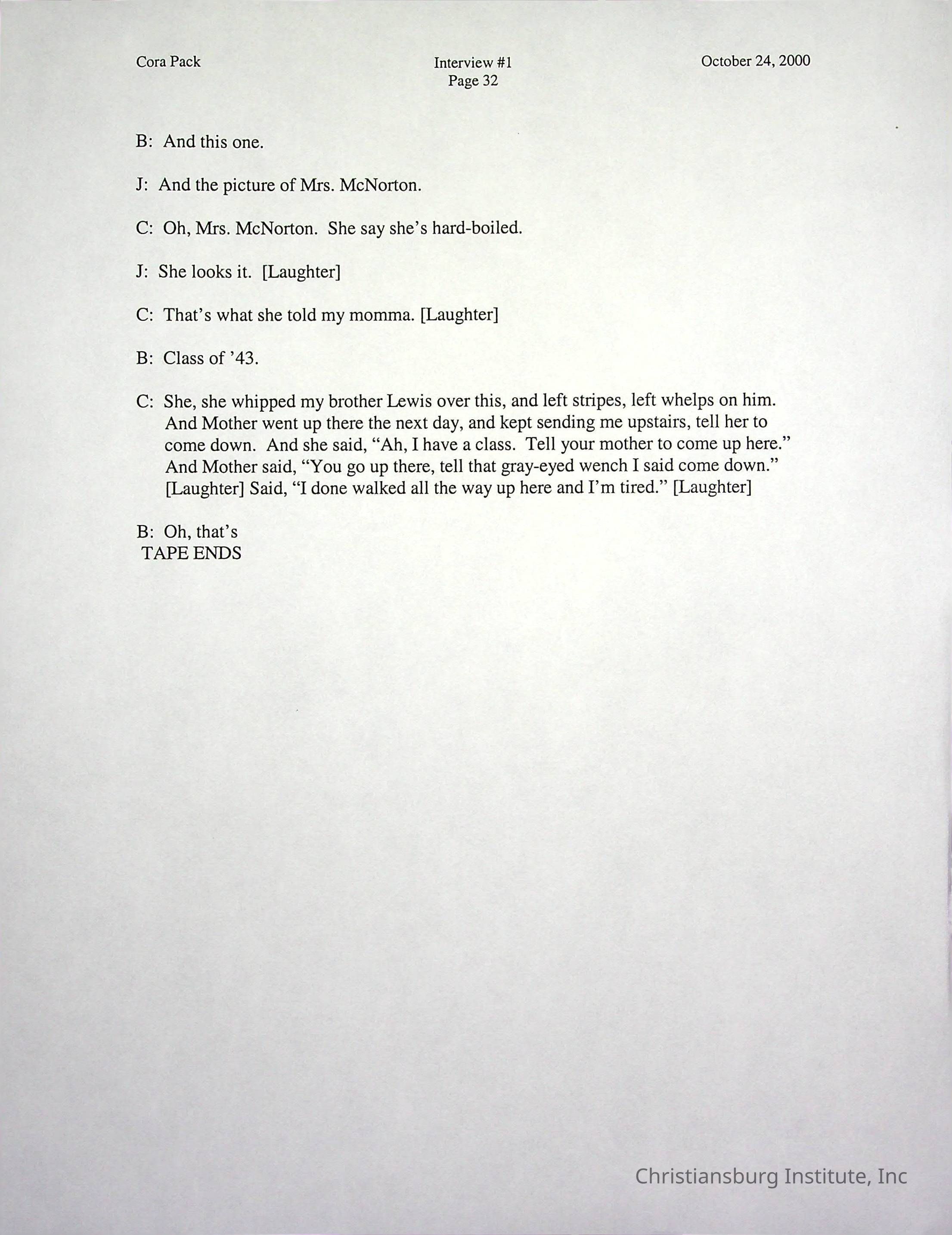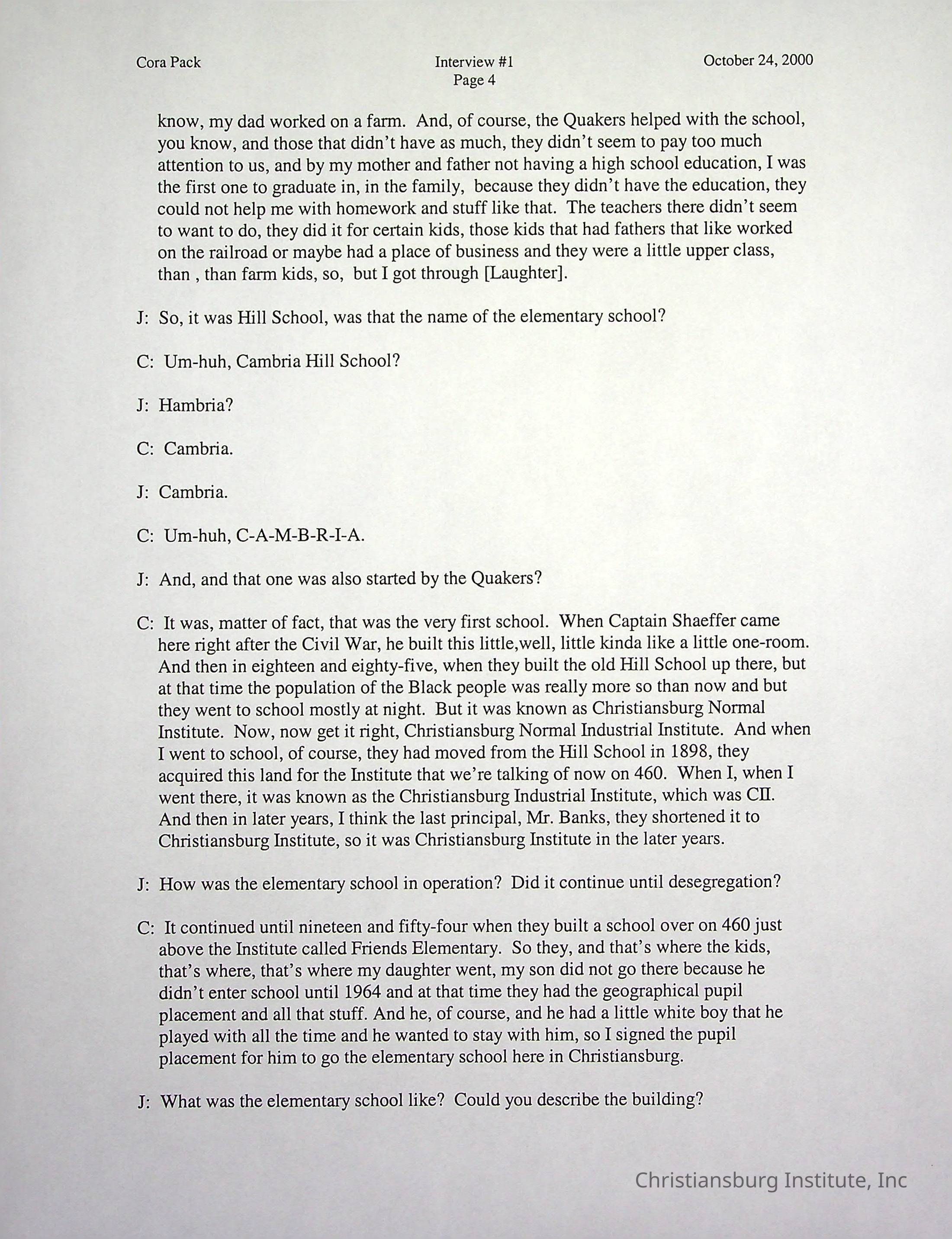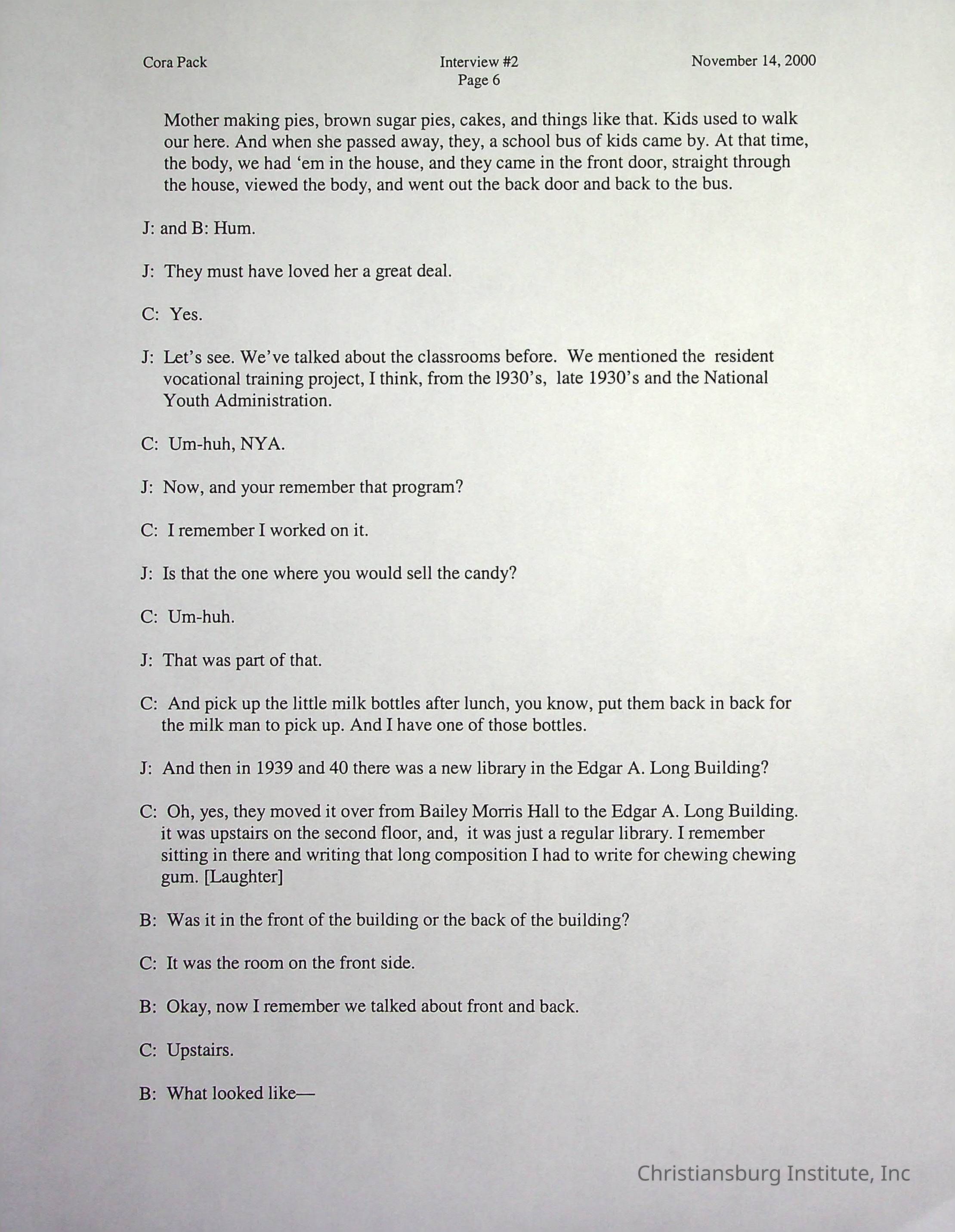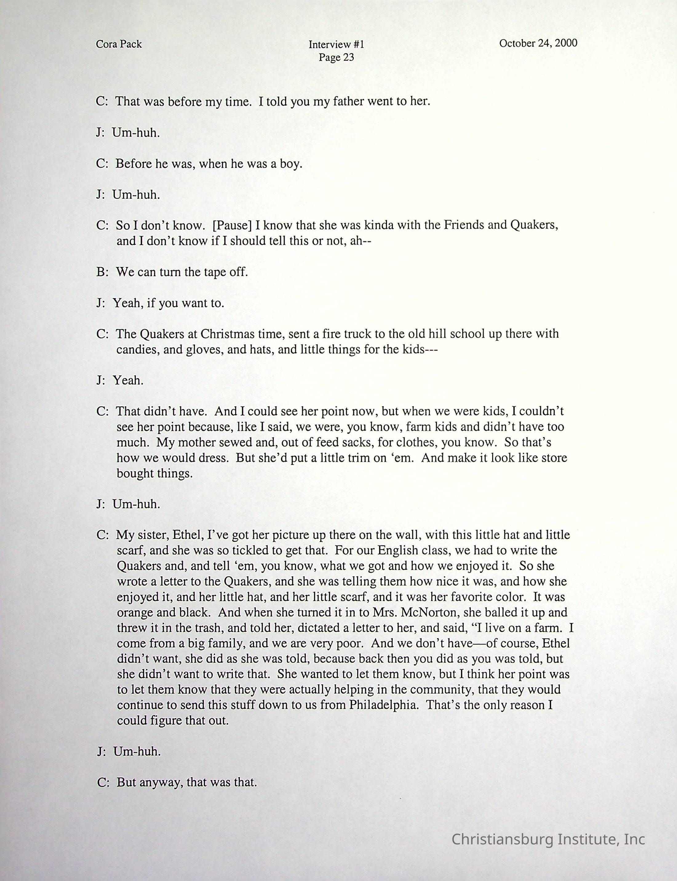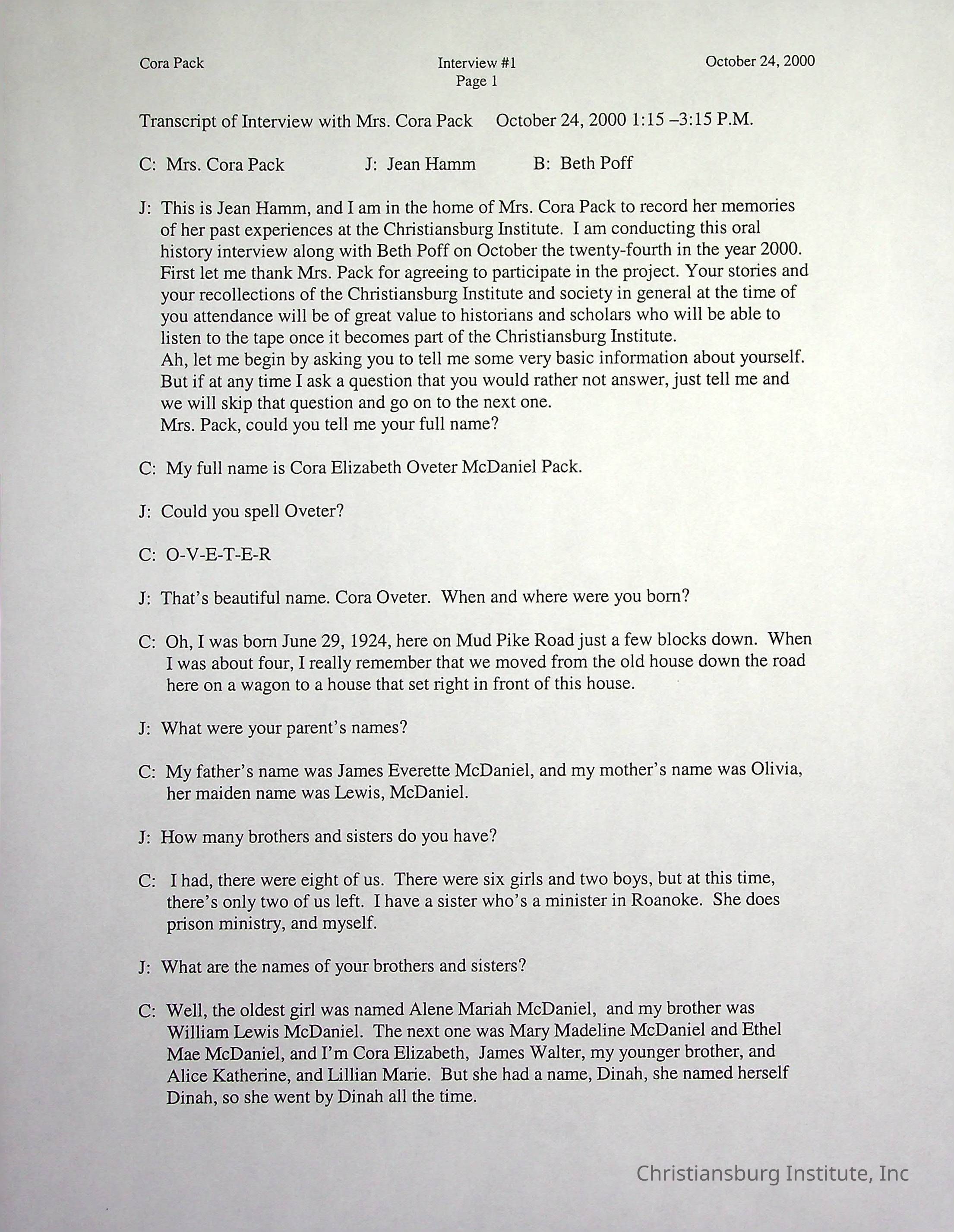 Two oral histories with Christiansburg Institute alumni, Cora Pack conducted by Jean Hamm on October 24th, 2000 and November 14th, 2000.Creator