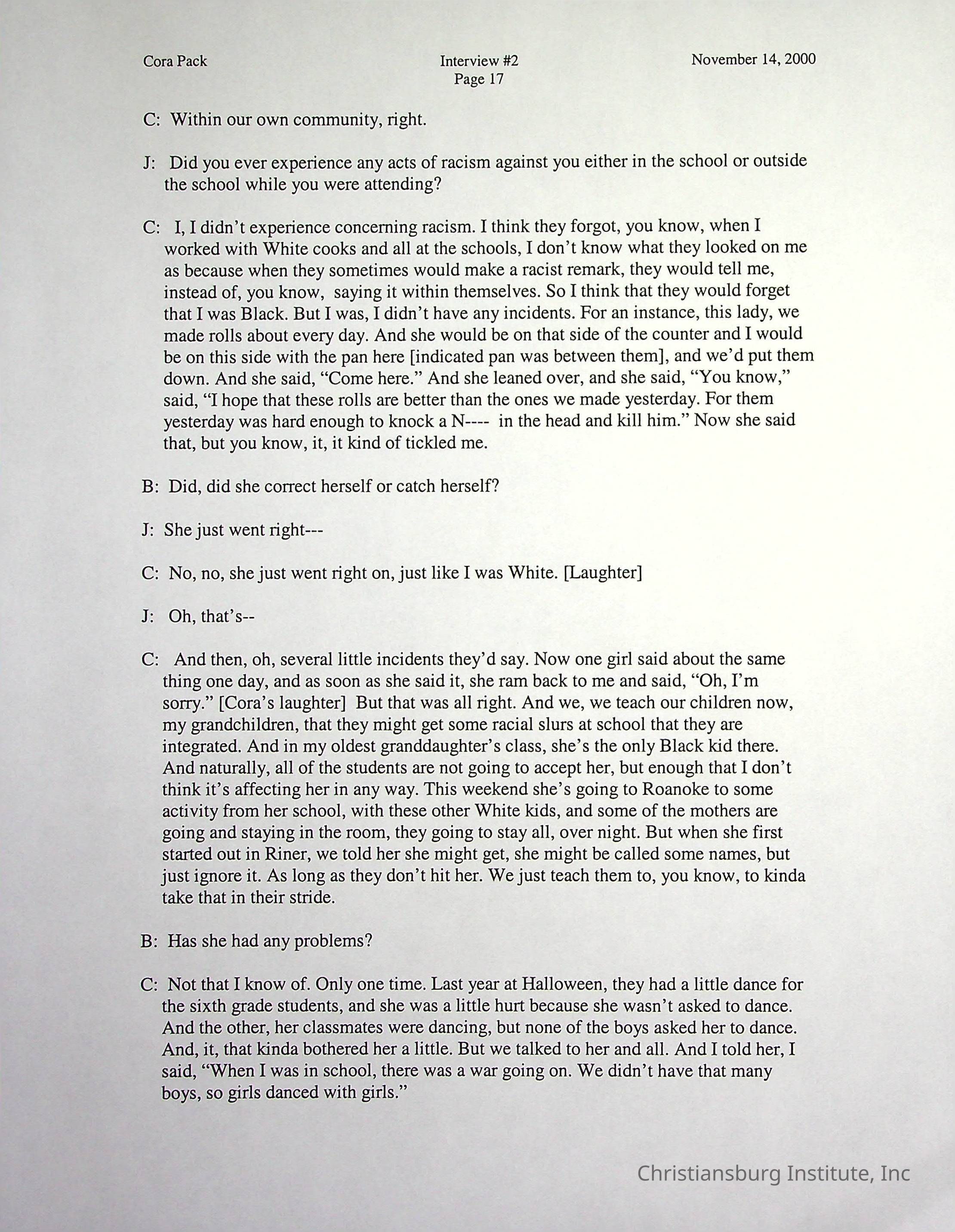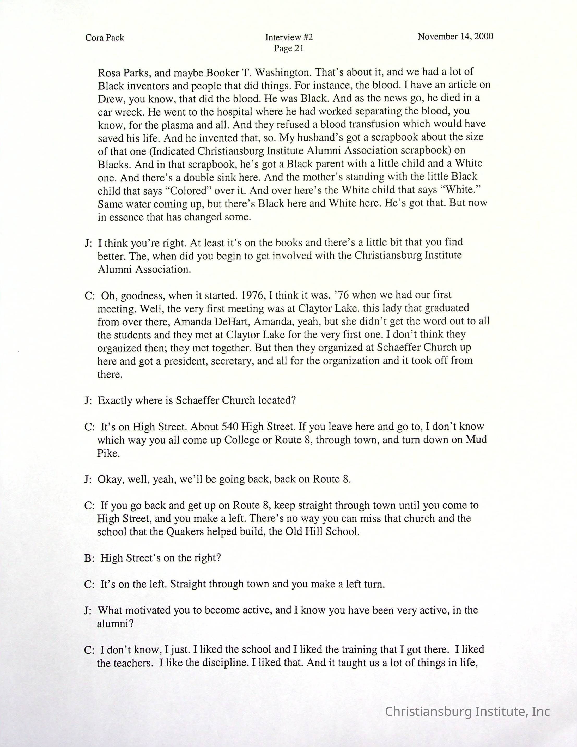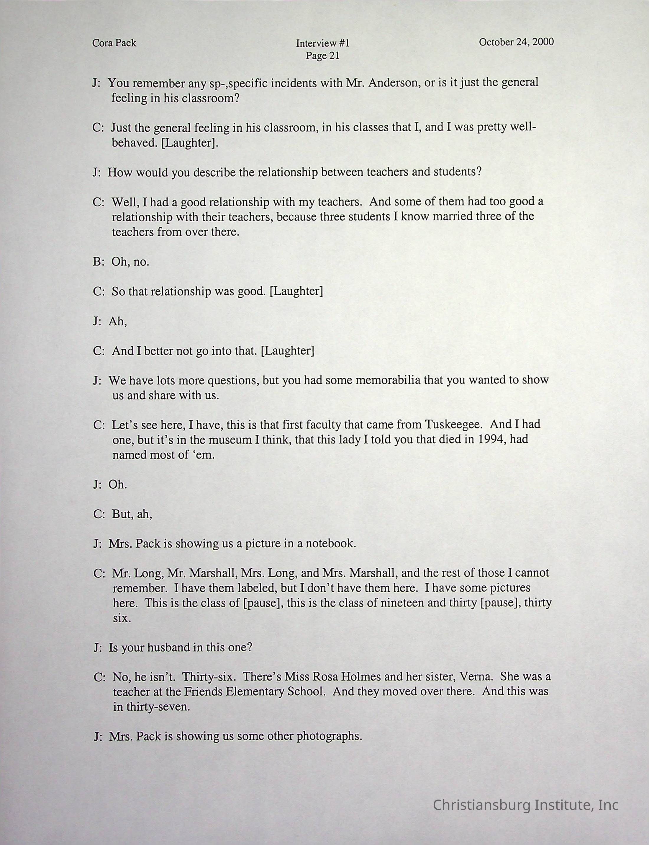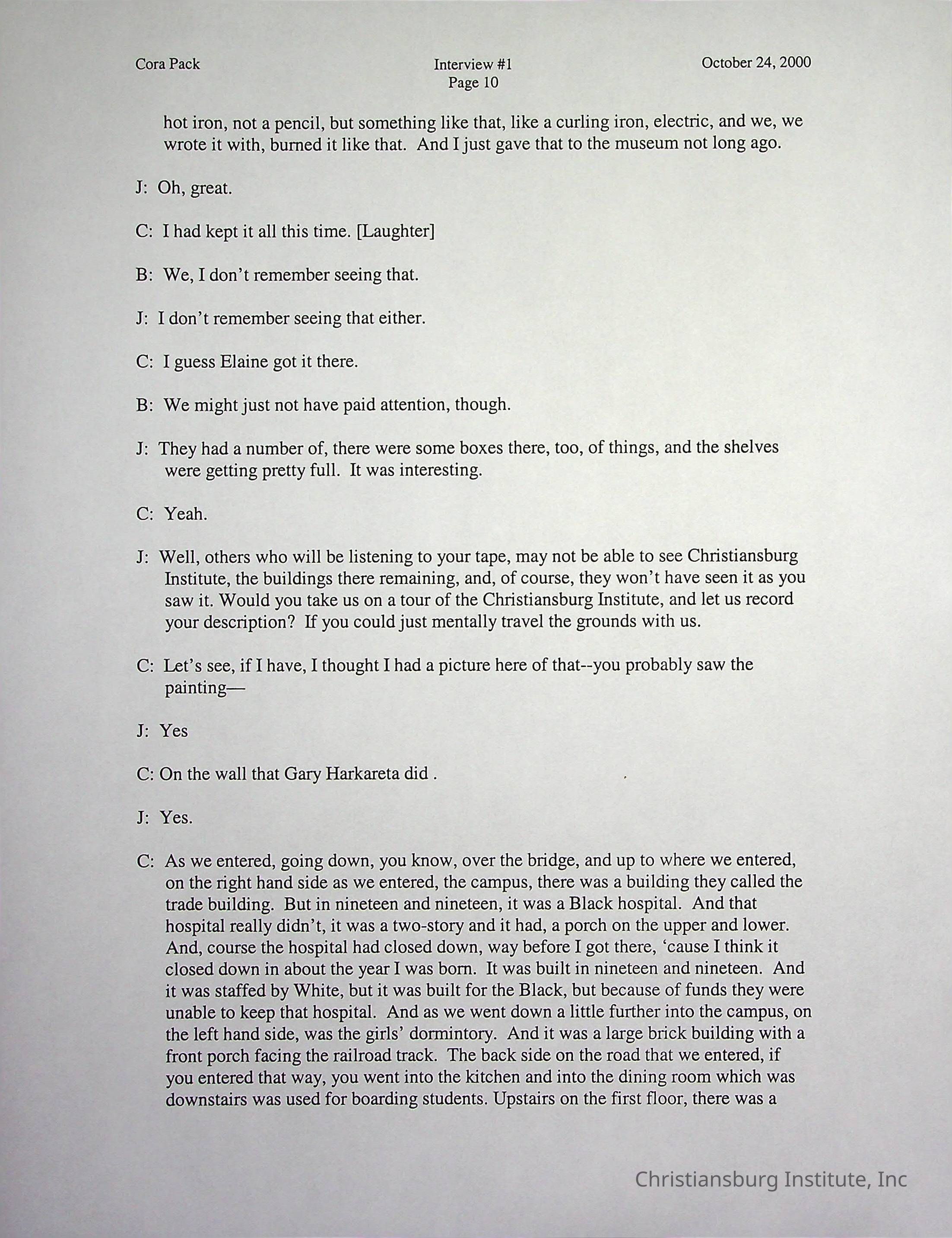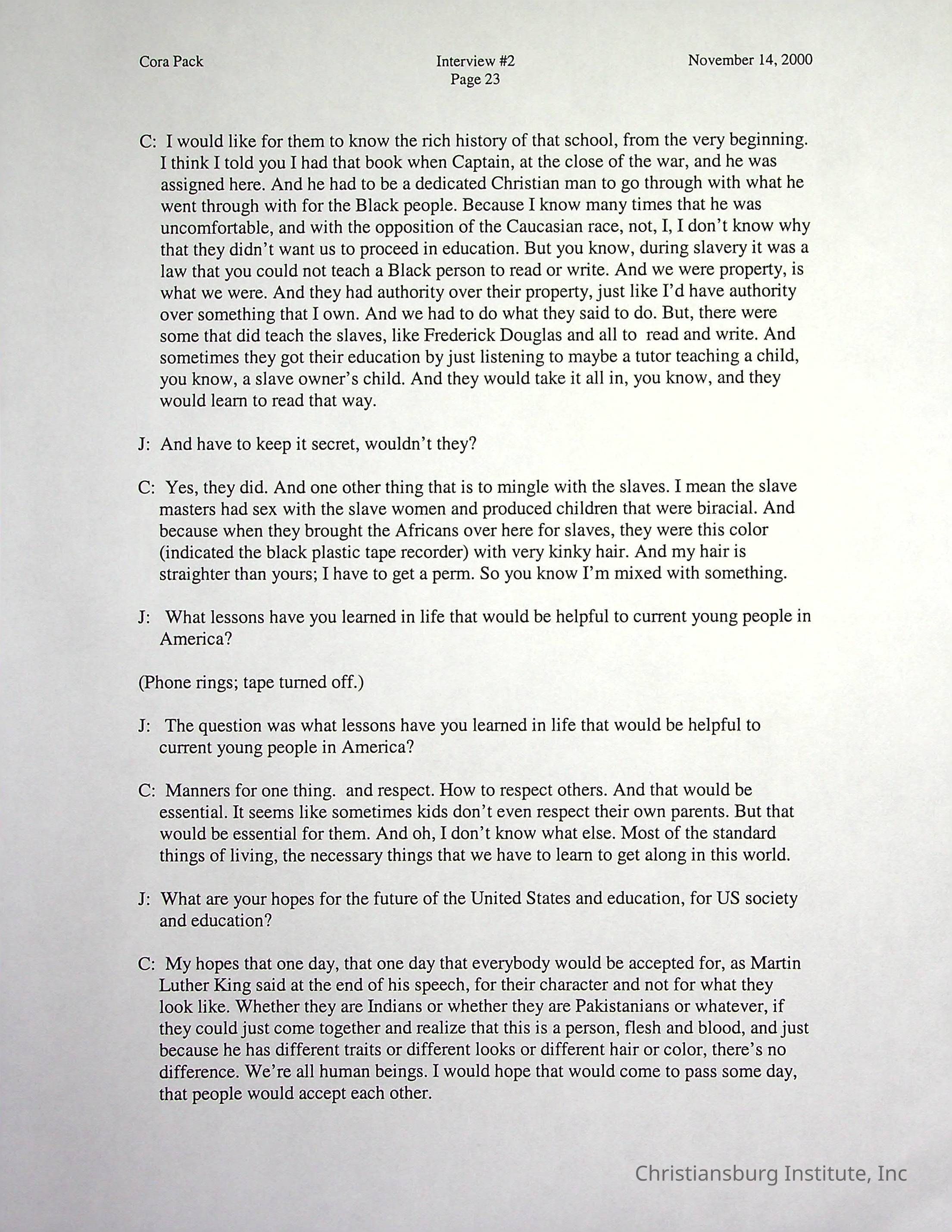 Two oral histories with Christiansburg Institute alumni, Cora Pack conducted by Jean Hamm on October 24th, 2000 and November 14th, 2000.Creator