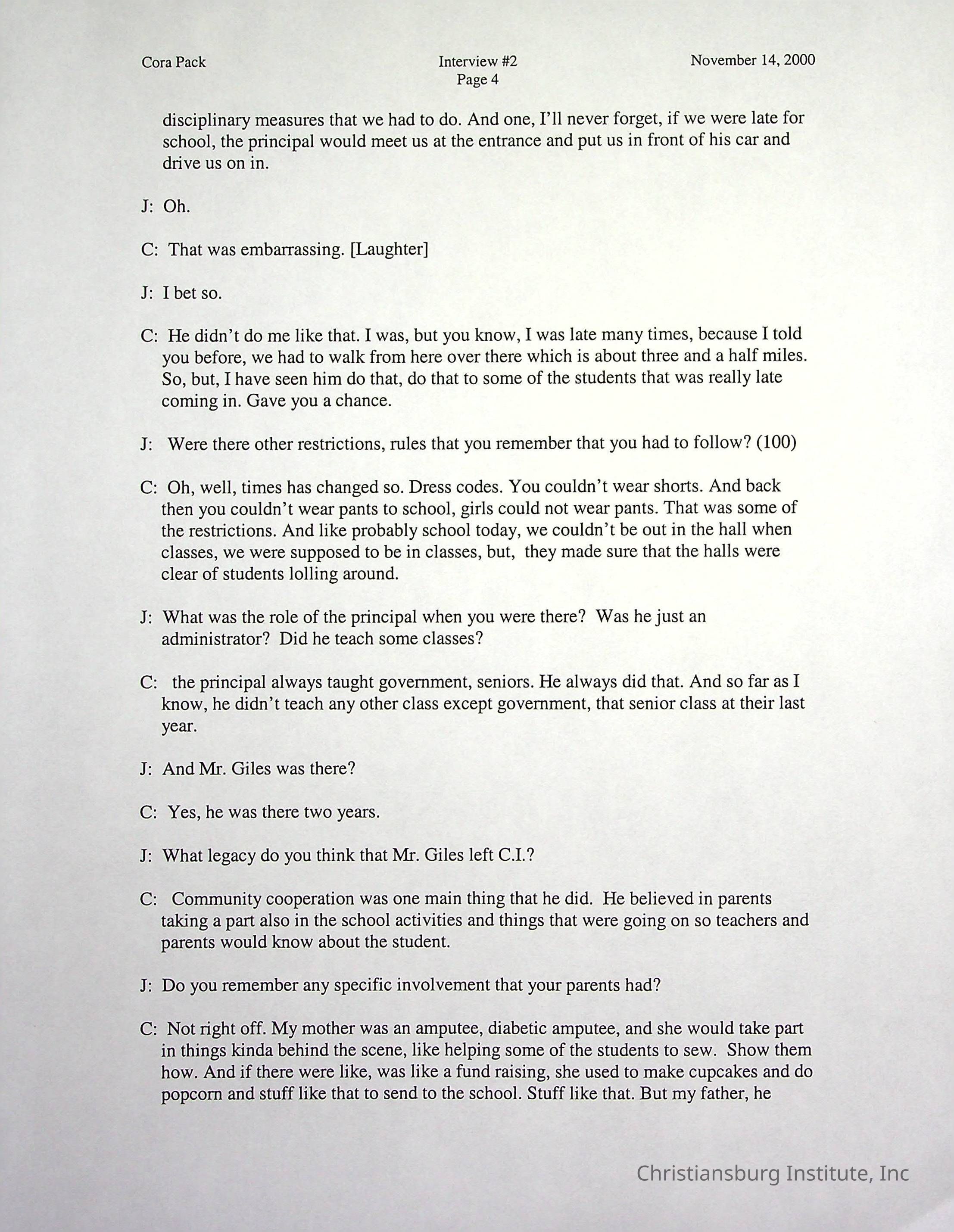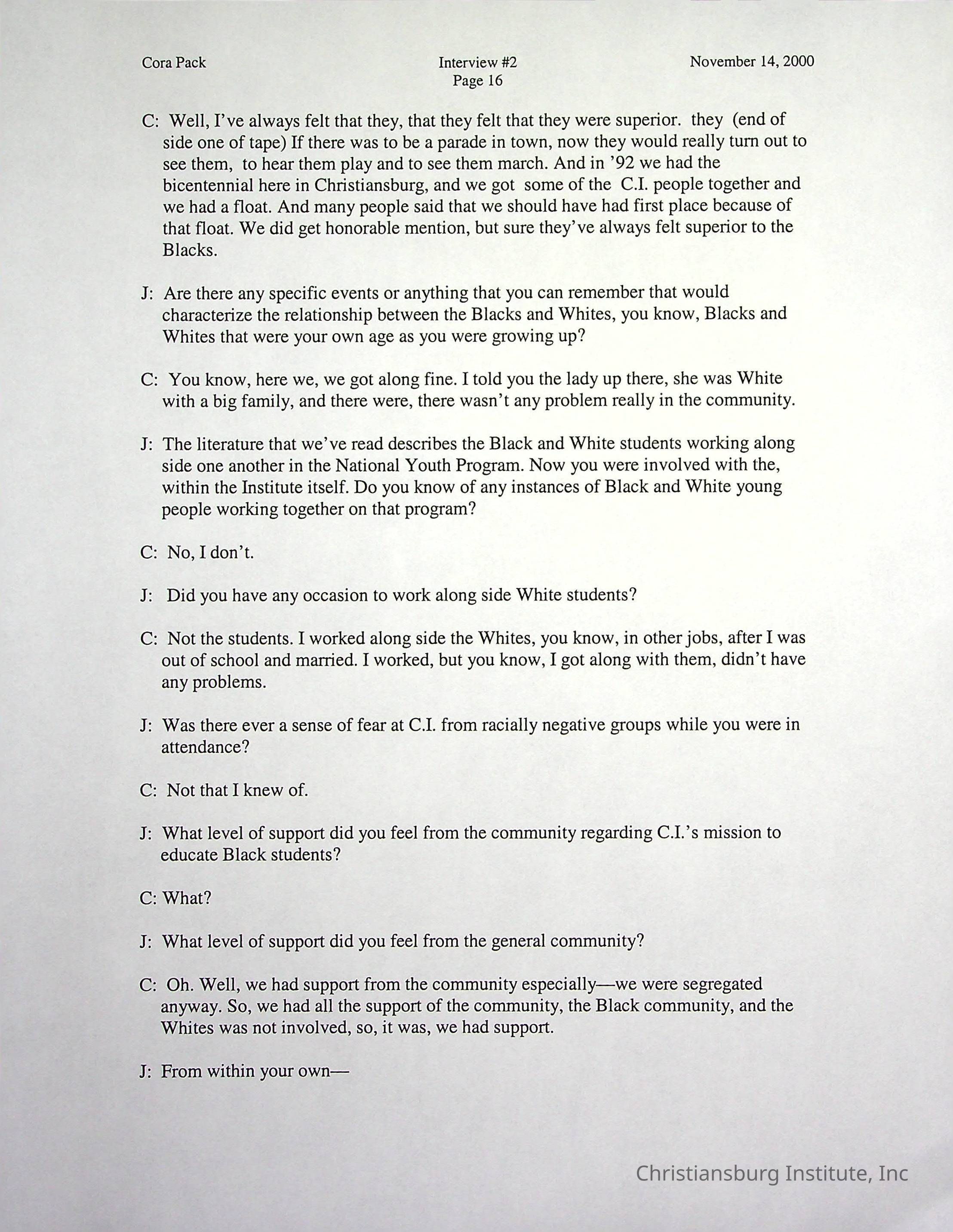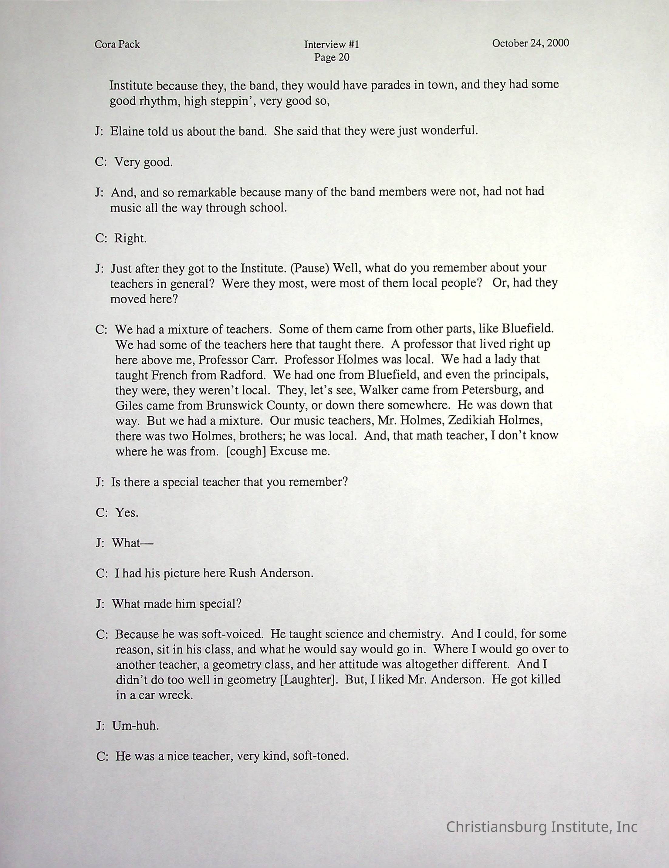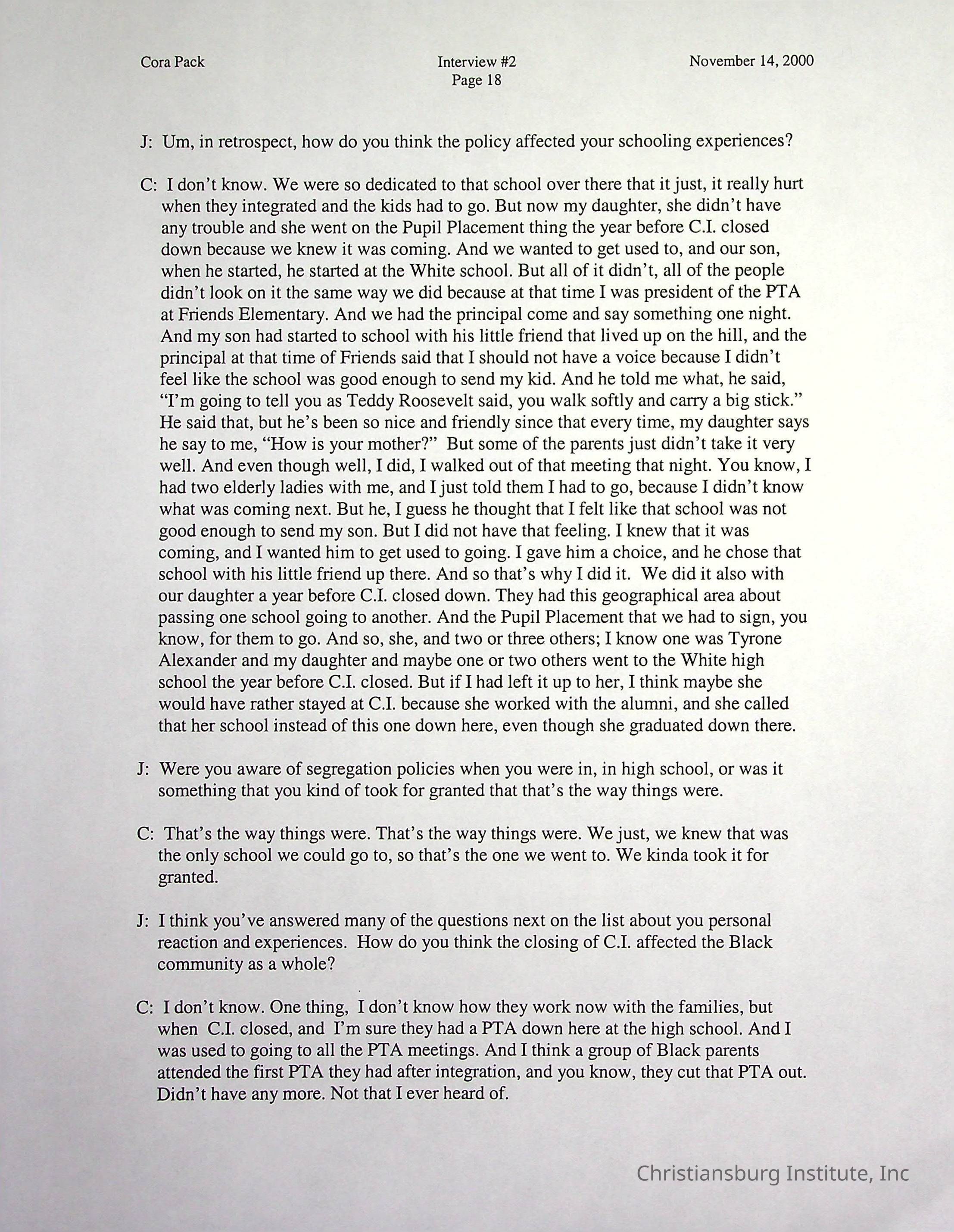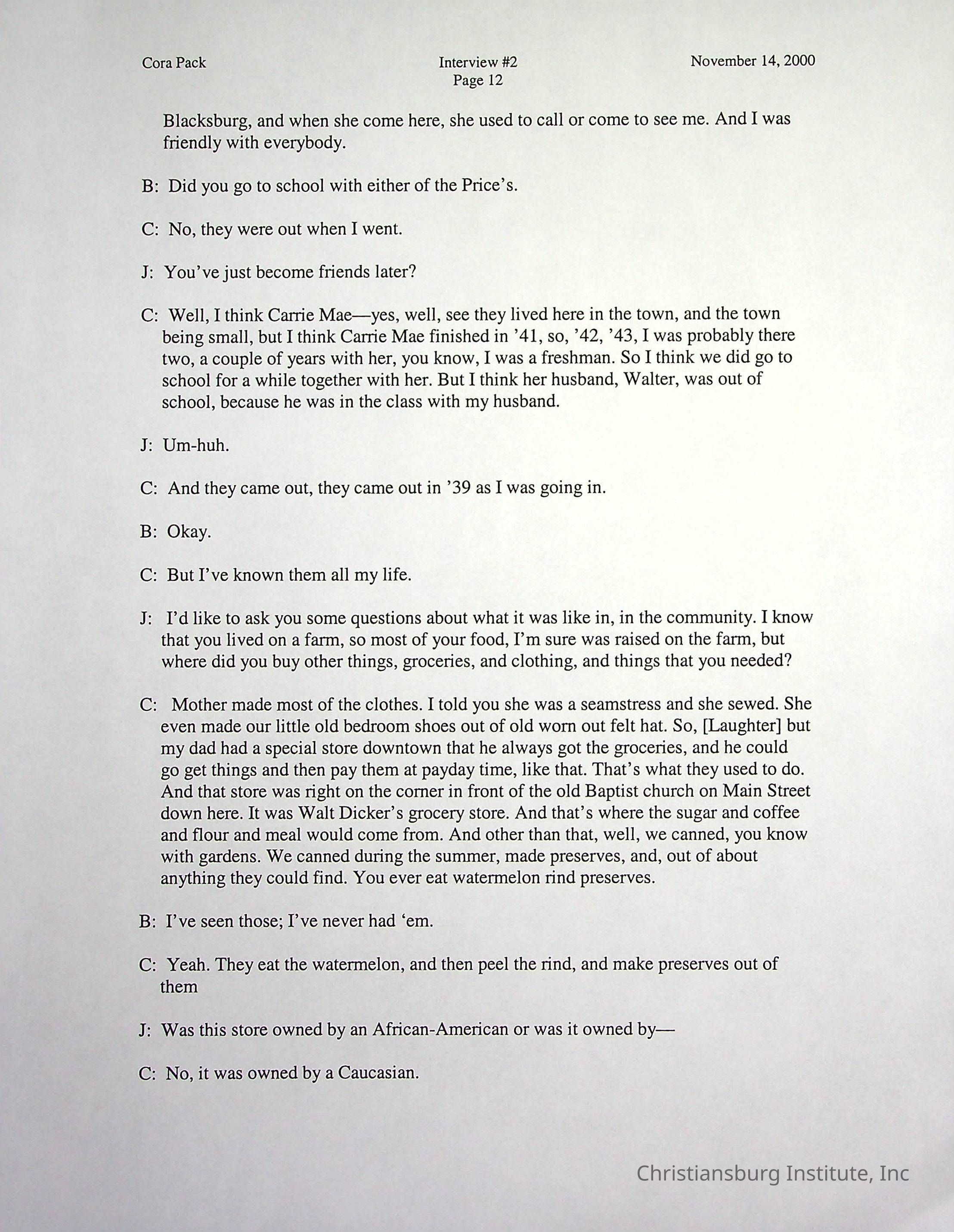 Two oral histories with Christiansburg Institute alumni, Cora Pack conducted by Jean Hamm on October 24th, 2000 and November 14th, 2000.Creator
